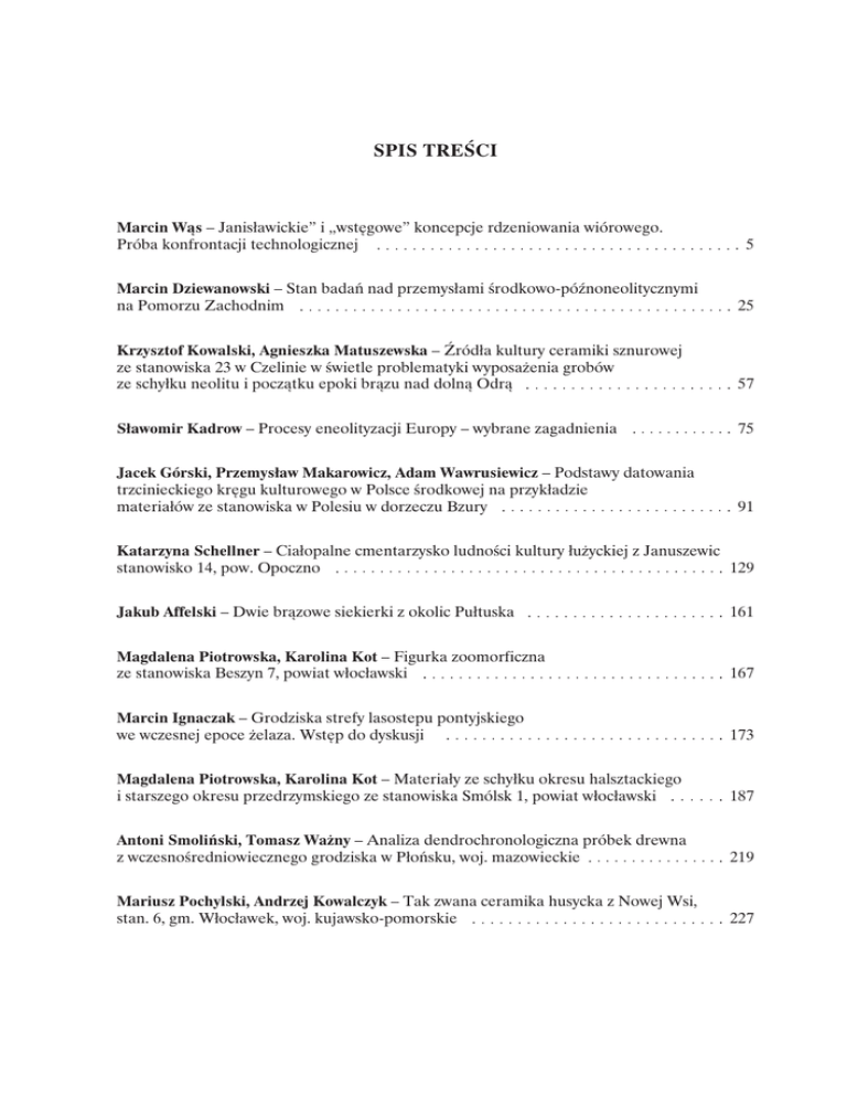 SPIS TREŒCI Marcin W¹s – Janis³awickie” i „wstêgowe” koncepcje rdzeniowania wiórowego. Próba konfrontacji technologicznej 5 Marcin Dziewanowski – Stan badañ nad przemys³ami œrodkowo-póŸnoneolitycznymi na Pomorzu Zachodnim 25 Krzysztof Kowalski, Agnieszka Matuszewska – ród³a kultury ceramiki sznurowej ze stanowiska 23 w Czelinie w œwietle problematyki wyposa¿enia grobów ze schy³ku neolitu i pocz¹tku epoki br¹zu nad doln¹ Odr¹ 57 S³awomir Kadrow – Procesy eneolityzacji Europy – wybrane zagadnienia 75 Jacek Górski, Przemys³aw Makarowicz, Adam Wawrusiewicz – Podstawy datowania trzcinieckiego krêgu kulturowego w Polsce œrodkowej na przyk³adzie materia³ów ze stanowiska w Polesiu w dorzeczu Bzury 91 Katarzyna Schellner – Cia³opalne cmentarzysko ludnoœci kultury ³u¿yckiej z Januszewic stanowisko 14, pow. Opoczno 129 Jakub Affelski – Dwie br¹zowe siekierki z okolic Pu³tuska 161 Magdalena Piotrowska, Karolina Kot – Figurka zoomorficzna ze stanowiska Beszyn 7, powiat w³oc³awski 167 Marcin Ignaczak – Grodziska strefy lasostepu pontyjskiego we wczesnej epoce ¿elaza. Wstêp do dyskusji 173 Magdalena Piotrowska, Karolina Kot – Materia³y ze schy³ku okresu halsztackiego i starszego okresu przedrzymskiego ze stanowiska Smólsk 1, powiat w³oc³awski 187 Antoni Smoliñski, Tomasz Wa¿ny – Analiza dendrochronologiczna próbek drewna z wczesnoœredniowiecznego grodziska w P³oñsku, woj. mazowieckie 219 Mariusz Pochylski, Andrzej Kowalczyk – Tak zwana ceramika husycka z Nowej Wsi, stan. 6, gm. W³oc³awek, woj. kujawsko-pomorskie 227