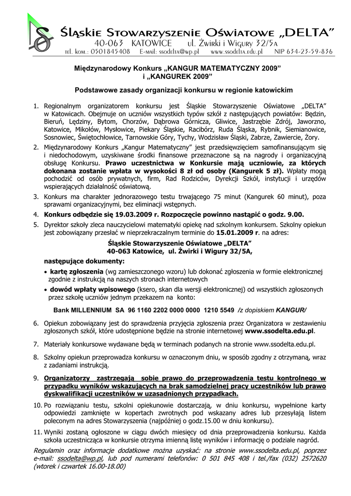 Śląskie Stowarzyszenie Stowarzyszenie Oświatowe „DELTA” „DELTA” 40-063 KATOWICE tel. kom.: 0501845408 ul. Żwirki i Wigury 32/5a E-mail: [email protected] www.ssodelta.edu.pl NIP 634-23-59-836 Międzynarodowy Konkurs „KANGUR MATEMATYCZNY 2009” i „KANGUREK 2009” Podstawowe zasady organizacji konkursu w regionie katowickim 1. Regionalnym organizatorem konkursu jest Śląskie Stowarzyszenie Oświatowe „DELTA” w Katowicach. Obejmuje on uczniów wszystkich typów szkół z następujących powiatów: Będzin, Bieruń, Lędziny, Bytom, Chorzów, Dąbrowa Górnicza, Gliwice, Jastrzębie Zdrój, Jaworzno, Katowice, Mikołów, Mysłowice, Piekary Śląskie, Racibórz, Ruda Śląska, Rybnik, Siemianowice, Sosnowiec, Świętochłowice, Tarnowskie Góry, Tychy, Wodzisław Śląski, Zabrze, Zawiercie, Żory. 2. Międzynarodowy Konkurs „Kangur Matematyczny” jest przedsięwzięciem samofinansującym się i niedochodowym, uzyskiwane środki finansowe przeznaczone są na nagrody i organizacyjną obsługę Konkursu. Prawo uczestnictwa w Konkursie mają uczniowie, za których dokonana zostanie wpłata w wysokości 8 zł od osoby (Kangurek 5 zł). Wpłaty mogą pochodzić od osób prywatnych, firm, Rad Rodziców, Dyrekcji Szkół, instytucji i urzędów wspierających działalność oświatową. 3. Konkurs ma charakter jednorazowego testu trwającego 75 minut (Kangurek 60 minut), poza sprawami organizacyjnymi, bez eliminacji wstępnych. 4. Konkurs odbędzie się 19.03.2009 r. Rozpoczęcie powinno nastąpić o godz. 9.00. 5. Dyrektor szkoły zleca nauczycielowi matematyki opiekę nad szkolnym konkursem. Szkolny opiekun jest zobowiązany przesłać w nieprzekraczalnym terminie do 15.01.2009 r. na adres: Śląskie Stowarzyszenie Oświatowe „DELTA” 40-063 Katowice, ul. Żwirki i Wigury 32/5A, następujące dokumenty: • kartę zgłoszenia (wg zamieszczonego wzoru) lub dokonać zgłoszenia w formie elektronicznej zgodnie z instrukcją na naszych stronach internetowych • dowód wpłaty wpisowego (ksero, skan dla wersji elektronicznej) od wszystkich zgłoszonych przez szkołę uczniów jednym przekazem na konto: Bank MILLENNIUM SA 96 1160 2202 0000 0000 1210 5549 /z dopiskiem KANGUR/ 6. Opiekun zobowiązany jest do sprawdzenia przyjęcia zgłoszenia przez Organizatora w zestawieniu zgłoszonych szkół, które udostępnione będzie na stronie internetowej www.ssodelta.edu.pl. 7. Materiały konkursowe wydawane będą w terminach podanych na stronie www.ssodelta.edu.pl. 8. Szkolny opiekun przeprowadza konkursu w oznaczonym dniu, w sposób zgodny z otrzymaną, wraz z zadaniami instrukcją. 9. Organizatorzy zastrzegają sobie prawo do przeprowadzenia testu kontrolnego w przypadku wyników wskazujących na brak samodzielnej pracy uczestników lub prawo dyskwalifikacji uczestników w uzasadnionych przypadkach. 10. Po rozwiązaniu testu, szkolni opiekunowie dostarczają, w dniu konkursu, wypełnione karty odpowiedzi zamknięte w kopertach zwrotnych pod wskazany adres lub przesyłają listem poleconym na adres Stowarzyszenia (najpóźniej o godz.15.00 w dniu konkursu). 11. Wyniki zostaną ogłoszone w ciągu dwóch miesięcy od dnia przeprowadzenia konkursu. Każda szkoła uczestnicząca w konkursie otrzyma imienną listę wyników i informację o podziale nagród. Regulamin oraz informacje dodatkowe można uzyskać: na stronie www.ssodelta.edu.pl, poprzez e-mail: [email protected], lub pod numerami telefonów: 0 501 845 408 i tel./fax (032) 2572620 (wtorek i czwartek 16.00-18.00)