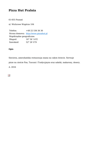 Pizza Hut Pralnia 61-655 Poznań ul. Wichrowe Wzgórze 104 Telefon: +48 22 536 36 36 Strona domowa: http://www.pizzahut.pl Współrzędne geograficzne: Długość 16° 56′ 14″E Szerokość 52° 26′ 0″N Opis Sieciowa, amerykańska restauracja znana na całym świecie. Serwuje pizze na cieście Pan, Tuscani i Tradycyjnym oraz sałatki, makarony, desery. A. 2016