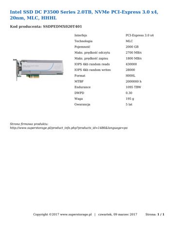 Intel SSD DC P3500 Series 2.0TB, NVMe PCI-Express 3.0 x4, 20nm, MLC, HHHL Kod producenta: SSDPEDMX020T401 Interfejs PCI-Express 3.0 x4 Technologia MLC Pojemność 2000 GB Maks. prędkość odczytu 2700 MB/s Maks. prędkość zapisu 1800 MB/s IOPS 4kb random reads 430000 IOPS 4kb random writes 28000 Format HHHL MTBF 2000000 h Endurance 1095 TBW DWPD 0.30 Waga 195 g Gwarancja 5 lat Strona firmowa produktu: http://www.superstorage.pl/product_info.php?products_id=1486&language=po Copyright ©2017 www.superstorage.pl | czwartek, 09 marzec 2017 Strona: 1 / 1