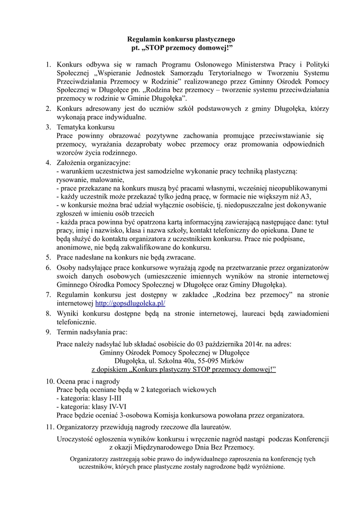 Regulamin konkursu plastycznego pt. „STOP przemocy domowej!” 1. Konkurs odbywa się w ramach Programu Osłonowego Ministerstwa Pracy i Polityki Społecznej „Wspieranie Jednostek Samorządu Terytorialnego w Tworzeniu Systemu Przeciwdziałania Przemocy w Rodzinie” realizowanego przez Gminny Ośrodek Pomocy Społecznej w Długołęce pn. „Rodzina bez przemocy – tworzenie systemu przeciwdziałania przemocy w rodzinie w Gminie Długołęka”. 2. Konkurs adresowany jest do uczniów szkół podstawowych z gminy Długołęka, którzy wykonają prace indywidualne. 3. Tematyka konkursu Prace powinny obrazować pozytywne zachowania promujące przeciwstawianie się przemocy, wyrażania dezaprobaty wobec przemocy oraz promowania odpowiednich wzorców życia rodzinnego. 4. Założenia organizacyjne: - warunkiem uczestnictwa jest samodzielne wykonanie pracy techniką plastyczną: rysowanie, malowanie, - prace przekazane na konkurs muszą być pracami własnymi, wcześniej nieopublikowanymi - każdy uczestnik może przekazać tylko jedną pracę, w formacie nie większym niż A3, - w konkursie można brać udział wyłącznie osobiście, tj. niedopuszczalne jest dokonywanie zgłoszeń w imieniu osób trzecich - każda praca powinna być opatrzona kartą informacyjną zawierającą następujące dane: tytuł pracy, imię i nazwisko, klasa i nazwa szkoły, kontakt telefoniczny do opiekuna. Dane te będą służyć do kontaktu organizatora z uczestnikiem konkursu. Prace nie podpisane, anonimowe, nie będą zakwalifikowane do konkursu. 5. Prace nadesłane na konkurs nie będą zwracane. 6. Osoby nadsyłające prace konkursowe wyrażają zgodę na przetwarzanie przez organizatorów swoich danych osobowych (umieszczenie imiennych wyników na stronie internetowej Gminnego Ośrodka Pomocy Społecznej w Długołęce oraz Gminy Długołęka). 7. Regulamin konkursu jest dostępny w zakładce „Rodzina bez przemocy” na stronie internetowej http://gopsdlugoleka.pl/ 8. Wyniki konkursu dostępne będą na stronie internetowej, laureaci będą zawiadomieni telefonicznie. 9. Termin nadsyłania prac: Prace należy nadsyłać lub składać osobiście do 03 października 2014r. na adres: Gminny Ośrodek Pomocy Społecznej w Długołęce Długołęka, ul. Szkolna 40a, 55-095 Mirków z dopiskiem „Konkurs plastyczny STOP przemocy domowej!” 10. Ocena prac i nagrody Prace będą oceniane będą w 2 kategoriach wiekowych - kategoria: klasy I-III - kategoria: klasy IV-VI Prace będzie oceniać 3-osobowa Komisja konkursowa powołana przez organizatora. 11. Organizatorzy przewidują nagrody rzeczowe dla laureatów. Uroczystość ogłoszenia wyników konkursu i wręczenie nagród nastąpi podczas Konferencji z okazji Międzynarodowego Dnia Bez Przemocy. Organizatorzy zastrzegają sobie prawo do indywidualnego zaproszenia na konferencję tych uczestników, których prace plastyczne zostały nagrodzone bądź wyróżnione.