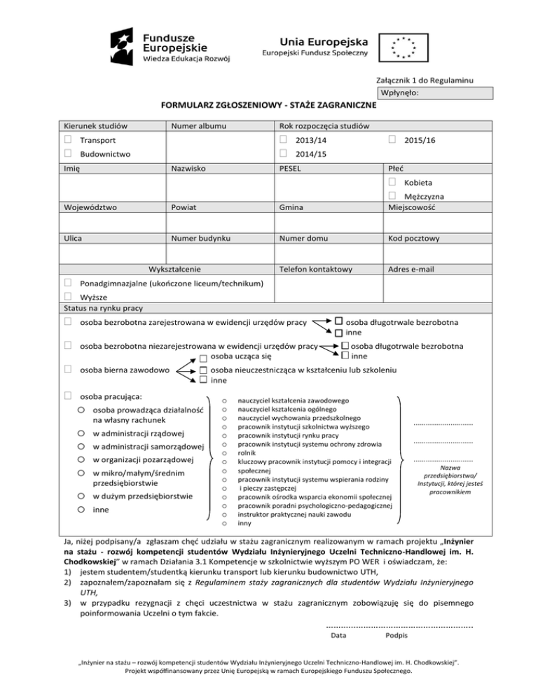 Załącznik 1 do Regulaminu Wpłynęło: FORMULARZ ZGŁOSZENIOWY - STAŻE ZAGRANICZNE Kierunek studiów Numer albumu Rok rozpoczęcia studiów Transport Budownictwo Imię Nazwisko 2013/14 2015/16 2014/15 PESEL Płeć Kobieta Województwo Powiat Gmina Mężczyzna Miejscowość Ulica Numer budynku Numer domu Kod pocztowy Telefon kontaktowy Adres e-mail Wykształcenie Ponadgimnazjalne (ukończone liceum/technikum) Wyższe Status na rynku pracy osoba bezrobotna zarejestrowana w ewidencji urzędów pracy osoba długotrwale bezrobotna inne osoba bezrobotna niezarejestrowana w ewidencji urzędów pracy osoba ucząca się osoba bierna zawodowo osoba pracująca: o o o o o o o osoba prowadząca działalność na własny rachunek w administracji rządowej w administracji samorządowej w organizacji pozarządowej w mikro/małym/średnim przedsiębiorstwie w dużym przedsiębiorstwie inne osoba długotrwale bezrobotna inne osoba nieuczestnicząca w kształceniu lub szkoleniu inne o o o o o o o o o o o o o o o nauczyciel kształcenia zawodowego nauczyciel kształcenia ogólnego nauczyciel wychowania przedszkolnego pracownik instytucji szkolnictwa wyższego pracownik instytucji rynku pracy pracownik instytucji systemu ochrony zdrowia rolnik kluczowy pracownik instytucji pomocy i integracji społecznej pracownik instytucji systemu wspierania rodziny i pieczy zastępczej pracownik ośrodka wsparcia ekonomii społecznej pracownik poradni psychologiczno-pedagogicznej instruktor praktycznej nauki zawodu inny ............................. ............................. ............................. Nazwa przedsiębiorstwa/ Instytucji, której jesteś pracownikiem Ja, niżej podpisany/a zgłaszam chęć udziału w stażu zagranicznym realizowanym w ramach projektu „Inżynier na stażu - rozwój kompetencji studentów Wydziału Inżynieryjnego Uczelni Techniczno-Handlowej im. H. Chodkowskiej” w ramach Działania 3.1 Kompetencje w szkolnictwie wyższym PO WER i oświadczam, że: 1) jestem studentem/studentką kierunku transport lub kierunku budownictwo UTH, 2) zapoznałem/zapoznałam się z Regulaminem staży zagranicznych dla studentów Wydziału Inżynieryjnego UTH, 3) w przypadku rezygnacji z chęci uczestnictwa w stażu zagranicznym zobowiązuję się do pisemnego poinformowania Uczelni o tym fakcie. ………………………………………………….. Data Podpis „Inżynier na stażu – rozwój kompetencji studentów Wydziału Inżynieryjnego Uczelni Techniczno-Handlowej im. H. Chodkowskiej”. Projekt współfinansowany przez Unię Europejską w ramach Europejskiego Funduszu Społecznego. b) OŚWIADCZENIE UCZESTNIKA PROJEKTU Ja, …………………………………………..………..………. , PESEL: ………………………………………………………… imię i nazwisko w związku z przystąpieniem do projektu pn. Inżynier na stażu - rozwój kompetencji studentów Wydziału Inżynieryjnego Uczelni Techniczno-Handlowej im. H. Chodkowskiej oświadczam, że przyjmuję do wiadomości, iż: 1. Administratorem moich danych osobowych jest Minister Rozwoju pełniący funkcję Instytucji Zarządzającej dla Programu Operacyjnego Wiedza Edukacja Rozwój 2014-2020, mający siedzibę przy Plac Trzech Krzyży 3/5, 00-507 Warszawa. 2. Podstawę prawną przetwarzania moich danych osobowych stanowi art. 23 ust. 1 pkt 2 lub art. 27 ust. 2 pkt 2 ustawy z dnia 29 sierpnia 1997 r. o ochronie danych osobowych ( Dz. U. z 2014 r. poz. 1182, z późn. zm.) – dane osobowe są niezbędne dla realizacji Programu Operacyjnego Wiedza Edukacja Rozwój 2014-2020 (PO WER) na podstawie: 1) w odniesieniu do zbioru Program Operacyjny Wiedza Edukacja Rozwój: a) rozporządzenia Parlamentu Europejskiego i Rady (UE) nr 1303/2013 z dnia 17 grudnia 2013 r. ustanawiającego wspólne przepisy dotyczące Europejskiego Funduszu Rozwoju Regionalnego, Europejskiego Funduszu Społecznego, Funduszu Spójności, Europejskiego Funduszu Rolnego na rzecz Rozwoju Obszarów Wiejskich oraz Europejskiego Funduszu Morskiego i Rybackiego oraz ustanawiającego przepisy ogólne dotyczące Europejskiego Funduszu Rozwoju Regionalnego, Europejskiego Funduszu Społecznego, Funduszu Spójności i Europejskiego Funduszu Morskiego i Rybackiego oraz uchylającego rozporządzenie Rady (WE) nr 1083/2006 (Dz. Urz. UE L 347 z 20.12.2013, str. 320, z późn. zm.), b) rozporządzenia Parlamentu Europejskiego i Rady (UE) nr 1304/2013 z dnia 17 grudnia 2013 r. w sprawie Europejskiego Funduszu Społecznego i uchylającego rozporządzenie Rady (WE) nr 1081/2006 (Dz. Urz. UE L 347 z 20.12.2013, str. 470), c) ustawy z dnia 11 lipca 2014 r. o zasadach realizacji programów w zakresie polityki spójności finansowanych w perspektywie finansowej 2014–2020 (Dz. U. poz. 1146, z późn. zm.); 2) w odniesieniu do zbioru Centralny system teleinformatyczny wspierający realizację programów operacyjnych: a) rozporządzenia Parlamentu Europejskiego i Rady (UE) nr 1303/2013 z dnia 17 grudnia 2013 r. ustanawiającego wspólne przepisy dotyczące Europejskiego Funduszu Rozwoju Regionalnego, Europejskiego Funduszu Społecznego, Funduszu Spójności, Europejskiego Funduszu Rolnego na rzecz Rozwoju Obszarów Wiejskich oraz Europejskiego Funduszu Morskiego i Rybackiego oraz ustanawiającego przepisy ogólne dotyczące Europejskiego Funduszu Rozwoju Regionalnego, Europejskiego Funduszu Społecznego, Funduszu Spójności i Europejskiego Funduszu Morskiego i Rybackiego oraz uchylającego rozporządzenie Rady (WE) nr 1083/2006, 3. 4. 5. 6. 7. 8. rozporządzenia Parlamentu Europejskiego i Rady (UE) nr 1304/2013 z dnia 17 grudnia 2013 r. w sprawie Europejskiego Funduszu Społecznego i uchylającego rozporządzenie Rady (WE) nr 1081/2006, c) ustawy z dnia 11 lipca 2014 r. o zasadach realizacji programów w zakresie polityki spójności finansowanych w perspektywie finansowej 2014–2020, d) rozporządzenia wykonawczego Komisji (UE) nr 1011/2014 z dnia 22 września 20