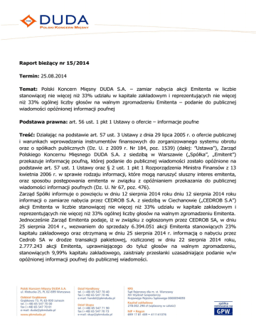 Raport bieżący nr 15/2014 Termin: 25.08.2014 Temat: Polski Koncern Mięsny DUDA S.A. – zamiar nabycia akcji Emitenta w liczbie stanowiącej nie więcej niż 33% udziału w kapitale zakładowym i reprezentujących nie więcej niż 33% ogólnej liczby głosów na walnym zgromadzeniu Emitenta – podanie do publicznej wiadomości opóźnionej informacji poufnej Podstawa prawna: art. 56 ust. 1 pkt 1 Ustawy o ofercie – informacje poufne Treść: Działając na podstawie art. 57 ust. 3 Ustawy z dnia 29 lipca 2005 r. o ofercie publicznej i warunkach wprowadzania instrumentów finansowych do zorganizowanego systemu obrotu oraz o spółkach publicznych (Dz. U. z 2009 r. Nr 184, poz. 1539) (dalej: ”Ustawa”), Zarząd Polskiego Koncernu Mięsnego DUDA S.A. z siedzibą w Warszawie („Spółka”, „Emitent”) przekazuje informację poufną, której podanie do publicznej wiadomości zostało opóźnione na podstawie art. 57 ust. 1 Ustawy oraz § 2 ust. 1 pkt 1 Rozporządzenia Ministra Finansów z 13 kwietnia 2006 r. w sprawie rodzaju informacji, które mogą naruszyć słuszny interes emitenta, oraz sposobu postępowania emitenta w związku z opóźnianiem przekazania do publicznej wiadomości informacji poufnych (Dz. U. Nr 67, poz. 476). Zarząd Spółki informuje o powzięciu w dniu 12 sierpnia 2014 roku dniu 12 sierpnia 2014 roku informacji o zamiarze nabycia przez CEDROB S.A. z siedzibą w Ciechanowie („CEDROB S.A”) akcji Emitenta w liczbie stanowiącej nie więcej niż 33% udziału w kapitale zakładowym i reprezentujących nie więcej niż 33% ogólnej liczby głosów na walnym zgromadzeniu Emitenta. Jednocześnie Zarząd Emitenta podaje, iż w związku z ogłoszonym przez CEDROB SA, w dniu 25 sierpnia 2014 r., wezwaniem do sprzedaży 6.394.051 akcji Emitenta stanowiących 23% kapitału zakładowego oraz otrzymaną w dniu 25 sierpnia 2014 r. informacją o nabyciu przez Cedrob SA w drodze transakcji pakietowej, rozliczonej w dniu 22 sierpnia 2014 roku, 2.777.243 akcji Emitenta, uprawniającego do tyluż głosów na walnym zgromadzeniu, stanowiących 9,99% kapitału zakładowego, zaistniały przesłanki uzasadniające podanie w/w opóźnionej informacji poufnej do publicznej wiadomości. O opóźnieniu w przekazaniu informacji poufnej Zarząd Emitenta informował Komisję Nadzoru Finansowego: W dniu 13 sierpnia 2014 roku Zarząd Emitenta przekazał do Komisji Nadzoru Finansowego informację o następującej treści: „Zarząd Polskiego Koncernu Mięsnego DUDA S.A. z siedzibą w Warszawie („Spółka” lub „Emitent”) działając na podstawie art. 57 ust. 1 ustawy z dnia 29 lipca 2005 roku o ofercie publicznej i warunkach wprowadzania instrumentów finansowych do zorganizowanego systemu obrotu oraz o spółkach publicznych (tekst jednolity: Dz. U. z 2013 roku, poz. 1382), zwanej dalej “Ustawą” oraz § 2 ust. 1 pkt 1 rozporządzenia Ministra Finansów z 13 kwietnia 2006 roku w sprawie rodzaju informacji, które mogą naruszyć słuszny interes emitenta, oraz sposobu postępowania emitenta w związku z opóźnianiem przekazania do publicznej wiadomości informacji poufnych (Dz. U. z 2006 roku, Nr 67, poz. 476) przekazuje Komisji Nadzoru Finansowego informację o opóźnieniu wykonania obowiązku, o którym mowa w art. 56 ust. 1 pkt 1 Ustawy, w odniesieniu do informacji poufnej dotyczącej powzięcia informacji o zamiarze nabycia akcji Emitenta przez CEDROB S.A. i związanym z tym zawarciem umowy o współpracę w sprawie przekazywania informacji. Zarząd Emitenta informuje, iż w dniu 12 sierpnia 2014 roku powziął informację o zamiarze nabycia przez CEDROB S.A. z siedzibą w Ciechanowie („CEDROB S.A”) akcji Emitenta w liczbie stanowiącej nie więcej niż 33% udziału w kapitale zakładowym i reprezentujących nie więcej niż 33% ogólnej liczby głosów na walnym zgromadzeniu Emitenta. Realizacja planowanej inwestycji będzie wiązała się z koniecznością ogłoszenia przez CEDROB S.A. wezwania do zapisywania się na sprzedaż lub zamianę akcji Emitenta w trybie art. 72 ust 1 pkt 1 Ustawy, a także obowiązkiem zgłoszenia Prezesowi Urzędu Ochrony Konkurencji i Konsumentów zamiaru koncentracji pomiędzy CEDROB S.A. oraz Emitentem. W konsekwencji, Zarząd CEDROB S.A. zwrócił się do Emitenta z prośbą o uzyskanie dostępu do informacji i dokumentów, które będą konieczne do dokonania zgłoszenia Prezesowi Urzędu Ochrony Konkurencji i Konsumentów zamiaru koncentracji. W związku z powyższym, w celu przygotowania zgłoszenia zamiaru koncentracji oraz usprawnienia przebiegu postępowania przed Prezesem Urzędu Ochrony Konkurencji i Konsumentów, Emitent oraz CEDROB S.A. zawarły w dniu 13 sierpnia 2014 roku umowę, której przedmiotem jest ustalenie warunków udostępnienia, przekazywania i wykorzystania informacji dotyczących PKM DUDA S.A., w tym zachowanie ich poufności, niezbędnych do sporządzenia przez CEDROB S.A. zgłoszenia zamiaru koncentracji oraz podczas toczącego się w przedmiocie zgłoszenia postępowania. W ocenie Spółki udostępnione informacje nie będą zawierały informacji poufnej w rozumieniu art. 154 ustawy z dnia 29 lipca 2005 roku o obrocie instrumentami finansowymi (tekst jednolity: Dz. U. z 2014, poz. 94). Treść powyższej informacji poufnej zostanie przekazana w formie raportu bieżącego w dacie ogłoszenia wezwania na sprzedaż lub zamianę akcji Emitenta przez CEDROB S.A. lub powzięcia informacji o niezrealizowaniu ww. akwizycji przez CEDROB S.A. W ocenie Emitenta wcześniejsze, niż w terminie wyżej wskazanym, przekazanie informacji o zawarciu powyższej umowy i okolicznościach jej zawarcia, w szczególności o planowanym przez CEDROB S.A. nabyciu akcji Emitenta, mogłoby naruszyć słuszny interes Emitenta, w szczególności negatywnie wpłynąć na przebieg współpracy stron porozumienia, jak również w poważnym stopniu zagroziłoby interesom obecnych lub przyszłych akcjonariuszy. Emitent wskazuje, iż opó