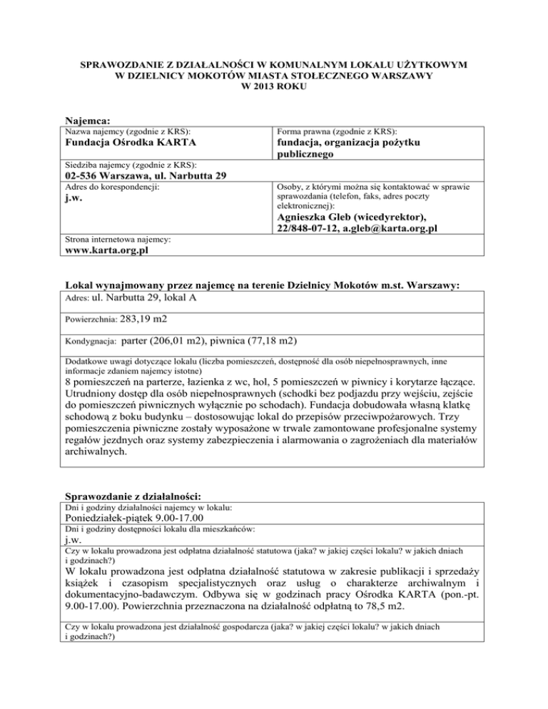 SPRAWOZDANIE Z DZIAŁALNOŚCI W KOMUNALNYM LOKALU UŻYTKOWYM W DZIELNICY MOKOTÓW MIASTA STOŁECZNEGO WARSZAWY W 2013 ROKU Najemca: Nazwa najemcy (zgodnie z KRS): Forma prawna (zgodnie z KRS): Fundacja Ośrodka KARTA fundacja, organizacja pożytku publicznego Siedziba najemcy (zgodnie z KRS): 02-536 Warszawa, ul. Narbutta 29 Adres do korespondencji: j.w. Osoby, z którymi można się kontaktować w sprawie sprawozdania (telefon, faks, adres poczty elektronicznej): Agnieszka Gleb (wicedyrektor), 22/848-07-12, [email protected] Strona internetowa najemcy: www.karta.org.pl Lokal wynajmowany przez najemcę na terenie Dzielnicy Mokotów m.st. Warszawy: Adres: ul. Narbutta 29, lokal A Powierzchnia: 283,19 Kondygnacja: m2 parter (206,01 m2), piwnica (77,18 m2) Dodatkowe uwagi dotyczące lokalu (liczba pomieszczeń, dostępność dla osób niepełnosprawnych, inne informacje zdaniem najemcy istotne) 8 pomieszczeń na parterze, łazienka z wc, hol, 5 pomieszczeń w piwnicy i korytarze łączące. Utrudniony dostęp dla osób niepełnosprawnych (schodki bez podjazdu przy wejściu, zejście do pomieszczeń piwnicznych wyłącznie po schodach). Fundacja dobudowała własną klatkę schodową z boku budynku – dostosowując lokal do przepisów przeciwpożarowych. Trzy pomieszczenia piwniczne zostały wyposażone w trwale zamontowane profesjonalne systemy regałów jezdnych oraz systemy zabezpieczenia i alarmowania o zagrożeniach dla materiałów archiwalnych. Sprawozdanie z działalności: Dni i godziny działalności najemcy w lokalu: Poniedziałek-piątek 9.00-17.00 Dni i godziny dostępności lokalu dla mieszkańców: j.w. Czy w lokalu prowadzona jest odpłatna działalność statutowa (jaka? w jakiej części lokalu? w jakich dniach i godzinach?) W lokalu prowadzona jest odpłatna działalność statutowa w zakresie publikacji i sprzedaży książek i czasopism specjalistycznych oraz usług o charakterze archiwalnym i dokumentacyjno-badawczym. Odbywa się w godzinach pracy Ośrodka KARTA (pon.-pt. 9.00-17.00). Powierzchnia przeznaczona na działalność odpłatną to 78,5 m2. Czy w lokalu prowadzona jest działalność gospodarcza (jaka? w jakiej części lokalu? w jakich dniach i godzinach?) Ośrodek KARTA nie prowadzi działalności gospodarczej. Opis działalności Najemcy w lokalu lub opis działalności związanej z najmem lokalu (prosimy o podanie konkretnych danych i o nieograniczanie się do podawania informacji zawartych w Statucie lub w KRS albo w innym rejestrze): Fundacja Ośrodka KARTA jest niezależną apolityczną organizacją pożytku publicznego. Celem Fundacji jest upowszechnianie wiedzy o wydarzeniach i postawach w XX wieku, które mają wpływ na współczesne życie społeczne, zaspokajanie społecznych potrzeb poznawczych i edukacyjnych związanych z przeszłością, a także działania opiniotwórcze. Fundacja Ośrodka KARTA realizuje swoje cele statutowe poprzez działalność archiwalną, edukacyjną, wydawniczą, wystawienniczą, oraz poprzez projekty dokumentacyjne. W Ośrodku KARTA mieszczą się Archiwa Ośrodka KARTA. Archiwum Opozycji zbiera materiały dotyczące oporu społecznego w Polsce w okresie 1956–1989. Zasadniczy trzon stanowią druki zwarte i czasopisma II obiegu oraz ulotki, plakaty, kartki pocztowe, znaczki, banknoty publikowane w podziemnych drukarniach. W archiwum znajdują się również obszerne kolekcje osobiste (m.in. Jacka Kuronia, Anieli Steinsbergowej), środowiskowe i tematyczne (m.in. Komitet Obrony Robotników, Prymasowski Komitet Pomocy Osobom Pozbawionym Wolności i ich Rodzinom). Kolekcja Archiwum Opozycji „Solidarność – Narodziny Ruchu”, zawierająca dokumenty pierwszych miesięcy działalności NSZZ „Solidarność”, znajduje się na liście światowego dziedzictwa kulturowego UNESCO. Archiwum Wschodnie gromadzi materiały dotyczące Kresów Wschodnich II Rzeczypospolitej, II wojny światowej oraz losów obywateli polskich w ZSRR i pod okupacją sowiecką (szczególnie represji: deportacji, uwięzienia, pobytu w łagrach). Są to głównie wspomnienia i relacje, kolekcje osobiste, a także kopie akt rosyjskiego Stowarzyszenia „Memoriał”, Instytutu Hoovera w Stanford i Instytutu Sikorskiego w Londynie. Łącznie zbiory zajmują 1400 metrów bieżących półek. Archiwum Fotografii gromadzi, opracowuje i digitalizuje fotografie oraz ratuje i zabezpiecza zagrożone zbiory. Znajdują się w nim kolekcje wybitnych fotografów, ale przede wszystkim zdjęcia z rodzinnych albumów – fragmenty prywatnych historii, mniej obecnych w archiwach państwowych i oficjalnych dokumentacjach. Zasób Archiwum Fotografii to około 190 tysięcy zdjęć w formie odbitek, negatywów, slajdów i plików cyfrowych. W jego zbiorach znajdują się unikatowe zdjęcia z końca XIX wieku i z wieku XX, m.in. dziewiętnastowieczne portrety, zdjęcia z II Rzeczpospolitej – w tym Kresów Wschodnich, wydarzeń II wojny światowej, osób represjonowanych w ZSRR, życia codziennego w PRL, opozycji demokratycznej, stanu wojennego, czy transformacji ustrojowej w Polsce i w krajach Europy Środkowo-Wschodniej. Materiały z archiwów OK udostępniane są w czytelni znajdującej się w lokalu przy ul. Narbutta 29. Od 2009 roku trwa także digitalizacja materiałów i udostępnianie w internecie poprzez Bibliotekę Cyfrową Ośrodka KARTA. W lokalu przy ul. Narbutta 29 mieści się redakcja kwartalnika historycznego „Karta” (rekomendowanego przez MEN do codziennej pracy nauczycieli historii i języka polskiego). W 2012 zostały wydane numery 74-77. Wydaliśmy także 11 książek o tematyce historycznej i zorganizowaliśmy 2 wystawy. Oprócz stałej działalności, w 2013 roku Ośrodek realizował projekty dokumentacyjne z zakresu pozyskiwania nowych materiałów archiwalnych, nagrywania relacji świadków historii w ramach programu „Historia Mówiona”, prowadził projekt „Cyfrowe Archiwa Tradycji Lokalnej” (będący częścią Programu Pomocy Bi