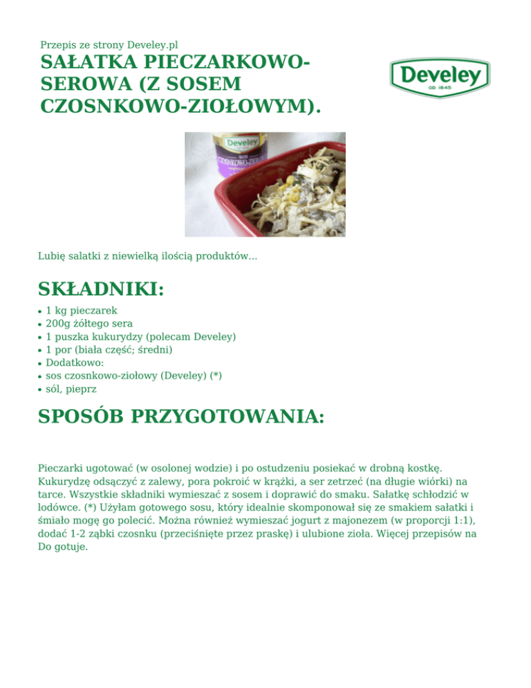 Przepis ze strony Develey.pl SAŁATKA PIECZARKOWOSEROWA (Z SOSEM CZOSNKOWO-ZIOŁOWYM). Lubię salatki z niewielką ilością produktów... SKŁADNIKI: ● ● ● ● ● ● ● 1 kg pieczarek 200g żółtego sera 1 puszka kukurydzy (polecam Develey) 1 por (biała część; średni) Dodatkowo: sos czosnkowo-ziołowy (Develey) (*) sól, pieprz SPOSÓB PRZYGOTOWANIA: Pieczarki ugotować (w osolonej wodzie) i po ostudzeniu posiekać w drobną kostkę. Kukurydzę odsączyć z zalewy, pora pokroić w krążki, a ser zetrzeć (na długie wiórki) na tarce. Wszystkie składniki wymieszać z sosem i doprawić do smaku. Sałatkę schłodzić w lodówce. (*) Użyłam gotowego sosu, który idealnie skomponował się ze smakiem sałatki i śmiało mogę go polecić. Można również wymieszać jogurt z majonezem (w proporcji 1:1), dodać 1-2 ząbki czosnku (przeciśnięte przez praskę) i ulubione zioła. Więcej przepisów na Do gotuje.