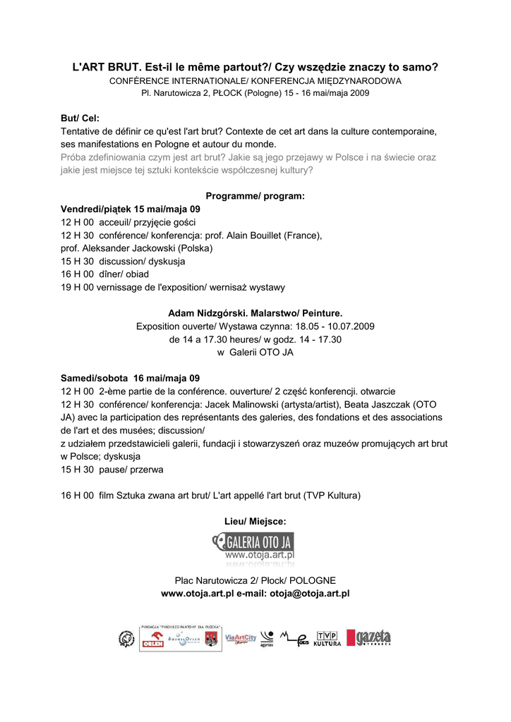 L'ART BRUT. Est-il il le même partout?/ partout? Czy wszędzie dzie znaczy to samo? CONFÉRENCE RENCE INTERNATIONALE/ KONFERENCJA MIĘDZYNARODOWA MI DZYNARODOWA Pl. Narutowicza arutowicza 2, PŁOCK (Pologne) 15 - 16 mai/maja 2009 But/ Cel: Tentative de définir ce qu'est l'art brut? Contexte de cet art dans la culture contemporaine, ses manifestations en Pologne et autour du monde. Próba zdefiniowania czym jest art brut? Jakie są s jego przejawy w Polsce i na świecie oraz jakie jest miejsce tej sztuki kontekście kontek współczesnej kultury? Programme/ program: Vendredi/piątek tek 15 mai/maja 09 12 H 00 acceuil/ przyjęcie cie gości goś 12 H 30 conférence/ konferencja: prof. Alain Bouillet (France), prof. Aleksander Jackowski (Polska) 15 H 30 discussion/ dyskusja 16 H 00 dîner/ obiad 19 H 00 vernissage de l'exposition/ wernisaŜ wernisa wystawy Adam Nidzgórski. Nidzgó Malarstwo/ Peinture. Exposition ouverte/ Wystawa W czynna: 18.05 - 10.07.2009 de 14 a 17.30 heures/ w godz. 14 - 17.30 w Galerii OTO JA Samedi/sobota 16 mai/maja 09 12 H 00 2-ème me partie de la conférence. conf ouverture/ 2 część konferencji. otwarcie 12 2 H 30 conférence/ konferencja: Jacek Malinowski (artysta/artist), Beata Jaszczak (OTO JA) avec la participation des représentants des galeries, des fondations et des associations de l'art et des musées; discussion/ z udziałem przedstawicieli galerii, fundacji fun i stowarzyszeń oraz muzeów promuj promujących art brut w Polsce; dyskusja 15 H 30 pause/ przerwa 16 H 00 film Sztuka zwana art brut/ L'art appellé l'art brut (TVP Kultura) Lieu/ Miejsce: Plac Narutowicza 2/ 2 Płock/ POLOGNE www.otoja.art.pl e-mail: [email protected]