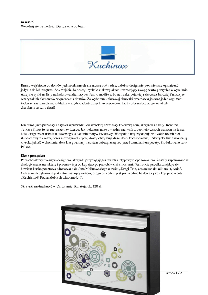newss.pl Wyróżnij się na wejściu. Design wita od bram Bramy wejściowe do domów jednorodzinnych nie muszą być nudne, a dobry design nie powinien się ograniczać jedynie do ich wnętrza. Aby wejście do posesji zyskało ciekawy akcent zwracający uwagę warto pomyśleć o wymianie starej skrzynki na listy na kolorową alternatywę. Jest to możliwe, bo na rynku pojawiają się coraz bardziej fantazyjne wzory takich elementów wyposażenia domów. Za wyborem kolorowej skrzynki przemawia jeszcze jeden argument – żaden ze znajomych nie zabłądzi w rzędzie identycznych szeregowców, kiedy u bram będzie go witał tak charakterystyczny detal! Kuchinox jako pierwszy na rynku wprowadził do szerokiej sprzedaży kolorową serię skrzynek na listy. Rondino, Tattoo i Flores to jej pierwsze trzy twarze. Jak wskazują nazwy – jedna ma wzór z geometrycznych wariacji na temat koła, druga wzór tribala tatuażowego, a ostatnia motyw kwiatowy. Wszystkie trzy występują w dwóch rozmiarach standardowym i maxi, przeznaczonym dla tych, którzy otrzymują duże ilości korespondencji. Skrzynki Kuchinox mają wysoką jakość wykonania, dwa lata gwarancji i system zabezpieczający przed zamakaniem poczty. Produkowane są w Polsce. Eko z pomysłem Poza charakterystycznym designem, skrzynki przyciągają też wzrok nietypowym opakowaniem. Zostały zapakowane w ekologiczną szarą tekturę i przemawiają do kupującego prawdziwymi emocjami. Na froncie pudelka znajduje się bowiem kartka pocztowa adresowana do Jana Malinowskiego o treści „Drogi Tato, zostaniesz dziadkiem:-), Ania”. Cała seria dedykowana jest natomiast optymistom, czego dowodem jest przewodnie hasło całej kolekcji producenta „Kuchinox@ Poczta dobrych wiadomości!”. Skrzynki można kupić w Castoramie. Kosztują ok. 120 zł. strona 1 / 2 newss.pl Wyróżnij się na wejściu. Design wita od bram Kuchinox PRESS BOX strona 2 / 2