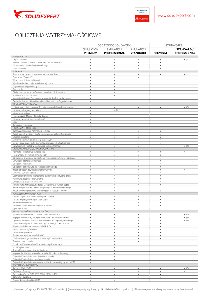 www.solidexpert.com OBLICZENIA WYTRZYMAŁOŚCIOWE TYP GEOMETRII Części i Złożenia Modele bryłowe, powierzchniowe, belkowe i kratownice Komponenty sztywne i Wirtualne ściany Masa skupiona TYPY ANALIZ Statyczne naprężenia i przemieszczenia z kontaktem Zmęczenie / Trwałość Wyboczenia i utrata stabilności Wymiana ciepła – stacjonarna i niestacjonarna Częstotliwości drgań własnych Test upadku Obciążenia mieszane dla Badania zbiorników ciśnieniowych Analiza oparta na zdarzeniu Materiały nieliniowe, Duże przemieszczenia, Analiza niestacjonarna Dynamika liniowa – Historia modalna, Harmoniczna, Drgania losowe WŁASNOŚCI MATERIAŁÓW Liniowy sprężysty izotropowy & ortotropowy zależny od temperatury Nieliniowy plastyczny von Mises Nieliniowy sprężysty Hipersprężysty Mooney-Rivlin & Ogden Nieliniowy wiskoelastyczny (pełzanie) Nitinol Kompozyty – laminaty NARZĘDZIA PROJEKTOWE Badania wielotokowe / scenariusz „Co jeśli” Tabela danych wejściowych dla scenariusza dowolnych kombinacji Doradca symulacji Sensory z alarmem ograniczeń projektowych Metody adaptacyjny siatki elementów skończonych dla zbieżności Optymalizacja i wgląd w projekt oraz Śledzenie trendu ŚRODOWISKO (OBCIĄŻENIA/UMOCOWANIA) Normalne i kierunkowe ciśnienie i siła Nierównomierny rozkład ciśnienia i siły Obciążenia: Grawitacja, Odśrodkowa, Przyspieszenie liniowe i obrotowe Sztywna i Rozprowadzona masa Obciążenie łożyskiem Obciążenie temperaturą dla rozkładu termicznego Import obciążeń z symulacji kinematycznych Symetria i Symetria kołowa Geometria odniesienia (nieruchoma, cylindryczna, sferyczna, płaska Przesuwne podpory / Nieruchome Umocowanie łożyskiem kulowym Temperatura, Konwekcja, Radiacja, Moc cieplna, Strumień ciepła Import temperatur do Badania statycznego z Badania termicznego Import wyników przepływu jako obciążeń w Statyce i Termice POŁĄCZENIA KOMPONENTÓW Kontakt Część-Do-Części z poślizgiem i tarciem Kontakt wiązany stykających ścian części Pasowanie skurczowe Sprężyna, Śruba, Sworzeń i Spoina Punktowa Opór termiczny NARZĘDZIA WYŚWIETLANIA WYNIKÓW Wypadkowa i składowe przemieszczenia z deformacją Naprężenia vonMises, Naprężenia główne, składowe naprężenia Kryterium vonMises, Tresca, Mohr-Coulomb dla współczynnika bezp. Odkształcenia główne i składowe, Gęstość energii odkształcenia Współczynnik bezpieczeństwa śrub i kołków Sonda i lokalne wyświetlanie Dynamiczne przekroje Porównanie wyników z wielu badań Zdeformowana geometria (zapis jako część SolidWorks) Trwałość i uszkodzenie Kształt modów częstotliwości rezonansowych z animacją Kształt wyboczenia Rozkład temperatury i strumienia ciepła Naprężenie zlinearyzowane dla badania zbiornika ciśnieniowego Odpowiedź w funkcji czasu dla Badania upadku Odpowiedź w funkcji przyrostu obciążenia Odpowiedź w funkcji czasu lub częstotliwości dla Analizy dynam. z PSD WSPÓŁPRACA INŻYNIERÓW Raporty HTML i DOC Publikacja eDrawings Zapis wykresów do BMP, JPEG, VRML, XGL czy AVI Biblioteka / Szablony Eksport do innych aplikacji MES DODATEK DO SOLIDWORKS SIMULATION SIMULATION SIMULATION PREMIUM PROFESSIONAL STANDARD SOLIDWORKS STANDARD / PREMIUM PROFESSIONAL ● ● ● ● ● ● ● ● ● ● ● ● ● ● ● ● ● (2) ● ● ● ● ● ● ● ● ● ● ● ● ● ● ● ● ● ● ● ● ● ● ● ● ● ● ● ● ● ● ● (1) ● ● ● (2) ● ● ● ● ● ● ● ● ● ● ● ● ● ● ● ● ● ● ● ● ● ● ● ● ● ● ● ● ● ● ● ● ● ● ● ● o ● ● ● ● ● ● ● ● ● ● ● ● ● o ● ● ● ● ● ● ● ● ● ● ● ● ● ● ● ● ● ● ● ● ● ● ● ● o o ● ● ● ● ● ● ● ● ● ● ● ● ● ● ● ● ● ● ● ● ● ● ● ● ● ● ● ● ● ● ● ● ● ● ● ● ● ● ● ● ● ● ● ● ● ● ● ● ● ● ● ● ● ● ● ● ● ● ● ● ● ● ● ● ● ● ● ● ● ● ● (2) ● (2) ● (2) ● ● ● ● ● ● ● ● ● ● ● ● ● ● ● ● ● ● ● (2) ● ● (2) ● ● „●” zawiera, „o” wymaga SOLIDWORKS Flow Simulation | (1) vonMises plastyczny dostępny tylko dla badania Testu upadku | (2) SimulationXpress posiada ograniczone opcje tej funkcjonalności