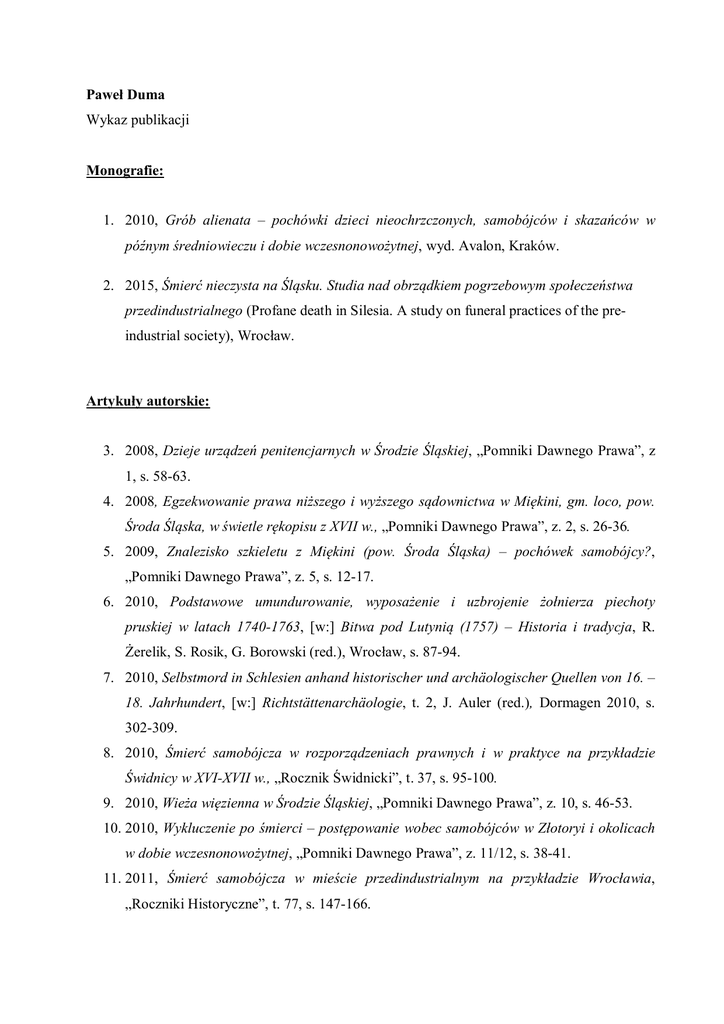 Paweł Duma Wykaz publikacji Monografie: 1. 2010, Grób alienata – pochówki dzieci nieochrzczonych, samobójców i skazańców w późnym średniowieczu i dobie wczesnonowożytnej, wyd. Avalon, Kraków. 2. 2015, Śmierć nieczysta na Śląsku. Studia nad obrządkiem pogrzebowym społeczeństwa przedindustrialnego (Profane death in Silesia. A study on funeral practices of the preindustrial society), Wrocław. Artykuły autorskie: 3. 2008, Dzieje urządzeń penitencjarnych w Środzie Śląskiej, „Pomniki Dawnego Prawa”, z 1, s. 58-63. 4. 2008, Egzekwowanie prawa niższego i wyższego sądownictwa w Miękini, gm. loco, pow. Środa Śląska, w świetle rękopisu z XVII w., „Pomniki Dawnego Prawa”, z. 2, s. 26-36. 5. 2009, Znalezisko szkieletu z Miękini (pow. Środa Śląska) – pochówek samobójcy?, „Pomniki Dawnego Prawa”, z. 5, s. 12-17. 6. 2010, Podstawowe umundurowanie, wyposażenie i uzbrojenie żołnierza piechoty pruskiej w latach 1740-1763, [w:] Bitwa pod Lutynią (1757) – Historia i tradycja, R. Żerelik, S. Rosik, G. Borowski (red.), Wrocław, s. 87-94. 7. 2010, Selbstmord in Schlesien anhand historischer und archäologischer Quellen von 16. – 18. Jahrhundert, [w:] Richtstättenarchäologie, t. 2, J. Auler (red.), Dormagen 2010, s. 302-309. 8. 2010, Śmierć samobójcza w rozporządzeniach prawnych i w praktyce na przykładzie Świdnicy w XVI-XVII w., „Rocznik Świdnicki”, t. 37, s. 95-100. 9. 2010, Wieża więzienna w Środzie Śląskiej, „Pomniki Dawnego Prawa”, z. 10, s. 46-53. 10. 2010, Wykluczenie po śmierci – postępowanie wobec samobójców w Złotoryi i okolicach w dobie wczesnonowożytnej, „Pomniki Dawnego Prawa”, z. 11/12, s. 38-41. 11. 2011, Śmierć samobójcza w mieście przedindustrialnym na przykładzie Wrocławia, „Roczniki Historyczne”, t. 77, s. 147-166. 12. 2011, Luźne znaleziska monet i liczmana z terenu byłej karczmy w miejscowości Siemichów, pow. Środa Śląska, „Śląskie Sprawozdania Archeologiczne”, t. 53, s. 85-94. 13. 2012, Wiara w „żywego trupa” a pośmiertna marginalizacja jednostki na Dolnym Śląsku okresu nowożytnego, „Funeralia Lednickie”, t. 14, s. 189-201. 14. 2012, Jelenia Góra, pow. grodzki, [znalezisko], „Wiadomości Numizmatyczne”, R. LVI, z. 2, s. 298-299. 15. 2012, Pozostałości murowanej szubienicy pod miejscowością Modrzewie — dowód ambicji właściciela wsi czy śląski standard?, „Pomniki Dawnego Prawa”, z. 19, s. 1825. 16. 2012, Numizmaty z badań przy kościele św. Piotra i Pawła na Ostrowie Tumskim we Wrocławiu, [w:] Pankiewicz A. (red.) Nowożytny cmentarz przy kościele św. Piotra i Pawła na Ostrowie Tumskim we Wrocławiu (lata 1621-1670), „Wratislavia Antiqua”, t. 17, s. 111-118. 17. 2014, Wrocław, m., pow. grodzki [znalezisko], „Wiadomości Numizmatyczne”, LVIII, z. 3-4, 2014, s. 282-283. 18. 2014, Groby przestępców na Śląsku w świetle najnowszych badań archeologicznych, [w:] T. Kurasiński, K. Skóra (red.), Grób w przestrzeni, przestrzeń w grobie. Przestrzenne uwarunkowania w dawnej obrzędowości pogrzebowej, „Acta Archaeologica Lodziensia”, t. 60, Łódź, s. 225-236. 19. 2015, Tajne świadki graniczne w Europie Środkowej od XVI do XIX w. – problem słabo zbadany, „Kwartalnik Historii Kultury Materialnej”, LXIII, nr 1, s. 79-91. 20. 2015, Finds of disarticulated skeletal remains from Wrocław, Nowy Targ square – traces of occult practices or an echo of past justice? [w:] Gardeła L., Kajkowski K. (ed.) Limbs, Bones and Reopened Graves in Past Societies, Bytów. 21. 2015, Cechy i liczmany odnalezione na pl. Nowy Targ we Wrocławiu, „Folia Numismatica”, nr 29/2, s. 151-158. 22. 2016, Nowa kuna z Wrocławia, „Pomniki Dawnego Prawa”, z. 33, s. 58-59. Publikacje współautorskie: 23. 2009, P. Duma, A. Dobrzyniecki, Pomnik Rolanda w Środzie Śląskiej, „Pomniki Dawnego Prawa”, z. 8, s. 22-27. 24. 2010, P. Duma, B. Paszkiewicz, Kadłub, gm. Miękinia, pow. średzki [znalezisko], "Wiadomości Numizmatyczne", R. LIV, z. 1, s. 97-98. 25. 2010, P. Duma, H. Rutka, D. Wojtucki, Wyniki badań archeologicznych na dawnym miejscu straceń w Lubomierzu w 2010 roku, „Pomniki Dawnego Prawa”, z. 10, s. 4-13. 26. 2011, P. Duma, D. Wojtucki, Wyniki archeologicznych badań sondażowych dawnego miejsca straceń w Złotym Stoku w 2010 r., „Pomniki Dawnego Prawa”, z. 13, s. 10-17. 27. 2011, P. Duma, D. Wojtucki, Wyniki badań archeologicznych na dawnym miejscu straceń w Lubomierzu w 2011 roku, „Pomniki Dawnego Prawa”, z. 14, s. 10-17. 28. 2012, P. Duma, H. Rutka, D. Wojtucki, Miejsce straceń w Złotym Stoku – wyniki badań archeologicznych z 2011 roku, „Pomniki Dawnego Prawa”, z. 16, s. 12-25. 29. 2012, P. Duma, D. Wojtucki, Neu entdeckte Galgenreste bei Liebenthal (Lubomierz) und Reichenstein (Złoty Stok), [w:] Richtstättenarchäologie, t. 3, J. Auler (red.), Dormagen, s. 46-56. 30. 2012, P. Duma, H. Rutka, D. Wojtucki, Odkrycie pozostałości szubienicy w Jeleniej Górze, „Rocznik Jeleniogórski”, t. XLIV, s. 49-66. 31. 2012, P. Duma, D. Wojtucki, Badania sondażowe na dawnym miejscu straceń w Kamiennej Górze w październiku 2012 roku, „Pomniki Dawnego Prawa”, z. 20, s. 1221. 32. 2013, L. Gardeła, P. Duma, Untimely death. Atypical burials of children in early and late medieval Poland, „Word Archaeology“, 45 (2), s. 314-332. 33. 2013, P. Duma, D. Wojtucki, Znaczenie głowy w sądownictwie późnego średniowiecza i czasów wczesnonowożytnych, [w:] Gardeła L., Kajkowski K. (ed.) Motyw głowy w dawnych kulturach w perspektywie porównawczej, Bytów. 34. 2014, P. Duma, H. Rutka, D. Wojtucki, Sondażowe badania archeologiczne na Wzgórzu Ryszarda w Bolkowie w 2013 r., „Pomniki Dawnego Prawa”, z. 26, s. 12-23. 35. 2014, M. Janeczek, A. Chrószcz, V. Onar, R. Henklewski, J. Piekalski, P. Duma, A. Czerski, I. Całkosiński, Anatomical and Biomechanical Aspects of the Horse Spine: The Interpretati