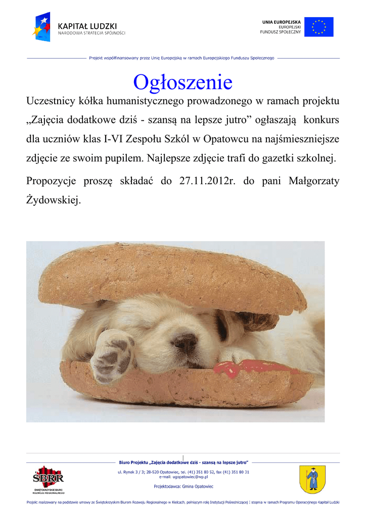 Ogłoszenie Uczestnicy kółka humanistycznego prowadzonego w ramach projektu „Zajęcia dodatkowe dziś - szansą na lepsze jutro” ogłaszają konkurs dla uczniów klas I-VI Zespołu Szkól w Opatowcu na najśmieszniejsze zdjęcie ze swoim pupilem. Najlepsze zdjęcie trafi do gazetki szkolnej. Propozycje proszę składać do 27.11.2012r. do pani Małgorzaty Żydowskiej. |