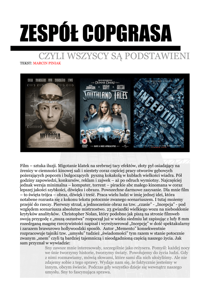ZESPÓŁ COPGRASA CZYLI WSZYSCY SĄ PODSTAWIENI TEKST: MARCIN PINIAK Film – sztuka iluzji. Migotanie klatek na srebrnej tacy efektów, złoty pył osiadający na źrenicy w ciemności kinowej sali i niestety coraz częściej pracy otworów gębowych pożerających popcorn i bulgoczących pyszną kokakolą w kubłach wielkości wiadra. Pół godziny zapowiedzi, konkursów, reklam i zajwek – aż po odruch wymiotny. Najczęściej jednak wersja minimalna – komputer, torrent – pirackie abc małego kinomana w coraz lepszej jakości szybkości, dźwięku i obrazu. Powszechne darmowe zasysanie. Dla mnie film – to święta trójca – obraz, dźwięk i treść. Praca wielu ludzi w imię jednej idei, która notabene rozrasta się z kokonu tekstu potocznie zwanego scenariuszem. I tutaj możemy przejść do rzeczy. Pierwszy strzał, a jednocześnie obraz na tzw. „czasie” - „Incepcja” - pod względem scenariusza absolutne mistrzostwo. 23 gwiazdki wielkiego wozu na nieboskłonie krytyków analityków. Christopher Nolan, który podobno jak piszą na stronie filmweb swoją przygodę z „muzą oszustwa” rozpoczął już w wieku siedmiu lat zapisując z lufy 8 mm rozedrganą magmę rzeczywistości napisał i wyreżyserował „Incepcję” w dość spektakularny i zarazem brawurowo hollywoodzki sposób. Autor „Memento” konsekwentnie rozpracowuje tajniki tzw. „umysłu” tudzież „świadomości” tym razem w stanie potocznie zwanym „snem” czyli tą bardziej tajemniczą i nieodgadnioną częścią naszego życia. Jak sam przyznał w wywiadzie: Sny zawsze mnie interesowały, szczególnie jako reżysera. Pomyśl: każdej nocy we śnie tworzymy historie, tworzymy światy. Powołujemy do życia ludzi. Gdy z nimi rozmawiamy, mówią słowami, które sami dla nich ułożyliśmy. Ale nie zdajemy sobie z tego sprawy. Wydaje nam się, że faktycznie jesteśmy w innym, obcym świecie. Podczas gdy wszystko dzieje się wewnątrz naszego umysłu. Sny to fascynująca sprawa. To prawda sprawa jest fascynująca – a jak bardzo...cóż warto wydać kupę kasy na bilet w multipleksie czy podobnym gównie z lotniczymi fotelami i biorąc pod uwagę fakt, że film ma potencjał dzieła kultowego i masowego (i to dobrze – użycie fortelu efektów i akcji, choć film w zasadzie jest rodzajem studium nad umysłem – w wersji rzecz jasna przyswajalnej i niezbyt skomplikowanej) cieszy mnie osobiście, gdyż w pewnym momencie projekcji zgromadzone masy zaprzestały żreć prażoną kuku... co dla twórców może być miłe. Poza tym jak każdy „progowy” obraz – coś robi w „bani”, czyli dryluje korytarze pod i nad progowe tzw. percepcji. Poziomy snów w snach i wizja ugrzęźnięcia w odmętach świadomości jest przerażająca dla tzw. użytkowników psychodelików lub innych chemicznych rozwiązań, które choć otwierają mogą coś źle zamknąć. Studium stanów szaleństwa, rozciąga się od pierwszego snu, czyli „rzeczywistości” po poziomy percepcji, podświadomości, programów, urojeń, skojarzeń i tak w nieskończoność. Przestroga jest – i gdzieś uderza w tym filmie. Zatem niech totem Cobb'a wiruje dalej, a my zjeżdżamy pod ziemię, gdzie Europa nasza już zupełnie zjednoczona połączona metrem wygląda jak duszny, paranoiczny kompleks handlowy po trzeciej wojnie światowej. „Metropia” wizja Tarika Saleha, która wyprzedza tą obecnie naszą o 14 lat i nie bez kozery dla uważnych obserwatorów ma tą mroczną postać, a nasz bohater to spopielały robot snujący się jak ćma w fabrycznych korytarzach w pełni funkcjonalnego mechanicznego koszmaru. Film nie wnosi nic nowego z pola możliwości jakie pod nazwą „science fiction” lub „futurystka” snują od dawna twórcy różnej maści – jednak jego „dołująca” plastyczność, ten specyficzny język „rozpadu” i nowatorskie podejście do animacji doskonale podkręca i uwydatnia jego wymowę. Świat bez ropy to krok dalej czyli czołgi z napisem „Hustler” pędzące na oparach „czarnej krwi” po bliskowschodnich pustyniach, gdzie rozgrywa się spektakl Czwartej Wojny Światowej w obrazie "Southland Tales", który zapodał nam James Richard Kelly odpowiedzialny za wyśmienity film „Donnie Darko”. Nie wiem jaki kretyn przetłumaczył to na „Koniec świata” w polskiej dystrybucji jednak coś jest na rzeczy, bowiem film to balansujący na krawędzi kiczu, prześmiewczy i absurdalny rajd po konwencjach i schematach hollywoodzkich w takt apokaliptycznej pieśni, której pierwsze takty już słychać . Parafraza wiersza Eliota, że świat skończy się hukiem, a nie skomleniem – pasuje idealnie bowiem "Southland Tales" zaczyna się od wybuchu bomby atomowej w niewinnej atmosferze amerykańskiego przyjęcia ogrodowego – grillowany grzyb. Posmakujcie tych kombinacji.