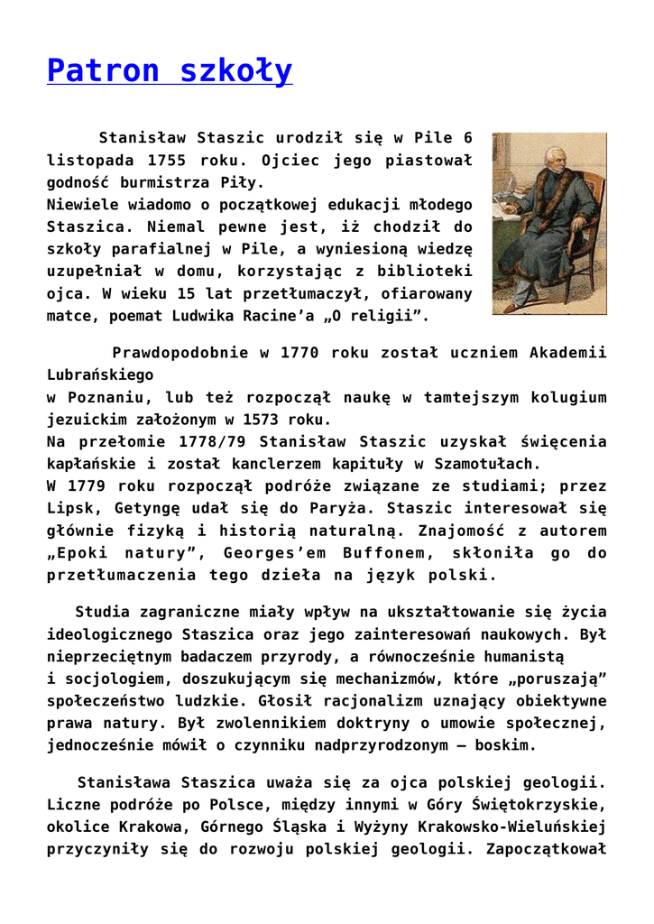 Patron szkoły Stanisław Staszic urodził się w Pile 6 listopada 1755 roku. Ojciec jego piastował godność burmistrza Piły. Niewiele wiadomo o początkowej edukacji młodego Staszica. Niemal pewne jest, iż chodził do szkoły parafialnej w Pile, a wyniesioną wiedzę uzupełniał w domu, korzystając z biblioteki ojca. W wieku 15 lat przetłumaczył, ofiarowany matce, poemat Ludwika Racine’a „O religii”. Prawdopodobnie w 1770 roku został uczniem Akademii Lubrańskiego w Poznaniu, lub też rozpoczął naukę w tamtejszym kolugium jezuickim założonym w 1573 roku. Na przełomie 1778/79 Stanisław Staszic uzyskał święcenia kapłańskie i został kanclerzem kapituły w Szamotułach. W 1779 roku rozpoczął podróże związane ze studiami; przez Lipsk, Getyngę udał się do Paryża. Staszic interesował się głównie fizyką i historią naturalną. Znajomość z autorem „Epoki natury”, Georges’em Buffonem, skłoniła przetłumaczenia tego dzieła na język polski. go do Studia zagraniczne miały wpływ na ukształtowanie się życia ideologicznego Staszica oraz jego zainteresowań naukowych. Był nieprzeciętnym badaczem przyrody, a równocześnie humanistą i socjologiem, doszukującym się mechanizmów, które „poruszają” społeczeństwo ludzkie. Głosił racjonalizm uznający obiektywne prawa natury. Był zwolennikiem doktryny o umowie społecznej, jednocześnie mówił o czynniku nadprzyrodzonym – boskim. Stanisława Staszica uważa się za ojca polskiej geologii. Liczne podróże po Polsce, między innymi w Góry Świętokrzyskie, okolice Krakowa, Górnego Śląska i Wyżyny Krakowsko-Wieluńskiej przyczyniły się do rozwoju polskiej geologii. Zapoczątkował dokładne badania zasobów naturalnych. Stworzył mapę geologiczną Polski. Był miłośnikiem Tatr i Podhala, co zaowocowało napisaniem dzieła pt. „O ziemiorództwie Karpatów i innych gór i równin Polski”. Jednym ze śladów pobytu Staszica w Tatrach jest nazwanie jego imieniem, schroniska nad Morskim Okiem. Staszic dokładnie zlokalizował złoża naturalne w Zagłębiu Staropolskim. W 1816 roku utworzył w Kielcach Szkołę Górniczą. Z jego inicjatywy powołano też Główną Dyrekcję Górniczą. Stanisław Staszic był wybitnym reformatorem doby oświecenia. Dowodem na to jest wydane w 1790 roku dzieło pt. „Przestrogi dla Polski”, w którym nawoływał do przeprowadzenia gruntownych reform w państwie. W dobie Sejmu Czteroletniego (1788-1792) działał na rzecz aktywności politycznej mieszczan. Znalazło to wyraz w „Prawach o miastach” włączonych do Konstytucji 3 Maja. Autor „Przestróg dla Polski” prowadził szeroką działalność publiczną. Był między innymi: Członkiem Sekcji Ekonomicznej i Rady Edukacyjnej (1812), był przewodniczącym Rady Głównej, utworzonego w 1816 roku uniwersytetu w Warszawie. Założył też placówkę naukowo-badawczą: Towarzystwo Przyjaciół Nauk, przez pewien czas był jej prezesem. Wielką troską było dla Stanisława Staszica młodzieży. Działając na rzecz reform wychowanie w szkolnictwie przyczynił się do udoskonalenia nauki na różnych szczeblach. Brał czynny udział w reformach wprowadzanych przez Komisję Edukacji Narodowej. Twórca szkolnictwa zawodowego mówił, że: „Dobre wychowanie dzieci jest najważniejszą sprawą kraju, gdyż od niej zależy człowieka wartość, obywatela użyteczność, ludów szczęśliwość, ukształtowanie i zacność rodzaju ludzkiego”. Około stu szkół w Polsce nosi imię Stanisława Staszica. Od 1984 roku jest również patronem Zespołu Szkół Samochodowych w Kaliszu, z czego społeczność uczniowska jest bardzo dumna. Stanisław Staszic był postacią wyjątkową, głównie dlatego, że cechowały go: bezinteresowność, pracowitość, rzetelność i konsekwencja w działaniu. Jego nowatorskie pomysły w wielu dziedzinach życia społecznego i gospodarczego budzą podziw do dzisiaj. Zmarł 20 stycznia 1826 roku w Warszawie, pochowany na Bielanach przy kościele Kamedułów. Całe swoje życie poświęcił służbie publicznej: „Był narodowi użytecznym”. Informację wytworzyła: Elżbieta Wanat Informację autoryzował: Tomasz Stępniak Aktualizacja: 15.08.2015r Patrycja Pietrzykowska
