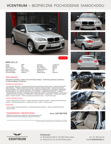 BMW X6 3.5i Marka: Model: Rok Produkcji: Pojemność silnika : Kolor Nadwozia: Skrzynia biegów: BMW X6 2010 2979 cm3 Złoty metalik Automat Przebieg : Moc silnika : Kolor Wnętrza: Rodzaj nadwozia: Ilość drzwi: Rodzaj paliwa: 112500 km 306 KM Beżowy SUV 4/5 Benzyna OPIS POJAZDU: Dokument sprzedaży: Faktura Vat 23% Rok produkcji : 2010 Data pierwszej rejestracji : 01.2010 Przebieg: 112500 km Dodatkowe Wyposażenie ✓20-calowe felgi aluminiowe ✓Automatycznie przyciemniane wewnętrzne lusterko wsteczne ✓Elektrycznie otwierana klapa bagażnika ✓Elektrycznie sterowany fotel kierowcy i pasażera z pamięcią ustawień ✓Elektrycznie sterowany hamulec postojowy ✓Elementy dekoracyjne drewniane ✓Kierownica wykończona skórą ✓Klimatyzacja automatyczna sterowana elektronicznie ✓Komputer pokładowy ✓Pakiet sportowy M ✓Podgrzewane przednie fotele ✓Reflektory BiXenonowe Aktywne ✓Spryskiwacze ciśnieniowe lamp ✓Szyberdach ✓Zawieszenie pneumatyczne ✓Tempomat ✓Czujniki parkowania tył i przód ✓Podgrzewane spryskiwacze szyby przedniej ✓Fotele sportowe BMW ✓Czujnik deszczu ✓Sportowa kierownica wielofunkcyjna ✓Napęd xDrive ✓Elektryczne szyby ✓Pakiet pamięci ✓Automatyczna skrzynia biegów ✓Skórzana tapicerka ✓Elektryczna regulacja położenia kierownicy ✓Przyciemniane szyby Systemy Bezpieczeństwa ✓System kontroli zjazdu ze wzniesienia ✓System monitorowania ciśnienia w oponach ✓Poduszka powietrzna kierowcy i pasażera ✓Poduszki przednie boczne ✓Poduszki tylne boczne ✓ISOFIX ✓Centralny zamek Multimedia ✓System nawigacji satelitarnej Professional ✓Zestaw głośnomówiący Bluetooth ✓Zestaw audio BMW Professional ✓Złącze AUX/USB FINANSOWANIE I UBEZPIECZENIA: Cena: 109 900 PLN Przykładowa rata miesięczna, wpłata 20%, okres leasingu/kredytu 48 miesięcy, 10% wykupu. Rata leasingu jest wartością netto bez vat. Niniejsza treść nie stanowi oferty w rozumieniu przepisów Kodeksu Cywilnego oraz opisu towaru ani zapewnienia w rozumieniu art. 4 Ustawy z dnia 27 lipca 2002r o szczególnych warunkach sprzedaży konsumenckiej. Powered by TCPDF (www.tcpdf.org)