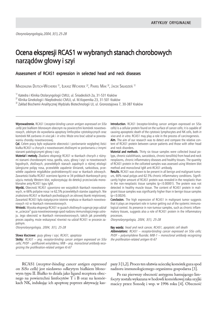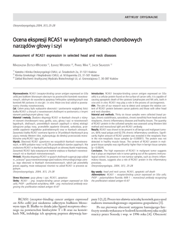 Dutsch-Wicherek M., Wicherek £., Mak P., Sk³adzieñ J.: Ocena ekspresji RCAS1 w wybranych stanach chorobowych . . . ARTYKU£ ARTYKU£YY ORYGINALNE 25 Otorynolaryngologia, 2004, 3(1), 25-28 Ocena ekspresji RCAS1 w wybranych stanach chorobowych nar z¹dów g³owy i szyi narz¹dów Assessment of RCAS1 expression in selected head and neck diseases MAGDALENA DUTSCH-WICHEREK 1/, £UKASZ WICHEREK ²/, PAWE£ MAK 3/, J ACEK SK£ADZIEÑ 1/ 1/ Katedra i Klinika Otolaryngologii CMUJ, ul. Œniadeckich 2a, 31-531 Kraków Klinika Ginekologii i Niep³odnoœci CMUJ, ul. M.Kopernika 23, 31-501 Kraków 3/ Zak³ad Biochemii Analitycznej Wydzia³u Biotechnologii UJ, ul. Gronostajowa 7, 30-387 Kraków 2/ Wprowadzenie. RCAS1 ( receptor-binding cancer antigen expressed on SiSo cells) jest bia³kiem b³onowym obecnym na powierzchni komórek nowotworowych, zdolnym do wywo³ania apoptozy limfocytów cytotoksycznych oraz komórek NK zarówno in vivo jak i in vitro. Mo¿e ono braæ udzia³ w powstawaniu choroby nowotworowej. Cel. Celem pracy by³o wykazanie obecnoœci i porównanie wzglêdnej iloœci bia³ka RCAS1 u chorych z nowotworami z³oœliwymi w porównaniu z innymi stanami patologicznymi g³owy i szyi. Materia³ i metody metody.. Zbadano ekspresjê RCAS1 w tkankach chorych z ró¿nymi stanami chorobowymi nosa, gard³a, uszu, g³owy i szyi: w nowotworach ³agodnych, z³oœliwych, przewlek³ych stanach zapalnych o ró¿nej etiologii (alergiczne polipy nosa, przewlek³e zapalenie œlinianek, sarkoidoza, przewlek³e zapalenie migda³ków podniebiennych) oraz w tkankach zdrowych. Zawartoœci bia³ka RCAS1 oceniono ³¹cznie w 34 próbkach tkankowych przy u¿yciu metody Western blot, wykorzystuj¹c do detekcji przeciwcia³a monoklonalne anty-RCAS1 typu IgM. Wyniki. Obecnoœæ RCAS1 ujawniono we wszystkich tkankach nowotworowych, w 66% polipów nosa i w 62,5% przewlek³ych stanów zapalnych. Nie znaleziono RCAS1 w tkankach pochodz¹cych ze zdrowej tkanki miêœniowej. Zawartoœæ RCAS1 by³a statystycznie istotnie wiêksza w tkankach nowotworowych ni¿ w tkankach nienowotorowych. Wnioski. Wysoka ekspresja RCAS1 w guzach z³oœliwych sugeruje jego udzia³ w „ucieczce” guza nowotworowego spod nadzoru immunologicznego ustroju. Jego obecnoœæ w tkankach nienowotworowych, takich jak przewlek³y proces zapalny, mo¿e wskazywaæ równie¿ na udzia³ RCAS1 w procesie zapalnym. Otorynolaryngologia, 2004, 3(1), 25-28 S³owa kluczowe: guzy g³owy i szyi, RCAS1, apoptoza Skróty: RCAS1 – ang. receptor-binding cancer antigen expressed on SiSo cells; PVDF – polifluorek winylidenu; MIB – ang. monoclonal antibody recognizing the proliferation-related antigen Ki-67 RCAS1 (receptor-binding cancer antigen expressed on SiSo cells) jest niedawno odkrytym bia³kiem b³onowym typu II. Bia³ko to dzia³a jako ligand receptora obecnego na powierzchni limfocytów T i B oraz na komórkach NK, indukuj¹c ich apoptozê poprzez aktywacjê kas- Introduction. RCAS1 (receptor-binding cancer antigen expressed on SiSo cells) is a cellular protein found on the surface of cancer cells; it is capable of causing apooptotic death of the cytotoxic lymphocytes and NK cells, both in vivo and in vitro. RCAS1 may play a role in the process of carcinogenesis. Aim. The aim of our research was to detect and compare the relative content of RCAS1 protein between cancer patients and those with other head and neck disorders. Material and methods. Thirty six tissue samples were collected (nasal polyps, chronic sialolithiasis, sarcoidosis, chronic tonsillitis) from head and neck neoplasms, chronic inflammatory diseases and healthy tissues. The quantity of RCAS1 protein in the collceted samples was assessed using Western blot method and monoclonal IgM anti-RCAS1 antibody. Results. RCAS1 was shown to be present in all benign and malignant tumours, 66% nasal polyps and 62.5% chronic inflammatory conditions. Significantly higher amount of RCAS1 protein was revealed in the neoplastic than in the non-neoplastic tissue samples (p<0.00001). The protein was not detected in healthy muscle tissue. The content of RCAS1 protein in malignant tissue samples was significantly higher than in benign tissue samples (p<0.0024). Conclusion. The high expression of RCAS1 in malignant tumor suggests that it plays an important role in tumor getting out of the systemic immunological control. Its presence in non-tumour samples, such as chronic inflammatory tissues, suggests also a role of RCAS1 protein in the inflammatory processes. Otorynolaryngologia, 2004, 3(1), 25-28 Key words: head and neck cancer, RCAS1, apoptotic cell death Abbreviations: RCAS1 – receptor-binding cancer expressed on SiSo cells; PVDF – polyvinylidene fluoride; MIB-1 – monoclonal antibody recognizing the proliferation-related antigen Ki-67 pazy 3 [1,2]. Proces ten u³atwia ucieczkê komórek guza spod nadzoru immunologicznego organizmu gospodarza [3]. Po raz pierwszy obecnoœæ antygenu hamuj¹cego limfocyty zosta³a wykazana w hodowli komórkowej raka szyjki macicy przez Sonodê i wsp. w 1996 roku [4]. Obecnoœæ Otorynolaryngologia, 2004, 3(1), 25-28 26 RCAS1 stwierdzono w raku p³uc, prze³yku, ¿o³¹dka, pêcherzyka ¿ó³ciowego, w¹troby, trzustki, szyjki macicy, endometrium, piersi, chorobie Hodgkina, w gruczolakach przysadki, chorobie Pageta [3,5-14]. Z og³oszonych danych wynika, ¿e ekspresja bia³ka RCAS1 koreluje ze z³ym rokowaniem co do prze¿ycia pacjentów. Wykazano korelacjê pomiêdzy obecnoœci¹ RCAS1 a stopniem zró¿nicowania nowotworu. Ekspresja RCAS1 by³a równie¿ zwi¹zana ze stopniem zaawansowania klinicznego nowotworu. Czas prze¿ycia dla grupy pacjentów RCAS1 ujemnych (guz nie wykazywa³ ekspresji RCAS1) by³ wyraŸnie d³u¿szy ni¿ dla pacjentów grupy RCAS1 dodatniej (guz posiada³ wyraŸn¹ ekspresjê RCAS1) [6,7]. Dodatkowo, wykazano ekspresjê RCAS1 w trofoblaœcie oraz ³o¿yskach oko³oporodowo i uwa¿a siê, ¿e bia³ko to bierze udzia³ w tworzeniu tolerancji im
