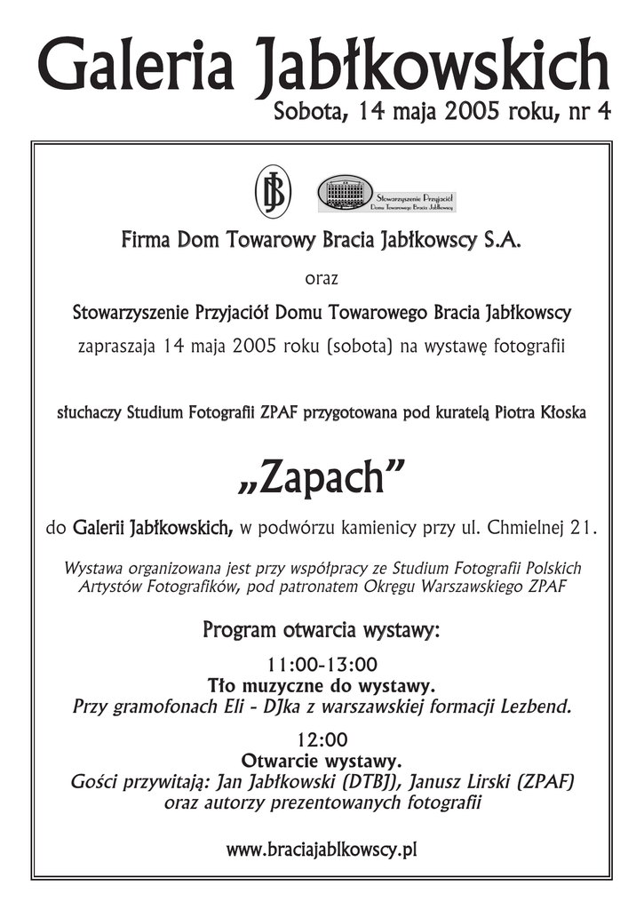 Galeria Jabłkowskich Sobota, 14 maja 2005 roku, nr 4 Firma Dom Towarowy Bracia Jabłkowscy S.A. oraz Stowarzyszenie Przyjaciół Domu Towarowego Bracia Jabłkowscy zapraszaja 14 maja 2005 roku (sobota) na wystawę fotografii słuchaczy Studium Fotografii ZPAF przygotowana pod kuratelą Piotra Kłoska „Zapach” do Galerii Jabłkowskich, w podwórzu kamienicy przy ul. Chmielnej 21. Wystawa organizowana jest przy współpracy ze Studium Fotografii Polskich Artystów Fotografików, pod patronatem Okręgu Warszawskiego ZPAF Program otwarcia wystawy: 11:00-13:00 Tło muzyczne do wystawy. Przy gramofonach Eli - DJka z warszawskiej formacji Lezbend. 12:00 Otwarcie wystawy. Gości przywitają: Jan Jabłkowski (DTBJ), Janusz Lirski (ZPAF) oraz autorzy prezentowanych fotografii www.braciajablkowscy.pl Galeria Jabłkowskich Wystawa „Zapach” Warszawa, ul. Chmielna 21 14 maja – 16 czerwca 2005 Wydarzenia kulturalne i rozrywkowe stale towarzyszyły działalności Domu Towarowego Bracia Jabłkowscy, który do roku 1950 mieścił się w budynku przy ulicy Brackiej 25. W jego podziemiach organizowano wystawy folkloru, sztuki ludowej, obrazów, grafiki i fotografii, w kawiarni występowali popularni artyści estradowi a na najwyższym piętrze odbywały się przedstawienia kukiełkowego teatrzyku dziecięcego. Korzystając z propozycji przygotowania wystawy dedykowanej przybywającej do Polski światowej sławy gwiazdy Isabelli Rossellini, grupa słuchaczy Studium Fotografii ZPAF przygotowała pod kuratelą Piotra Kłoska wystawę „Zapach”. Po raz pierwszy wystawa prezentowana była w Starej Pomarańczarni Łazienek Królewskich w listopadzie 2002. Było to niezwykłe wydarzenie, po którym Jarosław Mikołajewski napisał w Gazecie Wyborczej między innymi: Nawiązując do przedwojennej tradycji w podwórzu Kamienicy Jabłkowskich przy ulicy Chmielnej 21 od grudnia 2004 roku działa Galeria Jabłkowskich. Prezentowane w niej są zróżnicowane tematycznie wystawy fotografii. W sezonie letnim na podwórku organizowane będą również inne wydarzenia kulturalne, jak koncerty, czy projekcje filmowe. Reaktywowane zostaną również przedstawienia kukiełkowe dla najmłodszych. Patronat ZPAF dla Galerii Jabłkowskich Warszawski Okręg ZPAF obiął patronatem Galerię Jabłkowskich. Efektem współpracy Galerii ze ZPAF będzie m. in cykl wystaw młodych fotografików organizowany we współpracy ze Studium Fotografii ZPAF. Pierwsza wystawa – „Zapach”, prezentowana będzie w Galerii Jabłkowskich od 14 maja do 16 czerwcza 2005. „Do nosa przez oczy... Z problemem ilustrowania zapachu spotkałem się już w dzieciństwie. Babcia i dziadek lubili powtarzać pogróżkę: „już ja ci pokażę, czym to pachnie”. Niestety, byli ludźmi łagodnego usposobienia i nigdy swoich pogróżek nie wcielali w życie. Mówię „niestety”, bo fizyczne zetknięcie z oksymoronem zawsze jest ciekawe. Ale co się odwlecze, to nie uciecze. „Zobaczyć jak coś pachnie” miałem okazję... na wystawie fotograficznej „Zapach”. Autorzy prac: Michał Bojara, Dominika Brzozowska, Anna Czajkowska, Dagmara Frankowska – Delman, Agnieszka Janusz, Barbara Kosecka – Kroczewska, Agata Modrzejewska, Anna Edyta Przybysz, Ana Rancić – Malczewska, Marta Sinior, Szymon Staniszkis, Piotr Szukała, Paweł Walczak, Anna Wawrzkowicz, Roman Zalewski.