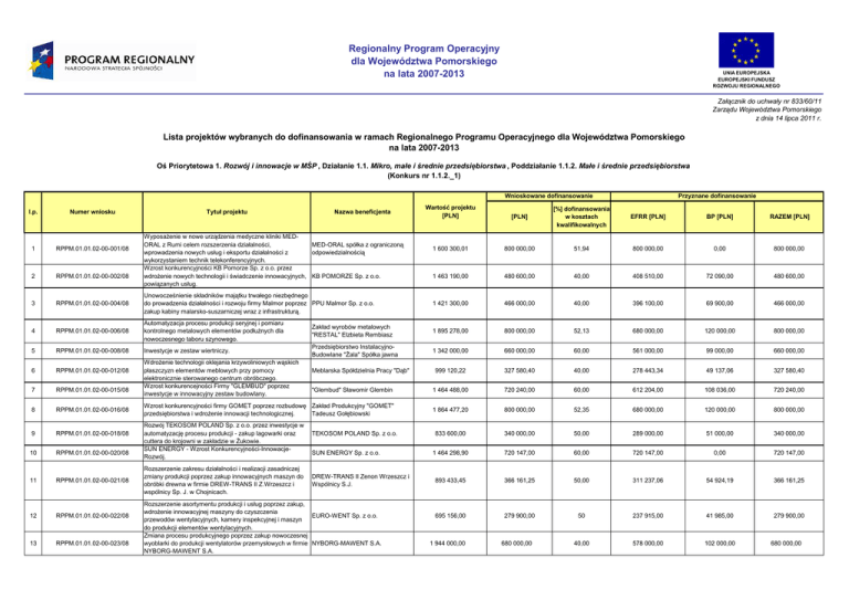 Regionalny Program Operacyjny dla Województwa Pomorskiego na lata 2007-2013 UNIA EUROPEJSKA EUROPEJSKI FUNDUSZ ROZWOJU REGIONALNEGO Załącznik do uchwały nr 833/60/11 Zarządu Województwa Pomorskiego z dnia 14 lipca 2011 r. Lista projektów wybranych do dofinansowania w ramach Regionalnego Programu Operacyjnego dla Województwa Pomorskiego na lata 2007-2013 Oś Priorytetowa 1. Rozwój i innowacje w MŚP , Działanie 1.1. Mikro, małe i średnie przedsiębiorstwa , Poddziałanie 1.1.2. Małe i średnie przedsiębiorstwa (Konkurs nr 1.1.2._1) Wnioskowane dofinansowanie [PLN] EFRR [PLN] BP [PLN] RAZEM [PLN] 1 600 300,01 800 000,00 51,94 800 000,00 0,00 800 000,00 1 463 190,00 480 600,00 40,00 408 510,00 72 090,00 480 600,00 Numer wniosku 1 RPPM.01.01.02-00-001/08 2 RPPM.01.01.02-00-002/08 3 RPPM.01.01.02-00-004/08 Unowocześnienie składników majątku trwałego niezbędnego do prowadzenia działalności i rozwoju firmy Malmor poprzez PPU Malmor Sp. z o.o. zakup kabiny malarsko-suszarniczej wraz z infrastrukturą. 1 421 300,00 466 000,00 40,00 396 100,00 69 900,00 466 000,00 4 RPPM.01.01.02-00-006/08 Automatyzacja procesu produkcji seryjnej i pomiaru kontrolnego metalowych elementów podłuŜnych dla nowoczesnego taboru szynowego. Zakład wyrobów metalowych "RESTAL" Elzbieta Rembiasz 1 895 278,00 800 000,00 52,13 680 000,00 120 000,00 800 000,00 5 RPPM.01.01.02-00-008/08 Inwestycje w zestaw wiertniczy. Przedsiębiorstwo InstalacyjnoBudowlane "śala" Spółka jawna 1 342 000,00 660 000,00 60,00 561 000,00 99 000,00 660 000,00 999 120,22 327 580,40 40,00 278 443,34 49 137,06 327 580,40 "Glembud" Sławomir Glembin 1 464 488,00 720 240,00 60,00 612 204,00 108 036,00 720 240,00 Wzrost konkurencyjności firmy GOMET poprzez rozbudowę Zakład Produkcyjny "GOMET" przedsiębiorstwa i wdroŜenie innowacji technologicznej. Tadeusz Gołębiowski 1 864 477,20 800 000,00 52,35 680 000,00 120 000,00 800 000,00 833 600,00 340 000,00 50,00 289 000,00 51 000,00 340 000,00 1 464 298,90 720 147,00 60,00 720 147,00 0,00 720 147,00 893 433,45 366 161,25 50,00 311 237,06 54 924,19 366 161,25 695 156,00 279 900,00 50 237 915,00 41 985,00 279 900,00 40,00 578 000,00 102 000,00 RPPM.01.01.02-00-012/08 7 RPPM.01.01.02-00-015/08 8 RPPM.01.01.02-00-016/08 9 RPPM.01.01.02-00-018/08 10 RPPM.01.01.02-00-020/08 11 RPPM.01.01.02-00-021/08 12 RPPM.01.01.02-00-022/08 13 RPPM.01.01.02-00-023/08 Nazwa beneficjenta Przyznane dofinansowanie [%] dofinansowania w kosztach kwalifikowalnych l.p. 6 Tytuł projektu Wartość projektu [PLN] WyposaŜenie w nowe urządzenia medyczne kliniki MEDORAL z Rumi celem rozszerzenia działalności, MED-ORAL spółka z ograniczoną wprowadzenia nowych usług i eksportu działalności z odpowiedzialnością wykorzystaniem technik telekonferencyjnych. Wzrost konkurencyjności KB Pomorze Sp. z o.o. przez wdroŜenie nowych technologii i świadczenie innowacyjnych, KB POMORZE Sp. z o.o. powiązanych usług. WdroŜenie technologii oklejania krzywoliniowych wąskich płaszczyzn elementów meblowych przy pomocy elektronicznie sterowanego centrum obróbczego. Wzrost konkurencejności Firmy "GLEMBUD" poprzez inwestycje w innowacyjny zestaw budowlany. Rozwój TEKOSOM POLAND Sp. z o.o. przez inwestycje w automatyzację procesu produkcji - zakup lagowarki oraz cuttera do krojowni w zakładzie w śukowie. SUN ENERGY - Wzrost Konkurencyjności-InnowacjeRozwój. Rozszerzenie zakresu działalności i realizacji zasadniczej zmiany produkcji poprzez zakup innowacyjnych maszyn do obróbki drewna w firmie DREW-TRANS II Z.Wrzeszcz i wspólnicy Sp. J. w Chojnicach. Meblarska Spółdzielnia Pracy "Dąb" TEKOSOM POLAND Sp. z o.o. SUN ENERGY Sp. z o.o. DREW-TRANS II Zenon Wrzeszcz i Wspólnicy S.J. Rozszerzenie asortymentu produkcji i usług poprzez zakup, wdroŜenie innowacyjnej maszyny do czyszczenia EURO-WENT Sp. z o.o. przewodów wentylacyjnych, kamery inspekcyjnej i maszyn do produkcji elementów wentylacyjnych. Zmiana procesu produkcyjnego poprzez zakup nowoczesnej wyoblarki do produkcji wentylatorów przemysłowych w firmie NYBORG-MAWENT S.A. NYBORG-MAWENT S.A. 1 944 000,00 680 000,00 680 000,00 Wnioskowane dofinansowanie Nazwa beneficjenta Przyznane dofinansowanie [PLN] [%] dofinansowania w kosztach kwalifikowalnych EFRR [PLN] BP [PLN] RAZEM [PLN] 436 882,00 179 050,00 50,00 179 050,00 0,00 179 050,00 1 056 017,36 432 794,00 50,00 367 874,90 64 919,10 432 794,00 597 098,50 293 655,00 60,00 249 606,75 44 048,25 293 655,00 1 091 443,33 536 775,41 60,00 456 259,10 80 516,31 536 775,41 2 501 000,00 800 000,00 39,02 680 000,00 120 000,00 800 000,00 2 205 760,00 795 520,00 44,00 676 192,00 119 328,00 795 520,00 1 371 280,00 449 600,00 40,00 382 160,00 67 440,00 449 600,00 ECLISSE Polska Sp. z o.o. 1 355 115,00 444 300,00 40,00 444 300,00 0,00 444 300,00 MGB Przedsiębiorstwo HandlowoUsługowe Grzegorz Banaszak 2 754 150,00 799 988,10 35,44 679 989,89 119 998,22 799 988,10 Przedsiębiorstwo WielobranŜowe "TADPOL" - Tadeusz Polniak 1 051 749,80 431 045,00 50,00 366 388,25 64 656,75 431 045,00 METROX-PLAST Spółka z ograniczoną odpowiedzialnością 1 825 120,00 748 000,00 50,00 748 000,00 0,00 748 000,00 Gdańskie Zakłady RemontowoMontaŜowe GZRM Sp. z o.o. 580 207,00 200 000,00 42,87 170 000,00 30 000,00 200 000,00 1 215 260,00 391 024,30 40,00 332 370,66 58 653,65 391 024,30 l.p. Numer wniosku 14 RPPM.01.01.02-00-024/08 Rozszerzenie zakresu działalności eksportowej poprzez zastosowanie nowych rozwiązań technologicznych w produkcji oraz wprowadzenie nowych produktów na rynek. "BENOX" B.KASZUBOWSKI Spółka Jawna 15 RPPM.01.01.02-00-025/08 Unowocześnienie procesów produkcji i modernizacji niskospadowych elektrowni wodnych poprzez inwestycje. ZRE Gdańsk Sp. z o.o. 16 RPPM.01.01.02-00-026/08 Rozbudowa bazy hotelowej i podwyŜszenie standardu świadczonych usług hotelarskich. MIKS ELEKTRONIK Sp. z o.o. 17 RPPM.01.01.02-00-028/08 Unowocześnienie parku maszynowego firmy niezbędnego do Trakt Przedsiębiorstwo D