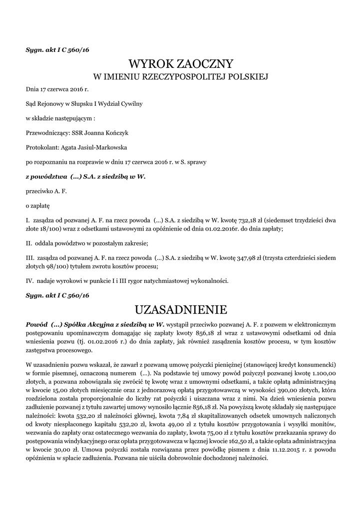 Sygn. akt I C 560/16 WYROK ZAOCZNY W IMIENIU RZECZYPOSPOLITEJ POLSKIEJ Dnia 17 czerwca 2016 r. Sąd Rejonowy w Słupsku I Wydział Cywilny w składzie następującym : Przewodniczący: SSR Joanna Kończyk Protokolant: Agata Jasiul-Markowska po rozpoznaniu na rozprawie w dniu 17 czerwca 2016 r. w S. sprawy z powództwa (...) S.A. z siedzibą w W. przeciwko A. F. o zapłatę I. zasądza od pozwanej A. F. na rzecz powoda (...) S.A. z siedzibą w W. kwotę 732,18 zł (siedemset trzydzieści dwa złote 18/100) wraz z odsetkami ustawowymi za opóźnienie od dnia 01.02.2016r. do dnia zapłaty; II. oddala powództwo w pozostałym zakresie; III. zasądza od pozwanej A. F. na rzecz powoda (...) S.A. z siedzibą w W. kwotę 347,98 zł (trzysta czterdzieści siedem złotych 98/100) tytułem zwrotu kosztów procesu; IV. nadaje wyrokowi w punkcie I i III rygor natychmiastowej wykonalności. Sygn. akt I C 560/16 UZASADNIENIE Powód (...) Spółka Akcyjna z siedzibą w W. wystąpił przeciwko pozwanej A. F. z pozwem w elektronicznym postępowaniu upominawczym domagając się zapłaty kwoty 856,18 zł wraz z ustawowymi odsetkami od dnia wniesienia pozwu (tj. 01.02.2016 r.) do dnia zapłaty, jak również zasądzenia kosztów procesu, w tym kosztów zastępstwa procesowego. W uzasadnieniu pozwu wskazał, że zawarł z pozwaną umowę pożyczki pieniężnej (stanowiącej kredyt konsumencki) w formie pisemnej, oznaczoną numerem (...). Na podstawie tej umowy powód pożyczył pozwanej kwotę 1.100,00 złotych, a pozwana zobowiązała się zwrócić tę kwotę wraz z umownymi odsetkami, a także opłatą administracyjną w kwocie 15,00 złotych miesięcznie oraz z jednorazową opłatą przygotowawczą w wysokości 390,00 złotych, która rozdzielona została proporcjonalnie do liczby rat pożyczki i uiszczana wraz z nimi. Na dzień wniesienia pozwu zadłużenie pozwanej z tytułu zawartej umowy wynosiło łącznie 856,18 zł. Na powyższą kwotę składały się następujące należności: kwota 532,20 zł należności głównej, kwota 7,84 zł skapitalizowanych odsetek umownych naliczonych od kwoty niespłaconego kapitału 532,20 zł, kwota 49,00 zł z tytułu kosztów przygotowania i wysyłki monitów, wezwania do zapłaty oraz ostatecznego wezwania do zapłaty, kwota 75,00 zł z tytułu kosztów przekazania sprawy do postępowania windykacyjnego oraz opłata przygotowawcza w łącznej kwocie 162,50 zł, a także opłata administracyjna w kwocie 30,00 zł. Umowa pożyczki została rozwiązana przez powódkę pismem z dnia 11.12.2015 r. z powodu opóźnienia w spłacie zadłużenia. Pozwana nie uiściła dobrowolnie dochodzonej należności. Postanowieniem z dnia 12.02.2016 r., sygn VI Nc-e 172728/16, Sąd Rejonowy Lublin – Zachód w Lublinie, VI Wydział Cywilny wobec stwierdzonego braku podstaw do wydania nakazu zapłaty, przekazał sprawę do rozpoznania tut. Sądowi (k. 4 verte) . Pozwana A. F. nie złożyła odpowiedzi na pozew, ani nie stawiła się na rozprawie w dniu 17.06.2016 r. Sąd przyjął za prawdziwe następujące twierdzenia powoda: W dniu 16.03.2015 r. A. F. zawarła z (...) Spółką Akcyjną z siedzibą w W. umowę pożyczki numer (...) w formie pisemnej. Zgodnie z umową (...) Spółką Akcyjną z siedzibą w W. pożyczyła A. K. kwotę 1.100,00 zł. Pożyczka została udzielona na okres 12 miesięcy. Pozwana była zobowiązana zwrócić kwotę pożyczki poprzez spłatę rat kapitałowych i odsetek, powiększonych o opłatę administracyjną i opłatę przygotowawczą oraz ewentualne koszty dodatkowe na rachunek pożyczkodawcy w 12 miesięcznych ratach w terminach płatności określonych zgodnie z umowa i zgodnie z harmonogramem. W związku z zawarciem umowy pożyczkodawca naliczył opłatę przygotowawczą w kwocie 390,00 zł, która została rozdzielona proporcjonalnie do liczby rat pożyczki i miała być uiszczana przez A. F. łącznie z nimi. Zgodnie z umową opłata przygotowawcza obejmowała poniesione przez pożyczkodawcę koszty czynności związanych z przygotowaniem umowy pożyczki, na które składały się m.in. koszty obsługi dostarczenia i podpisania umowy u klienta oraz badanie jego zdolności kredytowej. Do każdej raty pożyczki została doliczona również opłata administracyjna w kwocie 15,00 zł, która zgodnie z umową miała pokrywać koszty czynności związanych z zarządzaniem kontem umowy pożyczki, monitorowaniem terminowości obsługi pożyczki, obsługą wniosków klienta, a także usług w centrum kontaktowym oraz wysyłki komunikatów SMS. Opłata administracyjna miała być uiszczana przez wraz z każdą ratą miesięczną. W punkcie 13 umowy zastrzeżono, że w przypadku opóźnienia klienta w spłacie rat pożyczki, pożyczkodawca jest uprawniony do podjęcia działań upominawczo – windykacyjnych, których koszt każdorazowo ponosi klient w wysokości: za przygotowanie i wysyłkę jednego monitu – 25,00 zł, za przygotowanie i wysyłkę wezwania do zapłaty 49,00 zł, za przygotowanie i wysyłkę ostatecznego wezwania do zapłaty 49,00 zł, za przekazanie sprawy do postępowania windykacyjnego w 75,00 zł. Okoliczność przyznana, nadto: umowa z dnia 21.04.2015 r. nr (...) k. 18-23 (...) Spółka Akcyjną z siedzibą w W. skierował do A. F. monit, wezwanie do zapłaty, ostateczne wezwanie do zapłaty, a pismem z dnia 11.12.2015 roku wypowiedziała umowę pożyczki i skierowała sprawę do postępowania windykacyjnego. Okoliczność przyznana, nadto: monit k. 26, wezwanie do zapłaty k. 27, ostateczne wezwanie do zapłaty k. 28, pismo z dnia 11.12.2015 r. k. 29, dowód nadania k. 30 Sąd zważył, co następuje: Jeżeli pozwany nie stawił się na posiedzenie wyznaczone na rozprawę albo mimo stawienia się nie bierze udziału w rozprawie, sąd wyda wyrok zaoczny. W tym wypadku przyjmuje się za prawdziwe twierdzenia powoda o okolicznościach faktycznych przytoczonych w pozwie lub w pismach procesowych doręczonych pozwanemu przed rozprawą, 