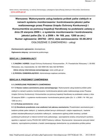 Strona 1 z 8 Adres strony internetowej, na której Zamawiający udostępnia Specyfikację Istotnych Warunków Zamówienia: www.uokik.gov.pl Warszawa: Wykonywanie usług badania próbek paliw ciekłych w ramach systemu monitorowania i kontrolowania jakości paliw realizowanego przez Prezesa Urzędu Ochrony Konkurencji i Konsumentów za pomocą Inspekcji Handlowej na podstawie ustawy z dnia 25 sierpnia 2006 r. o systemie monitorowania i kontrolowania jakości paliw (Dz. U. z 2006 r. Nr 169, poz. 1200 ze zm.) Numer ogłoszenia: 285782 - 2012; data zamieszczenia: 03.08.2012 OGŁOSZENIE O ZAMÓWIENIU - usługi Zamieszczanie ogłoszenia: obowiązkowe. Ogłoszenie dotyczy: zamówienia publicznego. SEKCJA I: ZAMAWIAJĄCY I. 1) NAZWA I ADRES: Urząd Ochrony Konkurencji i Konsumentów , Pl. Powstańców Warszawy 1, 00-950 Warszawa, woj. mazowieckie, tel. 022 5560129, faks 022 8270843. Adres strony internetowej zamawiającego: www.uokik.gov.pl I. 2) RODZAJ ZAMAWIAJĄCEGO: Administracja rządowa centralna. SEKCJA II: PRZEDMIOT ZAMÓWIENIA II.1) OKREŚLENIE PRZEDMIOTU ZAMÓWIENIA II.1.1) Nazwa nadana zamówieniu przez zamawiającego: Wykonywanie usług badania próbek paliw ciekłych w ramach systemu monitorowania i kontrolowania jakości paliw realizowanego przez Prezesa Urzędu Ochrony Konkurencji i Konsumentów za pomocą Inspekcji Handlowej na podstawie ustawy z dnia 25 sierpnia 2006 r. o systemie monitorowania i kontrolowania jakości paliw (Dz. U. z 2006 r. Nr 169, poz. 1200 ze zm.). II.1.2) Rodzaj zamówienia: usługi. II.1.3) Określenie przedmiotu oraz wielkości lub zakresu zamówienia: Przedmiotem zamówienia jest: badanie próbek paliw ciekłych, tj. badanie próbek benzyn silnikowych i olejów napędowych, -badanie próbek niezidentyfikowanych produktów naftowych, -zestawienie ogólnej próbki średniej z próbek punktowych pobranych w trakcie kontroli hurtu paliwowego, -sporządzenie analizy otrzymanych wyników, zgodnie z zapisami normy PN-EN ISO 4259 Przetwory naftowe. Wyznaczanie i stosowanie precyzji metod badania, -sporządzenie protokołu z badań zawierającego stwierdzenie czy przebadana próbka paliwa http://bzp0.portal.uzp.gov.pl/index.php?ogloszenie=show&pozycja=285782&rok=20... 2012-08-03 Strona 2 z 8 spełnia wymagania jakościowe określone w rozporządzeniu w sprawie wymagań jakościowych dla paliw ciekłych. 1.1. Badanie próbek musi być wykonywane zgodnie z postanowieniami: a)ustawy z dnia 25 sierpnia 2006 roku o systemie monitorowania i kontrolowania jakości paliw (Dz. U. z 2006 r. Nr 169, poz. 1200, z późn. zm.); b)ustawy z dnia 15 grudnia 2000 r. o Inspekcji Handlowej (tj. Dz. U. z 2009 r. Nr 151, poz. 1219, z późn. zm.); c)rozporządzenia Prezesa Rady Ministrów z dnia 27 kwietnia 2012 r. w sprawie szczegółowego trybu pobierania i badania próbek produktów przez organy Inspekcji Handlowej (Dz. U. z. 2012 r. Nr 57, poz. 496); d) rozporządzenia Ministra Gospodarki z dnia 9 grudnia 2008 r. w sprawie wymagań jakościowych dla paliw ciekłych (Dz. U. z 2008 r. Nr 221, poz. 1441, z późn. zm.); e) rozporządzenia Ministra Gospodarki z dnia 25 marca 2010 r. w sprawie metod badania jakości paliw ciekłych (Dz. U. z 2010 Nr. 55, poz. 332). 1.2. Próbki paliw ciekłych, których badanie pod względem spełniania wymagań jakościowych stawianych w odpowiednim rozporządzeniu jest przedmiotem zamówienia, będą pobierane na terenie Polski. Badanie próbek paliw poprzedza ich dostarczenie przez inspektora Inspekcji Handlowej do laboratorium i ich przyjęcie potwierdzone protokołem przyjęcia próbki do badań (w sposób określony w Istotnych postanowieniach umowy stanowiących Załącznik Nr 8 do SIWZ). 1.3 Parametry jakościowe benzyn silnikowych oraz oleju napędowego, a także metody ich badań określone w ww. rozporządzeniach zostały zamieszczone w Załącznikach Nr 5a i 5b do SIWZ. Wszystkie badania parametrów jakościowych paliw ciekłych muszą być wykonywane akredytowanymi metodami badania określonymi w rozporządzeniu w sprawie metod badania jakości paliw ciekłych przez akredytowane laboratoria. 1.4. Zamawiający wymaga, aby każde sprawozdanie z badań było opatrzone symbolem akredytacji PCA zgodnie z wymogami wynikającymi z dokumentu PCA nr DA-02 Zasady stosowania symboli akredytacji PCA wydanego przez Polskie Centrum Akredytacji. 1.5. Pobrane próbki paliw ciekłych będą badane w dwóch systemach, tzw. systemie europejskim oraz w tzw. pozostałych kontrolach. Zakres badań w systemie europejskim i w ramach pozostałych kontroli będzie określany przez Urząd Ochrony Konkurencji i Konsumentów na podstawie aktualnych wymagań kontrolnych i rynkowych. 1.6. Szacunkowa minimalna ilość próbek paliw, które Zamawiający planuje przekazać w celu ich zbadania do 31 grudnia 2012 r. wynosi łącznie 120 próbek. Natomiast przewidywana, szacunkowa, maksymalna ilość próbek, która może zostać przekazana do badań laboratoryjnych wynosi 240 próbek (IPmax). Wykonawcy nie przysługują żadne roszczenia wobec Zamawiającego w przypadku przekazania mniejszej ilości próbek paliw ciekłych od określonych przez Zamawiającego. 1.7. Laboratorium, do którego będą dostarczane próbki paliw ciekłych do zbadania, powinno znajdować się na terenie jednego z województw: dolnośląskie, opolskie, śląskie, małopolskie, podkarpackie, łódzkie, świętokrzyskie, mazowieckie. 1.8. Badania próbek ww. paliw muszą być wykonywane z zastosowaniem akredytowanych metod badania określonych w ww. rozporządzeniu Ministra Gospodarki z dnia 25 marca 2010 r. w sprawie metod badania jakości paliw ciekłych (Dz. U. z 2010 Nr. 55, poz. 332). Protokół z wykonanego badania wykonawca zobowiązany jest dostarczyć Zamawiającemu w terminie 3 dni roboczych licząc od dnia następnego po dniu przyjęcia próbek paliw do badań. Zamawiający wymaga, aby dostarczony protokół był sporządzony wyłącznie w języku http://bzp0.portal.uzp.gov.pl/index.php?ogl