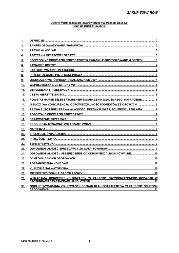 ZAKUP TOWARÓW Ogólne warunki zakupu towarów przez VW Poznań Sp. z o.o. (Stan na dzień 11.03.2016) 1. DEFINICJE................................................................................................................................................... 2 2. ZAKRES OBOWIĄZYWANIA WARUNKÓW .............................................................................................. 2 3. PRAWO WŁAŚCIWE ................................................................................................................................... 2 4. ZAPYTANIA OFERTOWE I OFERTY .......................................................................................................... 3 5. SZCZEGÓLNE OBOWIĄZKI SPRZEDAWCY W ZWIĄZKU Z PRZYGOTOWANIEM OFERTY ................ 3 6. ZAWARCIE UMOWY ................................................................................................................................... 4 7. FAKTURY; WARUNKI PŁATNOŚCI ........................................................................................................... 4 8. PRZESTRZEGANIE PRZEPISÓW PRAWA ................................................................................................ 4 9. OBOWIĄZEK WSPÓŁPRACY; REALIZACJA UMOWY ............................................................................ 4 10. WSPÓŁDZIAŁANIE ZE STRONY VWP ...................................................................................................... 5 11. UTRUDNIENIA I PRZESZKODY ................................................................................................................. 5 12. CESJA WIERZYTELNOŚCI ........................................................................................................................ 5 13. POWSTRZYMANIE SIĘ ZE SPEŁNIENIEM ŚWIADCZENIA WZAJEMNEGO. POTRĄCENIE ................. 5 14. NIEUCZCIWA KONKURENCJA. ODPOWIEDZIALNOŚĆ PODMIOTÓW ZBIOROWYCH. ....................... 5 15. PRAWA AUTORSKIE I PRAWA WŁASNOŚCI PRZEMYSŁOWEJ; POUFNOŚĆ; REKLAMA ................. 6 16. POZOSTAŁE OBOWIĄZKI SPRZEDAWCY ............................................................................................... 7 17. SPRAWDZENIE PRZEZ VWP ..................................................................................................................... 8 18. PRODUKCJA TOWARÓW; ZGŁASZANIE ZMIAN ..................................................................................... 8 19. NARZĘDZIA................................................................................................................................................. 8 20. SPEŁNIENIE ŚWIADCZENIA ...................................................................................................................... 8 21. PRZEJŚCIE RYZYKA .................................................................................................................................. 9 22. TERMINY; ZWŁOKA ................................................................................................................................... 9 23. ODPOWIEDZIALNOŚĆ SPRZEDAWCY ZA WADY TOWARÓW .............................................................. 9 24. ODPOWIEDZIALNOŚĆ / UBEZPIECZENIE OD ODPOWIEDZIALNOŚCI CYWILNEJ ............................ 10 25. OCHRONA DANYCH OSOBOWYCH ....................................................................................................... 10 26. POSTANOWIENIA KOŃCOWE................................................................................................................. 10 27. KLAUZULA SALWATORYJNA................................................................................................................. 10 28. MIEJSCE WYKONANIA. SĄD WŁAŚCIWY .............................................................................................. 10 29. WYMAGANIA KONCERNU VOLKSWAGEN W ZAKRESIE ZRÓWNOWAŻONEGO ROZWOJU W STOSUNKACH Z PARTNERAMI HANDLOWYMI .................................................................................... 11 30. OGÓLNE WYMAGANIA VOLKSWAGEN POZNAŃ DLA KONTRAHENTÓW W ZAKRESIE OCHRONY ŚRODOWISKA .......................................................................................................................................... 11 Stan na dzień 11.03.2016 1 ZAKUP TOWARÓW Ogólne warunki zakupu towarów przez Volkswagen Poznań Sp. z o.o. (Stan na dzień 11.03.2016) wersja Warunków doręczona zostanie Sprzedawcy przed zawarciem umowy. Aktualna wersja Warunków dostępna będzie w każdym czasie w wersji elektronicznej pod adresem: 1. www.volkswagen-poznan.pl Definicje Ilekroć w niniejszych ogólnych warunkach zakupu towarów przez Volkswagen Poznań Sp. z o.o. (VWP) używa się wskazanych poniżej pojęć, należy przez to rozumieć: 1.1 2.3 Jeżeli VWP i Sprzedawca na piśmie nie postanowili inaczej, wyłączone jest stosowanie wszelkich wzorców umów Sprzedawcy. Wzorców umów Sprzedawcy nie stosuje się również wówczas, gdy VWP nie zgłosiła wobec ich włączenia wyraźnego sprzeciwu. Przyjęcie towarów przez VWP bez wyraźnego zastrzeżenia lub dokonanie przez VWP płatności za zakupione towary bez sprzeciwu, w żadnym razie nie oznacza akceptacji wzorców umów Sprzedawcy. Do włączenia do umowy Zakupu towarów jakiegokolwiek wzorca umowy Sprzedawcy lub uznawania jego obowiązywania, choćby w części, pracownicy VWP nie mają umocowania, chyba, że co innego wyraźnie wynika z ich pełnomocnictwa. Warunki Warunkami są niniejsze ogólne warunki zakupu towarów przez VWP. 1.2 Towary Towarami są wszelkie rzeczy ruchome jak również wszelkie postaci energii, wody oraz pary. 1.3 Zakup towarów Zakup towarów oznacza sprzedaż, dostawę lub inną umowę, na podstawie, której VWP nabywa własność towarów, za wyjątkiem umów o świadczenie usług, umów o roboty budowlane i umów, których przedmiotem jest zaprojektowanie, wyprodukowanie i dostarczenie urządzeń. Za umowę uważa się r