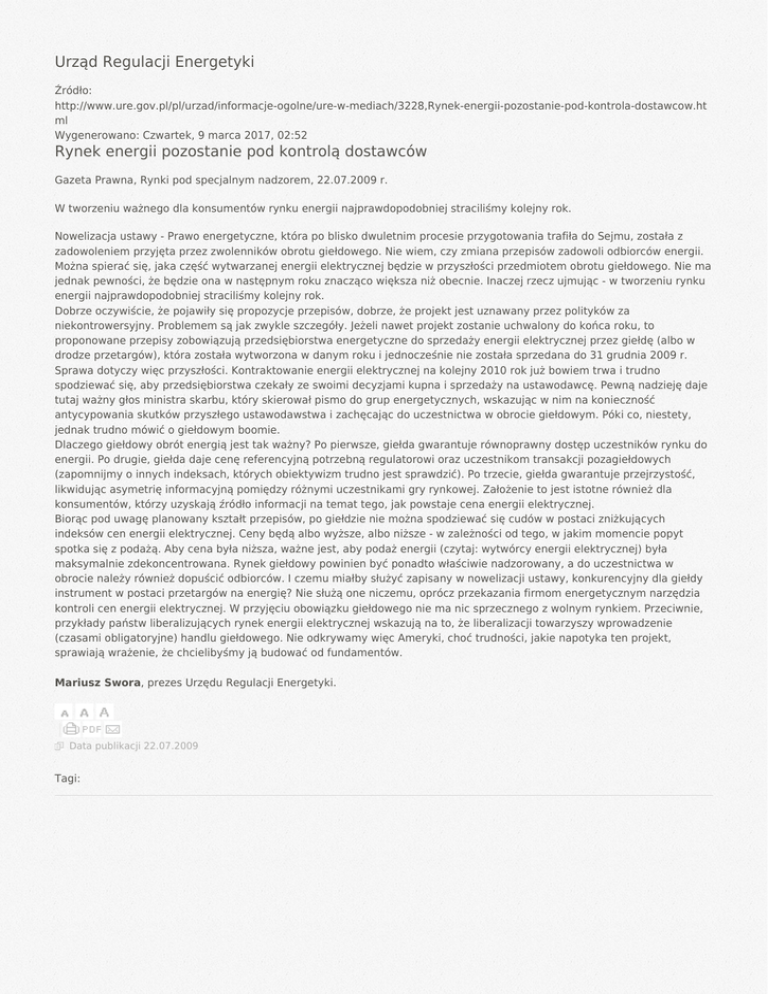 Urząd Regulacji Energetyki Źródło: http://www.ure.gov.pl/pl/urzad/informacje-ogolne/ure-w-mediach/3228,Rynek-energii-pozostanie-pod-kontrola-dostawcow.ht ml Wygenerowano: Czwartek, 9 marca 2017, 02:52 Rynek energii pozostanie pod kontrolą dostawców Gazeta Prawna, Rynki pod specjalnym nadzorem, 22.07.2009 r. W tworzeniu ważnego dla konsumentów rynku energii najprawdopodobniej straciliśmy kolejny rok. Nowelizacja ustawy - Prawo energetyczne, która po blisko dwuletnim procesie przygotowania trafiła do Sejmu, została z zadowoleniem przyjęta przez zwolenników obrotu giełdowego. Nie wiem, czy zmiana przepisów zadowoli odbiorców energii. Można spierać się, jaka część wytwarzanej energii elektrycznej będzie w przyszłości przedmiotem obrotu giełdowego. Nie ma jednak pewności, że będzie ona w następnym roku znacząco większa niż obecnie. Inaczej rzecz ujmując - w tworzeniu rynku energii najprawdopodobniej straciliśmy kolejny rok. Dobrze oczywiście, że pojawiły się propozycje przepisów, dobrze, że projekt jest uznawany przez polityków za niekontrowersyjny. Problemem są jak zwykle szczegóły. Jeżeli nawet projekt zostanie uchwalony do końca roku, to proponowane przepisy zobowiązują przedsiębiorstwa energetyczne do sprzedaży energii elektrycznej przez giełdę (albo w drodze przetargów), która została wytworzona w danym roku i jednocześnie nie została sprzedana do 31 grudnia 2009 r. Sprawa dotyczy więc przyszłości. Kontraktowanie energii elektrycznej na kolejny 2010 rok już bowiem trwa i trudno spodziewać się, aby przedsiębiorstwa czekały ze swoimi decyzjami kupna i sprzedaży na ustawodawcę. Pewną nadzieję daje tutaj ważny głos ministra skarbu, który skierował pismo do grup energetycznych, wskazując w nim na konieczność antycypowania skutków przyszłego ustawodawstwa i zachęcając do uczestnictwa w obrocie giełdowym. Póki co, niestety, jednak trudno mówić o giełdowym boomie. Dlaczego giełdowy obrót energią jest tak ważny? Po pierwsze, giełda gwarantuje równoprawny dostęp uczestników rynku do energii. Po drugie, giełda daje cenę referencyjną potrzebną regulatorowi oraz uczestnikom transakcji pozagiełdowych (zapomnijmy o innych indeksach, których obiektywizm trudno jest sprawdzić). Po trzecie, giełda gwarantuje przejrzystość, likwidując asymetrię informacyjną pomiędzy różnymi uczestnikami gry rynkowej. Założenie to jest istotne również dla konsumentów, którzy uzyskają źródło informacji na temat tego, jak powstaje cena energii elektrycznej. Biorąc pod uwagę planowany kształt przepisów, po giełdzie nie można spodziewać się cudów w postaci zniżkujących indeksów cen energii elektrycznej. Ceny będą albo wyższe, albo niższe - w zależności od tego, w jakim momencie popyt spotka się z podażą. Aby cena była niższa, ważne jest, aby podaż energii (czytaj: wytwórcy energii elektrycznej) była maksymalnie zdekoncentrowana. Rynek giełdowy powinien być ponadto właściwie nadzorowany, a do uczestnictwa w obrocie należy również dopuścić odbiorców. I czemu miałby służyć zapisany w nowelizacji ustawy, konkurencyjny dla giełdy instrument w postaci przetargów na energię? Nie służą one niczemu, oprócz przekazania firmom energetycznym narzędzia kontroli cen energii elektrycznej. W przyjęciu obowiązku giełdowego nie ma nic sprzecznego z wolnym rynkiem. Przeciwnie, przykłady państw liberalizujących rynek energii elektrycznej wskazują na to, że liberalizacji towarzyszy wprowadzenie (czasami obligatoryjne) handlu giełdowego. Nie odkrywamy więc Ameryki, choć trudności, jakie napotyka ten projekt, sprawiają wrażenie, że chcielibyśmy ją budować od fundamentów. Mariusz Swora, prezes Urzędu Regulacji Energetyki. Data publikacji 22.07.2009 Tagi: