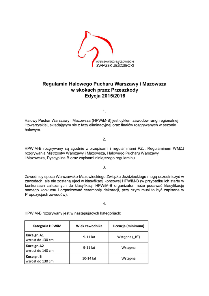 Regulamin Halowego Pucharu Warszawy i Mazowsza w skokach przez Przeszkody Edycja 2015/2016 1. Halowy Puchar Warszawy i Mazowsza (HPWiM-B) jest cyklem zawodów rangi regionalnej i towarzyskiej, składającym się z fazy eliminacyjnej oraz finałów rozgrywanych w sezonie halowym. 2. HPWiM-B rozgrywany są zgodnie z przepisami i regulaminami PZJ, Regulaminem WMZJ rozgrywania Mistrzostw Warszawy i Mazowsza, Halowego Pucharu Warszawy i Mazowsza, Dyscyplina B oraz zapisami niniejszego regulaminu. 3. Zawodnicy spoza Warszawsko-Mazowieckiego Związku Jeździeckiego mogą uczestniczyć w zawodach, ale nie zostaną ujęci w klasyfikacji końcowej HPWiM-B (w przypadku ich startu w konkursach zaliczanych do klasyfikacji HPWiM-B organizator może podawać klasyfikację samego konkursu i organizować ceremonię dekoracji, przy czym musi to być zapisane w Propozycjach zawodów). 4. HPWiM-B rozgrywany jest w następujących kategoriach: Kategoria HPWiM Wiek zawodnika Licencja (minimum) Kuce gr. A1 wzrost do 130 cm 9-11 lat Wstępna („B”) Kuce gr. A2 wzrost do 148 cm 9-11 lat Wstępna Kuce gr. B wzrost do 130 cm 10-14 lat Wstępna Kuce gr. C wzrost do 140 cm 11-16 lat Wstępna Kuce gr. D bis wzrost do 148 cm 11-16 lat III Małe Konie gr. E wzrost do 156 cm 12-21 lat III Amatorzy od 9 lat tylko niezarejestrowani lub z Licencją Wstępną Dzieci II 11-14 lat Wstępna Zawodnicy z III licencją od 9 lat tylko III licencja Juniorzy Młodsi DK 12-15 lat III Juniorzy 14-18 lat III Młodzi Jeźdźcy 16-21 lat III Seniorzy od 18 lat II 5. Zawodnik może startować jednocześnie w różnych kategoriach (na innych koniach), zachowując warunki uczestnictwa w poszczególnych kategoriach oraz limit startów odpowiedni do wieku zawodnika (Młodzik 9-11 lat – 4 starty; Dzieci II 11-14 lat, Junior Młodszy DK 12-15 lat – 6 startów, pozostali bez ograniczeń). 6. Zawodnik może startować w jednej kategorii na dwóch koniach, z tym, że przed rozpoczęciem konkursu finałowego musi wskazać konia startującego w finale. Na drugim koniu może w dniu finału startować w konkursie dodatkowym lub ewentualnie w konkursie finałowym w specjalnej serii B poza klasyfikacją HPWiM-B. 7. Odbędą się w odrębnych terminach dwa finały: HPMWiM-B KiMK (Kuce i Małe Konie) + Amatorzy oraz HPWiM-B DK (Duże Konie). Zawodnicy mogą startować w obu imprezach na tym samym/ych koniu/ach, na warunkach określonych w Propozycjach zawodów. Kuc i Mały Koń startujący w HPMWiM-B DK startuje na warunkach przewidzianych dla dużych koni i nie przysługuje mu zmiana odległości dostosowująca je dla wzrostu kuca/małego konia. 8. Kalendarz zawodów eliminacyjnych i finałów HPWiM-B 2016 zatwierdzony przez Zarząd Warszawsko-Mazowieckiego Związku Jeździeckiego: 29.11 I eliminacja SKJ Poczernin 20.12 II eliminacja KJ Aromer Józefin 23.01 III eliminacja SKJ Poczernin 31.01 IV eliminacja KJ Aromer Józefin 20.02 V eliminacja SKJ Poczernin ? Finał DK KJ Aromer Józefin *) ? Finał KiMK + Amatorzy KJ Aromer Józefin *) *) Zawody finałowe - trzydniowe w marcu - terminy zostaną uzupełnione po zatwierdzeniu kalendarza 2016 PZJ i WMZJ 9. Zasady punktacji rankingowej: 1. W zawodach eliminacyjnych HPWiM-B zawodnicy zdobywają w danej kategorii punkty bonifikacyjne w następującej wysokości: I m-ce II m-ce III m-ce Kolejne m-ca 30 pkt 29 pkt 28 pkt Punkt mniej 2. W przypadku, gdy w konkursie eliminacyjnym danej kategorii HPWiM-B wystartuje mniejsza liczba zawodników niż 30, za pierwsze miejsce przyznane zostanie tyle punktów ile będzie startujących zawodników, a za kolejne miejsca zawodnicy otrzymają o jeden punkt mniej. 3. Do końcowej łącznej klasyfikacji eliminacji HPWiM-B zaliczone będą maksymalnie 3 najlepsze wyniki (na 5 możliwych startów w eliminacjach). 4. W zawodach finałowych HPWiM-B punkty bonifikacyjne przyznawane będą zgodnie z zasadami z pkt. 1 i 2., przy czym: - w piątkowym i sobotnim półfinale bez mnożnika, - w niedzielnym konkursie dwunawrotowym z mnożnikiem x 2. 10. Klasyfikacja HPWiM-B: 1. Wynikiem końcowym HPWiM-B jest suma punktów bonifikacyjnych z eliminacji oraz zawodów finałowych. 2. W przypadku równej liczby punktów w klasyfikacji końcowej o kolejności zajętych miejsc decydują wyniki niedzielnego konkursu finałowego. 3. Zawodnicy, którzy punktowali w eliminacjach i półfinałach, ale nie startowali w finale klasyfikowani będą odpowiednio w dalszej kolejności. 11. Kolejność startów w finale: 1. W zawodach finałowych HPWIM-B w I i II półfinale zawodnicy startują w odwrotnej kolejności do zajętych miejsc w klasyfikacji rankingowej HPWIM-B (zawodnicy nie sklasyfikowani w rankingu startują w półfinałach na początku konkursów zgodnie z losowaniem). 2. W finałowym konkursie dwunawrotowym zawodnicy startują: - w pierwszym nawrocie zgodnie z pkt. 1. - w drugim nawrocie zgodnie z zasadami konkursu dwunawrotowego (art. 273.3.3.1). 12. Warunki rozgrywania konkursów eliminacji i zawodów finałowych. Zawody finałowe Eliminacje (5) Kategorie HPWiM-B Piątek I półfinał zwykły Sobota II półfinał zwykły Niedziela - Finał dwunawrotowy zwykły / zwykły Maksymalne wysokości przeszkód Kuce gr. A1 wzrost do 130 cm 50-55 cm 50 cm 55 cm 55 cm / 60 cm Kuce gr. A2 wzrost do 148 cm 65-70 cm 65 cm 70 cm 70 cm / 75 cm Kuce gr. B wzrost do 130 cm 65-70 cm 65 cm 70 cm 75 cm / 80 cm Kuce gr. C wzrost do 140 cm 75-80 cm 75 cm 85 cm 85 cm / 90 cm Kuce gr. D bis wzrost do 148 cm 90-95 cm 95 cm 100 cm 100 cm / 105 cm Małe Konie gr. E wzrost do 156 cm 100-105 cm 100 cm 105 cm 105 cm / 110 cm Amatorzy 80-85 cm 85 cm 80 cm 90 cm / 95 cm Dzieci II 90-95 cm 95 cm 95 cm 95 cm / 100 cm Juniorzy Młodsi DK 100-105 cm 105 cm 105 cm 105 cm / 110 cm Zawodnicy z III licencją 100-110 cm 105 cm 110 cm 110 cm / 115 cm Juniorzy 110-115 cm 115 cm 115 cm 115 cm / 120 cm Młodzi Jeźdźcy 115-120 cm 120 cm 120 cm 120 cm / 125 cm Seniorzy 120-125 cm 125 cm 125 cm 130 cm / 135 cm Wysokości pod
