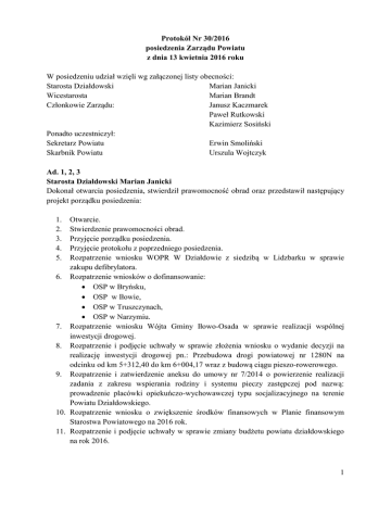 Protokół Nr 30/2016 posiedzenia Zarządu Powiatu z dnia 13 kwietnia 2016 roku W posiedzeniu udział wzięli wg załączonej listy obecności: Starosta Działdowski Marian Janicki Wicestarosta Marian Brandt Członkowie Zarządu: Janusz Kaczmarek Paweł Rutkowski Kazimierz Sosiński Ponadto uczestniczył: Sekretarz Powiatu Erwin Smoliński Skarbnik Powiatu Urszula Wojtczyk Ad. 1, 2, 3 Starosta Działdowski Marian Janicki Dokonał otwarcia posiedzenia, stwierdził prawomocność obrad oraz przedstawił następujący projekt porządku posiedzenia: 1. 2. 3. 4. 5. Otwarcie. Stwierdzenie prawomocności obrad. Przyjęcie porządku posiedzenia. Przyjęcie protokołu z poprzedniego posiedzenia. Rozpatrzenie wniosku WOPR W Działdowie z siedzibą w Lidzbarku w sprawie zakupu defibrylatora. 6. Rozpatrzenie wniosków o dofinansowanie: OSP w Bryńsku, OSP w Iłowie, OSP w Truszczynach, OSP w Narzymiu. 7. Rozpatrzenie wniosku Wójta Gminy Iłowo-Osada w sprawie realizacji wspólnej inwestycji drogowej. 8. Rozpatrzenie i podjęcie uchwały w sprawie złożenia wniosku o wydanie decyzji na realizację inwestycji drogowej pn.: Przebudowa drogi powiatowej nr 1280N na odcinku od km 5+312,40 do km 6+004,17 wraz z budową ciągu pieszo-rowerowego. 9. Rozpatrzenie i zatwierdzenie aneksu do umowy nr 7/2014 o powierzenie realizacji zadania z zakresu wspierania rodziny i systemu pieczy zastępczej pod nazwą: prowadzenie placówki opiekuńczo-wychowawczej typu socjalizacyjnego na terenie Powiatu Działdowskiego. 10. Rozpatrzenie wniosku o zwiększenie środków finansowych w Planie finansowym Starostwa Powiatowego na 2016 rok. 11. Rozpatrzenie i podjęcie uchwały w sprawie zmiany budżetu powiatu działdowskiego na rok 2016. 1 12. Rozpatrzenie i podjęcie uchwały w sprawie ustalenia szczegółowych zasad obciążania nieruchomości stanowiących własność Powiatu Działdowskiego służebnością przesyłu. 13. Rozpatrzenie i podjęcie uchwały w sprawie wyrażenia zgody na rozbiórkę nieużytkowanego budynku mieszkalno-gospodarczego, zlokalizowanego w Działdowie przy ul. Grunwaldzkiej 4. 14. Rozpatrzenie i podjęcie uchwały w sprawie pozbawienia stypendium sportowego. 15. Rozpatrzenie i podjęcie uchwały w sprawie przyznania stypendium sportowego. 16. Rozpatrzenie i podjęcie uchwały w sprawie wyrażenia zgody na utworzenie nowego kierunku kształcenia zawodowego w Zespole Szkół Zawodowych im. ks. Edmunda Domańskiego w Iłowie-Osadzie. 17. Rozpatrzenie i podjęcie uchwały w sprawie wyrażenia zgody na utworzenie nowego kierunku kształcenia zawodowego w Zespole Szkół Zawodowych im. ks. Edmunda Domańskiego w Iłowie-Osadzie. 18. Rozpatrzenie i przyjęcie projektu uchwały Rady Powiatu w sprawie wyrażenia zgody na nabycie w formie darowizny na rzecz Powiatu Działdowskiego, nieruchomości stanowiącej własność Skarbu Państwa. 19. Rozpatrzenie i przyjęcie projektu uchwały Rady Powiatu w sprawie przyjęcia sprawozdania z realizacji Programu Współpracy Powiatu Działdowskiego z Organizacjami w 2015 roku. 20. Sprawy bieżące. 21. Wolne wnioski. 22. Zamknięcie obrad. Zarząd jednogłośnie przyjął porządek posiedzenia. Ad. 4 Członkowie Zarządu nie wnieśli uwag do protokołu z poprzedniego posiedzenia Zarządu i po zapoznaniu się z jego treścią złożyli podpisy pod tekstem protokołu. Ad. 5 Uczestniczy Naczelnik Wydziału Rolnictwa, Ochrony Środowiska i Leśnictwa, Maria Ligman Naczelnik Wydziału Rolnictwa, Ochrony Środowiska i Leśnictwa, Maria Ligman Przedstawiła wniosek Zarządu Miejsko-Powiatowego Oddziału WOPR w Działdowie z siedzibą w Lidzbarku o zakup i przekazanie w użytkowanie defibrylatora. Radny Paweł Rutkowski Cel jest jak najbardziej uzasadniony, jednak czy mamy środki, które możemy przeznaczyć na ten zakup? Naczelnik Wydziału Rolnictwa, Ochrony Środowiska i Leśnictwa, Maria Ligman Plan, który przyjęliśmy w budżecie powiatu na 2016 rok przewiduje kwotę 141540 zł na inne zadania. Czekamy na uruchomienie środków z Urzędu Marszałkowskiego. 2 Radny Paweł Rutkowski Czy te planowane kwoty były realizowane przez Urząd Marszałkowski? Naczelnik Wydziału Rolnictwa, Ochrony Środowiska i Leśnictwa, Maria Ligman Tak. Pierwsza, większa transza powinna spłynąć do nas, tak przewiduję, już w tym miesiącu. Zarząd 4 głosami za przy jednym wstrzymującym się pozytywnie rozpatrzył wniosek Zarządu Miejsko-Powiatowego Oddziału WOPR w Działdowie z siedzibą w Lidzbarku o zakup i przekazanie w użytkowanie defibrylatora, jednocześnie przyjmując go do planu finansowego. Ad. 6 Uczestniczy Naczelnik Wydziału Rolnictwa, Ochrony Środowiska i Leśnictwa, Maria Ligman Naczelnik Wydziału Rolnictwa, Ochrony Środowiska i Leśnictwa, Maria Ligman Przedstawiła wniosek o dofinansowanie lekkiego samochodu bojowego dla Ochotniczej Straży Pożarnej w Bryńsku wraz z pozytywną opinią celowości tego zakupu Komendanta Powiatowego Państwowej Straży Pożarnej w Działdowie. Zarząd jednogłośnie, pozytywnie rozpatrzył wniosek o dofinansowanie lekkiego samochodu bojowego dla Ochotniczej Straży Pożarnej w Bryńsku. Naczelnik Wydziału Rolnictwa, Ochrony Środowiska i Leśnictwa, Maria Ligman Przedstawiła wniosek o dofinansowanie prac związanych z wymianą dachu na strażnicy dla Ochotniczej Straży Pożarnej w Iłowie. Wicestarosta Marian Brandt Zarząd Powiatu na posiedzeniu w dniu 29 października 2015r. zdecydował, iż wnioski OSP na zadania związane z ochroną środowiska i gospodarką wodną w 2016r. będą realizowane przez Powiat tylko w zakresie dofinansowania na niezbędny sprzęt przeciwpożarowy. W związku z powyższym Zarząd jednogłośnie, negatywnie rozpatrzył wniosek o dofinansowanie prac związanych z wymianą dachu na strażnicy dla Ochotniczej Straży Pożarnej w Iłowie. Naczelnik Wydziału Rolnictwa, Ochrony Środowiska i Leśnictwa, Maria Ligman Przedstawiła wniosek o wsparcie finansowe na 60-lecie powstania Jednostki Ochotni