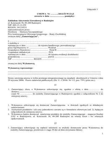 Załącznik 3 UMOWA Nr ………./2012/ŻYW/ZAZ zawarta w dniu .......................... pomiędzy: Zakładem Aktywności Zawodowej w Radziejów ul. Kościuszki 58, 88-200 Radziejów NIP: 889-15-12-259 REGON: 341210331 reprezentowanym przez: Dyrektora – Dariusza Szczepańskiego Przy kontrasygnacie Głównego księgowego – Beaty Zwolińskiej zwanym dalej „Zamawiającym”, a ……………………………..…………………………………………………………………………… z siedzibą w .............................................................................................................................................. wpisaną/ym w dniu ..................... do rejestru handlowego, prowadzoną/ego przez Sąd Rejonowy w ................................. Wydział .................................................... Gospodarczy Rejestrowy ............................... Dział B ..................................................... z kapitałem zakładowym .............................. PLN wpisaną/ym w dniu ....................................... do rejestru ewidencji działalności gospodarczej ................................................. pod nr ........................................... NIP ...................................... REGON ...................... zwaną/ym dalej Wykonawcą. Wykonawcę reprezentuje: ……………………………………………………………………………..……………………………… ……………………………………………………………………………..……………………………… Strony zawierają umowę w trybie przetargu nieograniczonego na zasadach określonych w Ustawie z dnia 29 stycznia 2004r. Prawo zamówień publicznych, (Dz. U. z 2010r. Nr 113, poz. 759 z późn.zm.). §1 1. Zamawiający zleca, a Wykonawca zobowiązuje się, zgodnie z ofertą z dnia…………… do dostawy…………………………………………………………………………………………………., część Nr ……………. do siedziby Zamawiającego w Radziejowie zgodnie z załącznikiem Nr 2 do niniejszej umowy. §2 1. Wykonawca zobowiązuje się dostarczać Zamawiającemu w ilościach zgodnych ze składanymi zamówieniami. 2. Asortyment produktów i ich ceny jednostkowe zawarte są w formularzu ofertowym (zał. 2), będącym załącznikiem do niniejszej umowy. 3. Wykonawca będzie dostarczał zamówione produkty do siedziby Zamawiającego – magazyn Kuchni ZAZ w Radziejowie, ul. Kościuszki 58, 88-200 Radziejów na własny koszt i we własnych opakowaniach. §3 1. Zamawiający zobowiązuje się zapłacić należność za artykuły dostarczone przez Wykonawcę do siedziby Zamawiającego, przelewem w ciągu 30 dni od dnia otrzymania faktury. 1 2. Zamawiający będzie składał zamówienia telefonicznie, e-mailowo, bądź na piśmie, faksem na 24 h przed terminem dostawy. 3. Dostawy będą realizowane w terminach uzgodnionych przez strony umowy w trybie nie późniejszym niż 24 h od czasu złożenia zamówienia. 4. Odbioru ilościowego i jakościowego dostarczonych towarów będzie dokonywał przedstawiciel Zamawiającego w oparciu o obowiązującą normę PN przenoszącą normy europejskie dla danego asortymentu dostawy. 5. Dostawa towaru do magazynu Kuchni ZAZ w dniu następnym po zgłoszeniu zamówienia (dot. dni powszednich) w godz. 7:30-13:00, pieczywo godz. 6.00-6.30 Towar winien być dostarczony do zamawiającego w początkowym terminie przydatności do spożycia lub daty minimalnej trwałości* Środek transportu musi odpowiadać warunkom sanitarnym oraz przepisom HACCP. * Szczegółowe wymagania w załączniku nr 2 6. Zamawiający odmówi przyjęcia dostarczonych produktów w przypadku złej jakości (kończącego się terminu ważności). §4 1. Z tytułu realizacji przedmiotu umowy Zamawiający zapłaci Wykonawcy wynagrodzenie zgodnie z ofertą, o której mowa w §2 ust 2 umowy do kwoty: …………………..(netto)........................................................................................................................... ………………………..(brutto)............................................................................................... słownie. 2. Strony przewidują możliwość zwiększenia ilości zamówienia na podstawie zapisu art. 67 ust. 1 pkt 7 ustawy do 20 % wartości netto w stosunku do ilości oraz asortymentu artykułów, uszczegółowionych w formularzu ofertowym, stanowiącym integralną część umowy. §5 1. Umowa zostaje zawarta na okres od dnia …………….. r. do …………… r. 2. Zamawiający może rozwiązać w terminie wcześniejszym umowę w przypadku naruszenia przez Wykonawcę § 3 ust. 5. §6 1. Za niewykonanie dostawy w terminie określonym w umowie Wykonawca zapłaci Zamawiającemu karę w wysokości 3% wynagrodzenia umownego brutto ustalonego w §4 ust.1 umowy za każdy dzień zwłoki, licząc od udokumentowanej daty zamówienia. - za nienależyte wykonanie dostawy niezgodnie z zapisami wynikającymi z umowy Wykonawca zobowiązuje się niezwłocznie (maksymalnie w terminie 8 godzin) usunąć powstałe wady i zapłacić Zamawiającemu karę w wysokości 3% wartości udzielonego zamówienia za każdy dzień zwłoki, licząc od udokumentowanej daty zamówienia. - za odstąpienie od umowy przez Wykonawcę z przyczyn za które odpowiedzialność ponosi Wykonawca, Wykonawca zobowiązuje się zapłacić Zamawiającemu karę umowną w wysokości 25% wynagrodzenia umownego określonego w §4 ust. 1 umowy. W przypadku rozwiązania umowy przez Zamawiającego w trybie §5 ust. 2 Wykonawca zapłaci Zamawiającemu karę umowną w wysokości 25% wynagrodzenia umownego brutto określonego w §4 ust. 1. - W razie wystąpienia istotnej zmiany okoliczności powodującej, że wykonanie umowy nie leży w interesie publicznym, czego nie można było przewidzieć w chwili zawarcia niniejszej umowy, zamawiaj