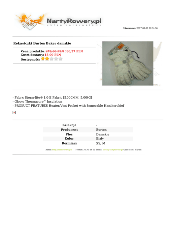 Utworzono: 2017-03-09 02:52:36 Rękawiczki Burton Baker damskie Cena produktu: 279,00 PLN 180,37 PLN Koszt dostawy: 15,00 PLN Dostępność: - Fabric Storm-lite® 1.0-E Fabric [5,000MM, 5,000G] - Gloves Thermacore™ Insulation - PRODUCT FEATURES Heater/Vent Pocket with Removable Handkerchief Kolekcja Producent Płeć Burton Damskie Kolor Biały Rozmiary XS, M Adres: http://nartyrowery.pl/ Telefon: 34 365 66 09 Email: [email protected] Gadu-Gadu: Skype: