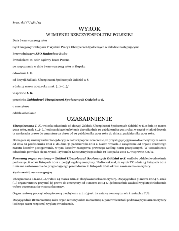 Sygn. akt V U 583/13 WYROK W IMIENIU RZECZYPOSPOLITEJ POLSKIEJ Dnia 6 czerwca 2013 roku Sąd Okręgowy w Słupsku V Wydział Pracy i Ubezpieczeń Społecznych w składzie następującym: Przewodniczący: SSO Radosław Buko Protokolant: st. sekr. sądowy Beata Pezena po rozpoznaniu w dniu 6 czerwca 2013 roku w Słupsku odwołania I. K. od decyzji Zakładu Ubezpieczeń Społecznych Oddział w S. z dnia 13 marca 2013 roku znak (...)- (...)/ w sprawie I. K. przeciwko Zakładowi Ubezpieczeń Społecznych Oddział w S. o emeryturę oddala odwołanie UZASADNIENIE Ubezpieczona I. K. wniosła odwołanie od decyzji Zakładu Ubezpieczeń Społecznych Oddział w S. z dnia 13 marca 2013 roku, znak (...)- (...) odmawiającej uchylenia decyzji z dnia 10 października 2011 roku, w części w jakiej decyzja ta zawieszała prawo do emerytury za okres od 01 października 2011 roku do dnia 31 października 2011 roku. Domagała się zmiany zaskarżonej decyzji w całości poprzez orzeczenie, że przysługuje jej prawo do emerytury za okres od dnia 01 października 2011 r. do dnia 31 października 2011 r. Nadto wniosła o zasądzenie od organu rentowego zwrotu kosztów postępowania, w tym kosztów zastępstwa prawnego według norm przepisanych. W uzasadnieniu odwołania powołała się na wyrok Trybunału Konstytucyjnego z dnia 13 listopada 2012 r., w sprawie K 2/12. Pozwany organ rentowy – Zakład Ubezpieczeń Społecznych Oddział w S. wniósł o oddalenie odwołania podnosząc, iż od 01 listopada 2011 r. podjął wypłatę emerytury. Nadto wskazał, że wyrok TK z dnia 13 listopada 2012 r. nie ma zastosowania do przypadającego przed dniem 22 listopada 2012 okresu zawieszenia emerytury. Sąd ustalił, co następuje; Ubezpieczona I. K.ur. (...), w dniu 24 marca 2004 r. złożyła wniosek o emeryturę. Decyzją z dnia 31 marca 2004 r., znak (...) organ rentowy przyznał jej prawo do emerytury od 01 marca 2004 r. i jednocześnie zawiesił wypłatę świadczenia wobec pozostawania w stosunku pracy. Organ rentowy pouczył ubezpieczoną o uchyleniu art. 103 ust. 2a ustawy o emeryturach i rentach z FUS. Decyzją z dnia 18 marca 2009 roku organ rentowy od 01 marca 2009 r. ponownie ustalił podstawę wymiaru emerytury i od tego czasu rozpoczął wypłatę świadczenia. Decyzją z dnia 10 października 2011 roku organ rentowy wstrzymał ubezpieczonej wypłatę emerytury od 01 października 2011r., gdyż ubezpieczona kontynuowała zatrudnienie. /dowód: akta emerytalne: wniosek k. 1 – 2v., decyzja pierwszorazowa z k. 13 – 14, decyzja z 18 marca 2009 r. k. 95 – 98 , decyzja z 10 października 2011 r. k. 170 – 170 v./ Wnioskiem z dnia 08 listopada 2011 r. ubezpieczona wniosła o podjęcie wypłaty emerytury w związku z rozwiązaniem stosunku pracy z dniem 31 października 2011 r. Decyzją z dnia 29 listopada 2011 r. organ rentowy wznowił wypłatę świadczenia od dnia 01 listopada 2011 r. tj. od pierwszego dnia miesiąca, w którym ustało zatrudnienie. /dowód: akta emerytalne: wniosek – k. 171, decyzja o podjęciu wypłaty emerytury z dnia 29 listopada 2011 r. – k. 192 – 193 v./ Zaskarżoną decyzją z dnia 13 marca 2013r. organ rentowy odmówił uchylenia decyzji z dnia 10 października 2011 r. w części w jakiej ta decyzja zawiesza prawo do emerytury za okres od 1 października 2011 roku do 31 października 2011 roku. /dowód: akta emerytalne: zaskarżona decyzja z 13 marca 2013 r. – k. 218 – 218v. / Sąd zważył, co następuje: Odwołanie ubezpieczonej I. K. nie zasługuje na uwzględnienie. Ubezpieczona powoływała się na wyrok Trybunału Konstytucyjnego, w sprawie K 2/12 z 13 listopada 2012 roku. Trybunał Konstytucyjny orzekł w nim , iż art. 28 ustawy z dnia 16 grudnia 2010 roku o zmianie ustawy o finansach publicznych oraz niektórych innych ustaw w związku z art. 103 a ustawy z 17 grudnia 1998 roku o emeryturach i rentach z FUS , dodanym przez art. 6 pkt 2 ustawy z 16 grudnia 2010 roku , w zakresie, w jakim znajduje zastosowanie do osób, które nabyły prawo do emerytury przed 1 stycznia 2011 roku, bez konieczności rozwiązania stosunku pracy, jest niezgodny z zasadą ochrony zaufania obywatela do państwa i stanowionego przez nie prawa wynikającą z art. 2 Konstytucji RP. Trybunał Konstytucyjny wskazał, iż w porządku prawnym , jaki istniał w naszym kraju i w przepisach emerytalno – rentowych sytuacja dotycząca prawa do emerytury i możliwości bądź braku możliwości kontynuowania zatrudnienia zmieniała się na przestrzeni lat. Od 1 lipca 2000 r. (data wejścia w życie art. 103 ust. 2a ustawy o emeryturach i rentach z FUS) nierozwiązanie stosunku pracy powodowało, że prawo do świadczenia mogło zostać ustalone, ale nie mogło zostać zrealizowane (zostało zawieszone). Uzasadniając tę zmianę, wskazano, że zasadniczą rolę w ubezpieczeniu społecznym odgrywa powiązanie prawa do świadczenia z brakiem środków utrzymania, a łączenie dochodów z pracy, z jednoczesnym pobieraniem emerytury stawia pracujących emerytów w pozycji uprzywilejowanej, co nie może być oceniane w oderwaniu od poziomu życia społeczeństwa, istniejącego bezrobocia oraz obciążeń pracodawcy i budżetu państwa. Art. 103 ust. 2a ustawy o emeryturach i rentach z FUS został uchylony mocą art. 37 pkt 5 lit. b ustawy z dnia 21 listopada 2008 r. o emeryturach kapitałowych (Dz. U. Nr 228, poz. 1507). Od 8 stycznia 2009 r. treścią ryzyka emerytalnego ponownie było osiągnięcie odpowiedniego wieku. Uchylenie art. 103 ust. 2a ustawy o emeryturach i rentach z FUS było konsekwencją realizacji programu „Solidarność pokoleń – działania dla zwiększenia aktywności zawodowej osób w wieku 50+” – pakietu działań rządowych zmierzających do zwiększenia zatrudnienia osób po 50. roku życia. Uchylenie powołanego przepisu miało usunąć jedną z barier aktywności zawodowej tych osób. Zgodnie z art. 45 ustawy z 21 listopada 2008 r. wypłaty zawieszonej emerytury d