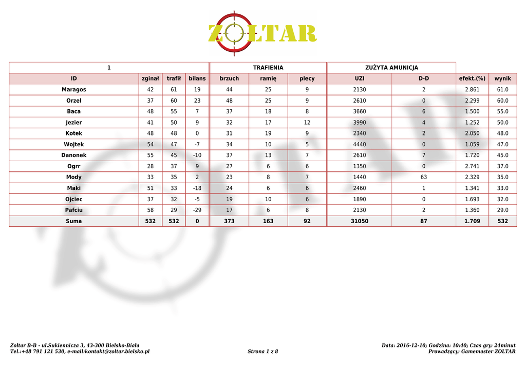 1 TRAFIENIA ZUŻYTA AMUNICJA ID zginał trafił bilans brzuch ramię plecy UZI D-D efekt.(%) wynik Maragos 42 61 19 44 25 9 2130 2 2.861 61.0 Orzel 37 60 23 48 25 9 2610 0 2.299 60.0 Baca 48 55 7 37 18 8 3660 6 1.500 55.0 Jezier 41 50 9 32 17 12 3990 4 1.252 50.0 Kotek 48 48 0 31 19 9 2340 2 2.050 48.0 Wojtek 54 47 -7 34 10 5 4440 0 1.059 47.0 Danonek 55 45 -10 37 13 7 2610 7 1.720 45.0 Ogrr 28 37 9 27 6 6 1350 0 2.741 37.0 Mody 33 35 2 23 8 7 1440 63 2.329 35.0 Maki 51 33 -18 24 6 6 2460 1 1.341 33.0 Ojciec 37 32 -5 19 10 6 1890 0 1.693 32.0 Pafciu 58 29 -29 17 6 8 2130 2 1.360 29.0 Suma 532 532 0 373 163 92 31050 87 1.709 532 Zoltar B-B - ul.Sukiennicza 3, 43-300 Bielsko-Biała Tel.:+48 791 121 530, e-mail:[email protected] Strona 1 z 8 Data: 2016-12-10; Godzina: 10:40; Czas gry: 24minut Prowadzący: Gamemaster ZOLTAR 1 TRAFIENIA ZUŻYTA AMUNICJA ID zginał trafił bilans brzuch ramię plecy UZI D-D Mhgun Shg Snp efekt.(%) wynik Ogrr 15 17 2 12 3 3 1980 2 0 0 0 0.858 17.0 Orzel 10 17 7 8 11 0 2610 0 0 0 0 0.651 17.0 Maki 19 13 -6 8 6 1 1740 0 0 0 0 0.747 13.0 Baca 16 11 -5 8 1 2 0 0 960 3 1 1.141 11.0 Danonek 19 9 -9 7 4 0 1230 0 0 0 0 0.732 9.0 Mody 15 5 -10 4 0 1 0 0 780 11 7 0.627 5.0 Suma 94 72 -21 47 25 7 7560 2 1740 14 8 0.772 72 2 TRAFIENIA ZUŻYTA AMUNICJA ID zginał trafił bilans brzuch ramię plecy UZI D-D Mhgun Shg Snp efekt.(%) wynik Jezier 15 24 9 22 5 2 2910 0 0 0 0 0.825 24.0 Maragos 11 18 7 17 8 0 990 0 0 0 0 1.818 18.0 Ojciec 11 16 5 8 8 2 1200 0 0 0 0 1.333 16.0 Wojtek 14 15 1 11 4 1 2250 0 0 0 0 0.667 15.0 Pafciu 10 11 1 8 3 1 1770 0 0 0 0 0.621 11.0 Kotek 11 9 -2 6 3 2 660 0 210 13 13 1.004 9.0 Suma 72 93 21 72 31 8 9780 0 210 13 13 0.929 93 Zoltar B-B - ul.Sukiennicza 3, 43-300 Bielsko-Biała Tel.:+48 791 121 530, e-mail:[email protected] 2 1 93 72 Strona 2 z 8 Data: 2016-12-10; Godzina: 11:24; Czas gry: 25minut Prowadzący: Gamemaster ZOLTAR 1 TRAFIENIA ZUŻYTA AMUNICJA ID zginał trafił bilans brzuch ramię plecy UZI D-D efekt.(%) wynik Danonek 18 16 -1 8 8 2 2010 0 0.796 16.0 Baca 17 16 -1 11 4 1 2820 0 0.567 16.0 Mody 18 14 -4 9 2 3 3360 6 0.416 14.0 Ogrr 17 9 -8 6 2 1 1290 0 0.698 9.0 Orzel 15 6 -9 4 2 1 3480 0 0.172 6.0 Maki 19 4 -15 2 2 0 2310 0 0.173 4.0 Suma 104 65 -38 40 20 8 15270 6 0.426 65 2 TRAFIENIA ZUŻYTA AMUNICJA ID zginał trafił bilans brzuch ramię plecy UZI D-D efekt.(%) wynik Kotek 12 30 19 17 14 0 3150 0 0.952 30.0 Ojciec 9 20 11 7 17 3 1680 0 1.190 20.0 Maragos 4 18 14 15 6 0 2190 0 0.822 18.0 Jezier 19 16 -2 12 5 2 2850 2 0.561 16.0 Wojtek 11 15 5 8 4 4 3480 0 0.431 15.0 Pafciu 13 4 -9 2 2 0 3840 0 0.104 4.0 Suma 68 103 38 61 48 9 17190 2 0.599 103 Zoltar B-B - ul.Sukiennicza 3, 43-300 Bielsko-Biała Tel.:+48 791 121 530, e-mail:[email protected] 2 1 103 65 Strona 3 z 8 Data: 2016-12-10; Godzina: 12:05; Czas gry: 25minut Prowadzący: Gamemaster ZOLTAR 1 TRAFIENIA ZUŻYTA AMUNICJA ID zginał trafił bilans brzuch ramię plecy UZI D-D efekt.(%) wynik Mody 13 16 3 4 11 3 2730 13 0.583 16.0 Baca 13 14 1 7 6 1 3150 8 0.443 14.0 Danonek 14 14 0 7 7 0 2220 0 0.631 14.0 Maki 13 8 -5 4 6 0 1500 0 0.533 8.0 Orzel 10 5 -5 4 0 1 2160 0 0.231 5.0 Ogrr 13 4 -9 3 1 0 1710 0 0.234 4.0 Suma 76 61 -15 29 31 5 13470 21 0.452 61 2 TRAFIENIA ZUŻYTA AMUNICJA ID zginał trafił bilans brzuch ramię plecy UZI D-D efekt.(%) wynik Jezier 12 30 18 20 17 4 2040 0 1.471 30.0 Kotek 13 15 2 11 6 0 1650 0 0.909 15.0 Pafciu 9 11 2 7 1 3 2520 0 0.437 11.0 Ojciec 4 8 4 8 1 0 3540 0 0.226 8.0 Maragos 13 6 -7 5 2 0 1200 0 0.500 6.0 Wojtek 10 6 -4 4 1 1 2130 0 0.282 6.0 Suma 61 76 15 55 28 8 13080 0 0.581 76 Zoltar B-B - ul.Sukiennicza 3, 43-300 Bielsko-Biała Tel.:+48 791 121 530, e-mail:[email protected] 2 1 76 61 Strona 4 z 8 Data: 2016-12-10; Godzina: 12:56; Czas gry: 20minut Prowadzący: Gamemaster ZOLTAR Drużyny Rozgrywki Miejsce Nazwa 1 Zoltar B-B - ul.Sukiennicza 3, 43-300 Bielsko-Biała Tel.:+48 791 121 530, e-mail:[email protected] 2 3 4 Suma 2 - 93 103 76 272 1 - 72 198 Strona 5 z 8 65 61 Data: 2016-12-10 Prowadzący: Gamemaster ZOLTAR Zestawienie wg wyniku Miejsce TRAFIENIA ZUŻYTA AMUNICJA ID zginał trafił bilans brzuch ramię plecy UZI D-D Mhgun Shg Snp efekt.(%) wynik Jezier 55.03 77.75 22.73 55.40 29.38 12.90 7479.75 3.70 0.00 0.00 0.00 1.039 77.75 Kotek 53.55 64.65 11.10 41.43 26.58 6.83 4986.00 1.25 126.00 7.80 7.80 1.261 64.65 Maragos 45.00 64.23 19.23 50.45 25.53 5.63 4139.25 1.25 0.00 0.00 0.00 1.551 64.23 4 Baca 59.55 61.08 1.53 39.78 18.75 7.55 6342.00 9.75 576.00 1.80 0.60 0.881 61.08 5 Orzel 45.63 55.05 9.43 40.20 23.43 6.98 6905.25 0.00 0.00 0.00 0.00 0.797 55.05 6 Danonek 67.08 53.63 -13.45 37.38 20.58 5.58 5240.25 4.38 0.00 0.00 0.00 1.022 53.63 7 Wojtek 56.25 51.88 -4.38 35.65 11.80 6.88 7810.50 0.00 0.00 0.00 0.00 0.664 51.88 8 Ojciec 38.13 47.60 9.48 26.88 22.00 6.75 5564.25 0.00 0.00 0.00 0.00 0.855 47.60 9 Mody 50.18 45.28 -4.90 25.18 14.45 9.03 4963.50 52.73 468.00 6.60 4.20 0.824 45.28 10 Ogrr 46.45 41.73 -4.73 29.93 7.50 6.15 4088.25 1.20 0.00 0.00 0.00 1.020 41.73 11 Maki 64.43 36.83 -27.60 24.00 13.05 4.35 5092.50 0.63 0.00 0.00 0.00 0.723 36.83 12 Pafciu 56.80 35.38 -21.43 21.88 7.50 7.85 6587.25 1.25 0.00 0.00 0.00 0.537 35.38 Zoltar B-B - ul.Sukiennicza 3, 43-300 Bielsko-Biała Tel.:+48 791 121 530, e-mail:[email protected] Strona 6 z 8 Data: 2016-12-10 Prowadzący: Gamemaster ZOLTAR Zestawienie wg bilansu Miejsce TRAFIENIA ZUŻYTA AMUNICJA ID zginał trafił bilans brzuch ramię plecy UZI D-D Mhgun Shg Snp efekt.(%) wynik Jezier 55.03 77.75 22.73 55.40 29.38 12.90 7479.75 3.70 0.00 0.00 0.00 1.039 77.75 Maragos 45.00 64.23 19.23 50.45 25.53 5.63 4139.25 1.25 0.00 0.00 0.00 1.551 64.23 Kotek 53.55 64.65 11.10 41.43 26.58 6.83 4986.00 1.25 126.00 7.80 7.80 1.261 64.65 4 Ojciec 38.13 47.60 9.48 26.88 22.00 6.75 5564.25 0.00 0.00 0.00 0.00 0.855 47.60 5 Orzel 45.63 55.05 9.43 40.20 23.43 6.98 6905.25 0.00 0.00 0.00 0.00 0.797 55.05 6 Baca 59.55 61.08 1.53 39.78 18.75 7.55 6342.00 9.75 576.00 1.80 0.60 0.881 61.08 7 Wojtek 56.25 51.8