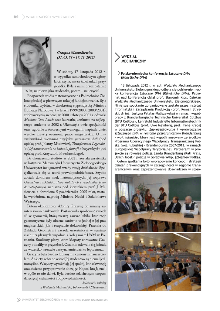 66 wiadomości w ydziałowe Grażyna Mazurkiewicz (31. 03. 78 – 17. 11. 2012) W sobotę, 17 listopada 2012 r., w wypadku samochodowym zginęła Grażyna, nasza koleżanka i przyjaciółka. Była z nami przez ostatnie 16 lat, najpierw jako studentka, potem – nauczyciel. Rozpoczęła studia matematyczne na Politechnice Zielonogórskiej w pierwszym roku jej funkcjonowania. Była studentką wybitną – dwukrotną stypendystką Ministra Edukacji Narodowej (w latach 1999/2000 i 2000/2001), zdobywczynią srebrnej w 2000 i złotej w 2001 r. odznaki Maxima Cum Laude oraz laureatką konkursu na najlepszego studenta w 2002 r. Ukończyła dwie specjalności oraz, zgodnie z ówczesnymi wymogami, napisała dwie, wysoko zresztą ocenione, prace magisterskie: O niezmiennikach mieszania względem parametru skali (pod opieką prof. Jolanty Misiewicz), Transformata Legendre’a i jej zastosowania w badaniu funkcji niewypukłych (pod opieką prof. Krzysztofa Przesławskiego). Po ukończeniu studiów w 2001 r. została asystentką w Instytucie Matematyki Uniwersytetu Zielonogórskiego. Uniwersytet inaugurował wtedy swoją działalność. Specjalizowała się w teorii prawdopodobieństwa. Szybko została doktorem nauk matematycznych. Jej rozprawa Geometria rozkładów słabo stabilnych i rozkładów pseudoizotropowych, napisana pod kierunkiem prof. J. Misiewicz, a obroniona 5 października 2005 roku, została wyróżniona nagrodą Ministra Nauki i Szkolnictwa Wyższego. Potem okoliczności skłoniły Grażynę do zmiany zainteresowań naukowych. Postanowiła spróbować swoich sił w geometrii, którą zresztą zawsze lubiła. Inspiracje geometryczne były obecne zarówno w jednej z Jej prac magisterskich jak i rozprawie doktorskiej. Przeszła do Zakładu Geometrii i zaczęła uczestniczyć w seminariach urządzanych wspólnie z kolegami z UAM w Poznaniu. Snuliśmy plany, które kłopoty zdrowotne Grażyny oddaliły w przyszłość. Ostatnio zdawało się jednak, że wszystko wreszcie zaczyna zmierzać ku lepszemu... Grażyna była bardzo lubianym i cenionym nauczycielem. Ankiety zebrane wśród Jej studentów są niemal jednomyślne. Wszyscy wyróżniają Jej spokój, konsekwencję oraz świetne przygotowanie do zajęć. Kogoś, kto Ją znał, w ogóle to nie dziwi. Była bardzo szlachetnym stopem dziecięcej ciekawości i odpowiedzialności. koleżanki i koledzy z Wydziału Matematyki, Informatyki i Ekonometrii UNIWERSYTET ZIELONOGÓRSKI nr 10/1 (202-203) grudzień 2012/styczeń 2013 wydział mechaniczny Polsko-niemiecka konferencja Sztuczne DNA (Künstliche DNA) 13 listopada 2012 r. w auli Wydziału Mechanicznego Uniwersytetu Zielonogórskiego odbyła się polsko-niemiecka konferencja Sztuczne DNA (Künstliche DNA). Patronat nad konferencją objął prof. Sławomir Kłos, Dziekan Wydziału Mechanicznego Uniwersytetu Zielonogórskiego. Niniejsze spotkanie zorganizowane zostało przez Instytut Informatyki i Zarządzania Produkcją (prof. Roman Stryjski, dr inż. Justyna Patalas-Maliszewska) w ramach współpracy z Brandenburgische Technische Universität Cottbus (BTU Cottbus), Lehrstuhl Industrielle Informationstechnik der BTU Cottbus (prof. Uwe Meinberg, prof. Irene Krebs) w obszarze projektu: Zaprezentowanie i wprowadzenie sztucznego DNA w regionie przygranicznym Brandenburg - woj. lubuskie, który jest współfinansowany ze środków Programu Operacyjnego Współpracy Transgranicznej Polska (woj. lubuskie) - Brandenburgia 2007-2013, w ramach Europejskiej Współpracy Terytorialnej. Partnerami w projekcie są również policja Landu Brandenburg (Kati Prajs, Ulrich Jobst) i policja w Gorzowie Wlkp. (Zbigniew Pytka). Celem spotkania było wypracowanie koncepcji strategii działań prewencyjnych w szczególności w regionie transgranicznym oraz zaprezentowanie doświadczeń w stoso- 67 wiadomości w ydziałowe Seminarium CAD waniu sztucznego DNA w Landzie Brandenburg i Bremen. Kolejne spotkanie w przedmiotowej tematyce planowane jest na marzec 2013 r. w siedzibie Uniwersytetu Viadrina Słubice/Frankfurt (Oder). Spotkanie otworzyła prof. Irene Krebs, koordynator projektu ze strony niemieckiej. Zaprezentowała cele projektu i zakres współpracy ze stroną Polską. Następnie uczestników przywitał prof. Andrzej Pieczyński, Prorektor ds. Rozwoju Uniwersytetu Zielonogórskiego i przedstawiciel Urzędu Marszałkowskiego w Zielonej Górze. Ze strony Policji Niemieckiej tematykę sztucznego DNA zaprezentował Arne Feuring, Prezes Policji Landu Brandenburgia. Przedstawiciele polskiej i niemieckiej Policji przedstawili analizę skuteczności działań prewencyjnych prowadzonych w regionie przygranicznym woj. lubuskiego i Landu Brandenburgia. Dr Benno Schulz (policja Landu Brandenburg) oraz podinsp. Zbigniew Pytka (policja Gorzów Wlkp.) pokazali przykłady zastosowań sztucznego DNA. Na spotkaniu zostały również zaprezentowane doświadczenia w prowadzeniu działań prewencyjnych w Bremen i Brandenburgii. W spotkaniu wzięło udział 150 osób, zarówno z Polski jak i z Niemiec, przedstawicieli uczelni wyższych, policji i samorządów, oraz studentów Uniwersytetu Zielonogórskiego. Spotkanie spotkało się z dużym zainteresowaniem ze strony mediów. Strategia prewencyjna Sztuczne DNA może być wspólnym elementem zwiększania bezpieczeństwa dla mieszkańców obszaru przygranicznego. Zwiększanie świadomości oraz stosowanie sztucznego DNA w Niemczech i Polsce będą miały wpływ na poczucie bezpieczeństwa polskich i niemieckich mieszkańców. Justyna Patalas-Maliszewska UNIWERSYTET ZIELONOGÓRSKI nr 10/1 (202-203) grudzień 2012/styczeń 2013 21 listopada 2012 r. na Wydziale Mechanicznym Uniwersytetu Zielonogórskiego odbyło się kolejne seminarium poświęcone tematyce CAD/CAM, połączone z prezentacją systemu komputerowego wspomagania projektowania i wytwarzania. Firma TM SYS Sp. z o.o. specjalizująca się we wdrażaniu profesjonalnych systemów 3D CAD/CAM/ CAE zaprezentowała oferowane przez