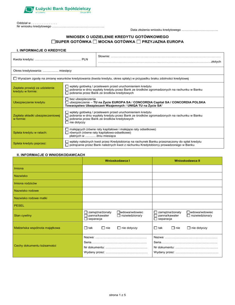 Oddział w . . . . . . . . . . . . . . . Nr wniosku kredytowego ………………………………………….. Data złożenia wniosku kredytowego …………………………….. WNIOSEK O UDZIELENIE KREDYTU GOTÓWKOWEGO SUPER GOTÓWKA MOCNA GOTÓWKA PRZYJAZNA EUROPA I. INFORMACJE O KREDYCIE Słownie: ……………………………..…………………….……………………………………… Kwota kredytu: …………….………………………. PLN ………………….………………………………..…………………………………………złotych Okres kredytowania: …………… miesięcy Wyrażam zgodę na zmianę warunków kredytowania (kwota kredytu, okres spłaty) w przypadku braku zdolności kredytowej Zapłata prowizji za udzielenie kredytu w formie: Ubezpieczenie kredytu wpłaty gotówką / przelewem przed uruchomieniem kredytu pobrania w dniu wypłaty kredytu przez Bank ze środków zgromadzonych na rachunku w Banku pobrania przez Bank ze środków kredytowych bez ubezpieczenia ubezpieczenie – TU na Życie EUROPA SA / CONCORDIA Capital SA / CONCORDIA POLSKA Towarzystwo Ubezpieczeń Wzajemnych / UNIQA TU na Życie SA* Zapłata składki ubezpieczeniowej w formie: wpłaty gotówką / przelewem przed uruchomieniem kredytu pobrania w dniu wypłaty kredytu przez Bank ze środków zgromadzonych na rachunku w Banku pobrania przez Bank ze środków kredytowych nie dotyczy Spłata kredytu w ratach: malejących (równe raty kapitałowe i malejące raty odsetkowe) równych (równe raty kapitałowo-odsetkowe) płatnych w ………. dniu miesiąca Spłata kredytu poprzez: wpłaty należnych kwot przez Kredytobiorcę na rachunek Banku przeznaczony do spłat kredytu potrącanie przez Bank należnych kwot z rachunku Kredytobiorcy prowadzonego w Banku II. INFORMACJE O WNIOSKODAWCACH Wnioskodawca I Wnioskodawca II Imiona Nazwisko Imiona rodziców Nazwisko rodowe Nazwisko rodowe matki PESEL Stan cywilny zamężna/żonaty panna/kawaler separacja Małżeńska wspólnota majątkowa tak Cechy dokumentu tożsamości nie wdowa/wdowiec rozwiedziona/y nie dotyczy zamężna/żonaty panna/kawaler separacja tak nie wdowa/wdowiec rozwiedziona/y nie dotyczy Nazwa: …………………………………………. Nazwa: ………………………….………………. Seria…………………………………………….. Seria…………………………….……………….. Nr dokumentu: ……………….………………… Nr dokumentu: …………….…….……………… Wydany przez: ................................................ Wydany przez: ................................................. strona 1 z 5 Wnioskodawca I Adres zameldowania Adres do korespondencji Nr telefonu (do wyboru) Wnioskodawca II Ulica: ………………………….…………………. Ulica: ……………………………………………... Nr domu: ………………….…………………….. Nr domu: …………………………………………. Nr lokalu………………….……………………… Nr lokalu: …………………….…………………… Kod: ……………………………………………... Kod: …………………………….………………… Miejscowość: …………………….……………… Miejscowość………………….………………….. Kraj: ……………………………………………... Kraj: ………………………….…………………… Ulica……...………………………….…………… Ulica……...…………………….….……………… Nr domu: ……...………………………………… Nr domu: ……...…………………….…………… Nr lokalu: ……...……………...………………… Nr lokalu: ……...…………….…………………… Kod……...………….……….…………………… Kod……...………..…………….………………… Miejscowość: ……...…………………………… Miejscowość: …………....……………………… Kraj: ……...……………………………………… Kraj: ……...…………….………………………… Stacjonarny…………………………….………… stacjonarny: ……………………………………… komórkowy: ………………………….………….. komórkowy: ……………………….……………… E-mail: Wykształcenie wyższe magisterskie licencjat/inżynier średnie zasadnicze zawodowe podstawowe/gimnazjalne wyższe magisterskie licencjat/inżynier średnie zasadnicze zawodowe podstawowe/gimnazjalne nie posiadam posiadam ................. nie posiadam posiadam ................. Wykonywany zawód Rachunek typu ROR III. INFORMACJE O DOCHODACH I WYDATKACH Wnioskodawca I Wnioskodawca II Całkowity staż pracy (w latach) Okres zatrudnienia u obecnego pracodawcy/czas prowadzenia obecnej dział. gospodarczej (w latach) Informacje o pracodawcy (nazwa, adres) Stanowisko Miesięczny dochód netto: Źródła dochodu właściciel firmy wyższa kadra zarządzająca średnia kadra zarządzająca urzędnik specjalista pracownik inne ..................................... PLN, w tym: umowa o pracę: .................................... emerytura: ............................................ renta: .................................................... zasiłek przedemerytalny: ...................... wolne zawody: ...................................... działalność gospodarcza: ..................... działalność rolnicza: ............................. umowa cywilno-prawna: ....................... umowa najmu: ...................................... umowa o pracę na czas określony do…….................: ............................... odsetki z aktywów finansowych: ............................................................. dywidendy: ........................................... inne: ........