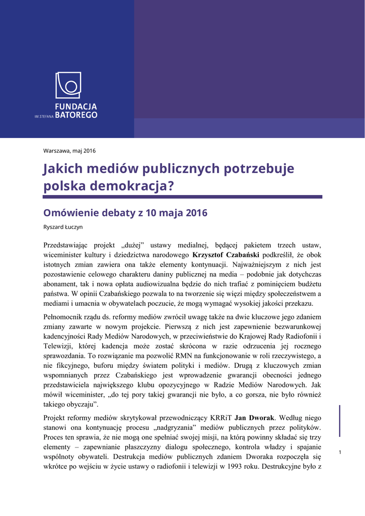 Warszawa, maj 2016 Jakich mediów publicznych potrzebuje polska demokracja? Omówienie debaty z 10 maja 2016 Ryszard Łuczyn Przedstawiając projekt „dużej” ustawy medialnej, będącej pakietem trzech ustaw, wiceminister kultury i dziedzictwa narodowego Krzysztof Czabański podkreślił, że obok istotnych zmian zawiera ona także elementy kontynuacji. Najważniejszym z nich jest pozostawienie celowego charakteru daniny publicznej na media – podobnie jak dotychczas abonament, tak i nowa opłata audiowizualna będzie do nich trafiać z pominięciem budżetu państwa. W opinii Czabańskiego pozwala to na tworzenie się więzi między społeczeństwem a mediami i umacnia w obywatelach poczucie, że mogą wymagać wysokiej jakości przekazu. Pełnomocnik rządu ds. reformy mediów zwrócił uwagę także na dwie kluczowe jego zdaniem zmiany zawarte w nowym projekcie. Pierwszą z nich jest zapewnienie bezwarunkowej kadencyjności Rady Mediów Narodowych, w przeciwieństwie do Krajowej Rady Radiofonii i Telewizji, której kadencja może zostać skrócona w razie odrzucenia jej rocznego sprawozdania. To rozwiązanie ma pozwolić RMN na funkcjonowanie w roli rzeczywistego, a nie fikcyjnego, buforu między światem polityki i mediów. Drugą z kluczowych zmian wspomnianych przez Czabańskiego jest wprowadzenie gwarancji obecności jednego przedstawiciela największego klubu opozycyjnego w Radzie Mediów Narodowych. Jak mówił wiceminister, „do tej pory takiej gwarancji nie było, a co gorsza, nie było również takiego obyczaju”. Projekt reformy mediów skrytykował przewodniczący KRRiT Jan Dworak. Według niego stanowi ona kontynuację procesu „nadgryzania” mediów publicznych przez polityków. Proces ten sprawia, że nie mogą one spełniać swojej misji, na którą powinny składać się trzy elementy – zapewnianie płaszczyzny dialogu społecznego, kontrola władzy i spajanie wspólnoty obywateli. Destrukcja mediów publicznych zdaniem Dworaka rozpoczęła się wkrótce po wejściu w życie ustawy o radiofonii i telewizji w 1993 roku. Destrukcyjne było z 1 jednej strony obsadzanie KRRiT i samych mediów reprezentantami polityków, z drugiej zaś – wpychanie ich w logikę komercjalizacji w związku z niechętnym stosunkiem części środowisk politycznych do abonamentu i w konsekwencji niewystarczającym finansowaniem. Jak podkreślił Dworak, to Prawo i Sprawiedliwość w 2006 roku wykonało decydujący krok w kierunku uzależnienia mediów publicznych od polityków. Do tego momentu reprezentację w KRRiT miały wszystkie opcje polityczne, natomiast po skróceniu przez PiS kadencji Rady w jej składzie znaleźli się jedynie członkowie desygnowani przez koalicję rządzącą. W podobny sposób „małą” ustawę medialną, która weszła w życie w styczniu 2016 roku, wykorzystano do skrócenia kadencji władz Telewizji Polskiej i Polskiego Radia. „Duża” ustawa medialna, stworzona – jak zaznaczył przewodniczący KRRiT – bez szerokich konsultacji społecznych, wprowadzi zaś „stricte polityczne” ciało, jakim będzie w opinii Dworaka Rada Mediów Narodowych. Jak zaznaczył, „jej przewodniczącego będzie wyznaczał marszałek Sejmu, osoba najbardziej polityczna z całego świata polityki”. Co więcej, o ile w KRRiT nie mogą zasiadać członkowie partii, o tyle nowa ustawa – według Dworaka nieprzypadkowo – nie zawiera takiego zakazu w odniesieniu do członków Rady Mediów Narodowych. Przewodniczący KRRiT odniósł się także do zmiany formy prawnej spółek medialnych wprowadzanej w ramach reformy. Według niego przekształcenie obecnie funkcjonujących spółek akcyjnych mediów publicznych w państwowe osoby prawne nie uwolni mediów od kontroli rządu, a wręcz przeciwnie. Jak mówił, projekt nowej ustawy zakłada realizację paternalistycznej wizji mediów podporządkowanych ośrodkowi centralnemu. Brakuje w niej także obecnych w „starej” ustawie zapisów gwarantujących niezależność dziennikarską oraz modelu budowania zaangażowania widzów. Do słów Jana Dworaka o niezależności dziennikarskiej odniosła się Ewa Wanat. Jak mówiła, choć we wciąż jeszcze obowiązującej ustawie o radiofonii i telewizji rzeczywiście formalnie obecne są gwarancje niezależności dziennikarskiej, to jednak i do tej pory była ona fikcją. Naciski na media publiczne istniały także za poprzednich rządów, ale obecnie są znacznie lepiej widoczne i bardziej jawne. Wanat zwróciła uwagę na problem z wprowadzaną w ramach reformy zmianą nazwy „media publiczne” na „media narodowe”. Nie wiadomo, czemu ta zmiana ma służyć i kto będzie adresatem mediów narodowych. „Nazwa nie jest tylko etykietą, język tworzy rzeczywistość” – stwierdziła, wyrażając jednocześnie obawę, że media narodowe będą wykluczały niektórych odbiorców, choćby nieurodzonych w Polsce. Odnosząc się do kwestii zmiany formy prawnej mediów publicznych, Wanat wyraziła opinię, że ich funkcjonowanie jako spółek prawa handlowego jest szkodliwe i sprawia, że muszą one działać zgodnie z logiką rynku, gdy tymczasem powinny być traktowane nie jak przedsiębiorstwa, lecz nośniki wartości, pozbawione reklam i całkowicie utrzymywane z danin publicznych. „Cele ustawy o radiofonii i telewizji z 1993 roku były dwa: uniezależnienie mediów publicznych od polityki i od komercjalizacji. Żaden z tych celów nie został zrealizowany” – powiedział Jarosław Gugała. „Nie stworzyliśmy dziennikarzom warunków do takiego funkcjonowania, by mogli maksymalizować wartości będące podstawą ich zawodu – uczciwość i neutralność”. Udział w tworzeniu systemu, w którym zamiast tych wartości liczą się układy z władzą, miały wszystkie siły polityczne. Ustawa o mediach narodowych mogłaby pomóc ten system zmienić, przede wszystkim dzięki wprowadzeniu ustawy audiowizualnej, 2 niezbędnej do tego, by media publiczne mogły pr