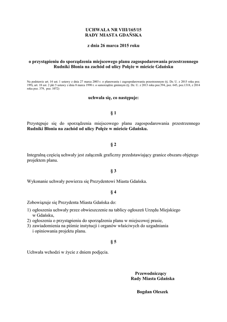 UCHWAŁA NR VIII/165/15 RADY MIASTA GDAŃSKA z dnia 26 marca 2015 roku o przystąpieniu do sporządzenia miejscowego planu zagospodarowania przestrzennego Rudniki Błonia na zachód od ulicy Połęże w mieście Gdańsku Na podstawie art. 14 ust. 1 ustawy z dnia 27 marca 2003 r. o planowaniu i zagospodarowaniu przestrzennym (tj. Dz. U. z 2015 roku poz. 199), art. 18 ust. 2 pkt 5 ustawy z dnia 8 marca 1990 r. o samorządzie gminnym (tj. Dz. U. z 2013 roku poz.594, poz. 645, poz.1318, z 2014 roku poz. 379, poz. 1072) uchwala się, co następuje: §1 Przystępuje się do sporządzenia miejscowego planu zagospodarowania przestrzennego Rudniki Błonia na zachód od ulicy Połęże w mieście Gdańsku. §2 Integralną częścią uchwały jest załącznik graficzny przedstawiający granice obszaru objętego projektem planu. §3 Wykonanie uchwały powierza się Prezydentowi Miasta Gdańska. §4 Zobowiązuje się Prezydenta Miasta Gdańska do: 1) ogłoszenia uchwały przez obwieszczenie na tablicy ogłoszeń Urzędu Miejskiego w Gdańsku, 2) ogłoszenia o przystąpieniu do sporządzenia planu w miejscowej prasie, 3) zawiadomienia na piśmie instytucji i organów właściwych do uzgadniania i opiniowania projektu planu. §5 Uchwała wchodzi w życie z dniem podjęcia. Przewodniczący Rady Miasta Gdańska Bogdan Oleszek ZAŁĄCZNIK GRAFICZNY DO UCHWAŁY NR VIII/165/15 RADY MIASTA GDAŃSKA z dnia 26 marca 2015 roku O PRZYSTĄPIENIU DO SPORZĄDZANIA MIEJSCOWEGO PLANU ZAGOSPODAROWANIA PRZESTRZENNEGO RUDNIKI BŁONIA NA ZACHÓD OD ULICY POŁĘŻE W MIEŚCIE GDAŃSKU UZASADNIENIE Obszar proponowany do objęcia planem miejscowym, o powierzchni ok. 9,87 ha, położony jest w jednostkach urbanistycznych Błonia – Płonia i Orunia Olszynka i graniczy: od wschodu z ulicą Połęże, od południa z ulicą Zawodzie i torami kolejowymi, od zachodu terenami porojektowanej ulicy tzw. Nowej Sandomierskiej, od północy przemysłowymi terenami inwestycyjnymi i torami kolejowymi. Obecnie jest to teren niezagospodarowany, jedynie wzdłuż wschodniej granicy biegnie ulica Połęże. Grunt w przeważającej większości stanowi własność osób prywatnych oraz Skarbu Państwa w użytkowaniu wieczystym Grupy Lotos S.A. i PKP S.A. Pozostałe to grunty Skarbu Państwa, Gminy Miasta Gdańsk oraz Północnej Okręgowej Dyrekcji Kolei Państwowych w Gdańsku. Wskazany do objęcia planem teren znajduje się w granicach obowiązującego miejscowego planu zagospodarowania przestrzennego Rudniki Błonia-Zachód w mieście Gdańsku (Uchwała RMG nr XII/265/07 z dnia 30 sierpnia 2002r.). Plan ten dla przedmiotowego terenu ustala funkcję mieszaną produkcyjno-usługową (teren 026-P/U41, 036-P/U41, 039-P/U41, 044-P/U41, 045-P/U41, 050-P/U41 i 051-P/U41), kanał i rowy odwadniające wraz z pasami technicznymi (teren 024-D, 037-D i 052-D), przepompownię odwadniającą „Rudniki” (teren 046-D), tereny ulic lokalnych ulicy Połęże i projektowanego łącznika z tzw. Nową Sandomierską (teren 035-KD81, 038-KD81, 043-KD81 i 053-KD81) oraz tereny szlaków i bocznic kolejowych (teren 033-KK91 i 047-KK91). ANALIZA ZASADNOŚCI PRZYSTĄPIENIA DO SPORZĄDZENIA PLANU Głównym celem sporządzenia planu jest weryfikacja ustaleń planu obowiązującego, ze uwzględnieniem zaspokojenia szeroko rozumianego interesu ogólnomiejskiego, poprzez umożliwienie zainwestowania terenu w oparciu o zrealizowany układ komunikacyjny, co przełoży się na zwiększenie możliwości rozwoju gospodarczego, przyrost miejsc pracy i wzrost bazy podatkowej miasta. Obowiązujący plan miejscowy przeznacza teren pod funkcję produkcyjno-usługową, przez którą w północnej części przebiega ulica lokalna, będąca łącznikiem między ulicą Połęże a projektowaną tzw. Nową Sandomierską. Ze względu na zrealizowanie węzła Błonia w innym kształcie (na podstawie ustawy z dnia 10 kwietnia 2003r. o szczególnych zasadach przygotowania i realizacji inwestycji w zakresie dróg publicznych (t.j. Dz. U. z 2008r., Nr 193 poz. 1194 z późn. zm.)) niż było to przewidziane w planie obowiązującym, konieczne jest dostosowanie ustaleń do występujących uwarunkowań funkcjonalno-przestrzennych oraz do aktualnej sytuacji ekonomiczno-prawnej. Zmiana ta pozwoli również na uwolnienie z rezerwacji pod funkcję komunikacyjną terenów prywatnych i prowadzenie na nich inwestycji adekwatnie do predyspozycji terenu. Zakłada się standardowy zakres prac planistycznych. W granicach planu nie występują grunty leśne wymagające zmiany przeznaczenia na cele nieleśne. Przewiduje się, że plan nie naruszy ustaleń obowiązującego „Studium uwarunkowań i kierunków zagospodarowania przestrzennego miasta Gdańska”. Skala opracowania rysunku planu 1:1000.