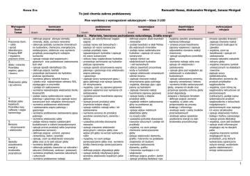 Romuald Hassa, Aleksandra Mrzigod, Janusz Mrzigod Nowa Era To jest chemia zakres podstawowy Plan wynikowy z wymaganiami edukacyjnymi – klasa 3 LOD Wymagania Ocena Temat konieczne dopuszczająca podstawowe dostateczna Uczeń: Uczeń: rozszerzające dobra Uczeń: dopełniające bardzo dobra Uczeń: wykraczające celująca Uczeń: Dział 1. Materiały, tworzywa pochodzenia naturalnego, Źródła energii 1. Pracownia chem. – szkło i sprzęt laboratoryjny. Przepisy BHP i regulamin pracowni chem. 2. Skały i minerały Przeróbka wapieni, gipsu i kwarcu 3. Właściwości gleby i jej ochrona 4 Rodzaje paliw kopalnych. Przeróbka ropy naftowej i węgla kamiennego 5. Benzyna – otrzymywanie i właściwości 6. Sposoby pozyskiwania energii a środowisko przyrodnicze – definiuje pojęcia: skorupa ziemska, minerały, skały, surowce mineralne – dokonuje podziału surowców mineralnych na budowlane, chemiczne, energetyczne, metalurgiczne, zdobnicze oraz wymienia przykłady poszczególnych rodzajów surowców – opisuje rodzaje skał wapiennych i gipsowych oraz podstawowe zastosowania tych skał – opisuje sposób identyfikacji CO2 – definiuje pojęcie hydraty – przewiduje zachowanie się hydratów podczas ogrzewania – wymienia główny składnik kwarcu i piasku oraz najważniejsze odmiany SiO2 występujące w przyrodzie i podaje ich zastosowania – wymienia najważniejsze właściwości tlenku krzemu(IV) – podaje nazwy systematyczne wapna palonego i gaszonego oraz zapisuje wzory sumaryczne tych związków chemicznych – wymienia podstawowe właściwości i zastosowania wapna palonego i gaszonego – wymienia podstawowe zastosowania gipsu palonego – wymienia właściwości szkła – podaje różnicę między substancjami krystalicznymi a ciałami bezpostaciowymi – opisuje proces produkcji szkła (wymienia podstawowe surowce) – definiuje pojęcia: cement, zaprawa cementowa, beton, ceramika – opisuje, czym są właściwości sorpcyjne gleby oraz co to jest odczyn gleby – wymienia składniki gleby – dokonuje podziału nawozów na naturalne i sztuczne (fosforowe, azotowe i potasowe) – wymienia przykłady nawozów naturalnych i sztucznych – wymienia podstawowe rodzaje - opisuje, jak zidentyfikować węglan wapnia – podaje nazwy soli bezwodnych i zapisuje ich wzory sumaryczne – podaje przykłady nazw najważniejszych hydratów i zapisuje ich wzory sumaryczne – oblicza masy cząsteczkowe hydratów – przewiduje zachowanie się hydratów podczas ogrzewania – opisuje sposób otrzymywania wapna palonego i gaszonego oraz właściwości wapna palonego i gaszonego – zapisuje wzory sumaryczne gipsu i gipsu palonego oraz opisuje sposoby ich otrzymywania – wyjaśnia, czym są zaprawa gipsowa i zaprawa wapienna oraz wymienia ich zastosowania – wyjaśnia proces twardnienia zaprawy gipsowej – opisuje proces produkcji szkła (wymienia kolejne etapy) – opisuje niektóre rodzaje szkła i ich zastosowania – wymienia surowce do produkcji wyrobów ceramicznych, cementu i betonu – uzasadnia potrzebę stosowania nawozów – opisuje znaczenie właściwości sorpcyjnych i odczynu gleby oraz wpływ pH gleby na wzrost wybranych roślin – wyjaśnia, na czym polega zanieczyszczenie gleby oraz wymienia źródła chemicznego zanieczyszczenia gleby – definiuje pojęcie degradacja gleby – opisuje metody rekultywacji gleby - wymienia właściwości kopalnych paliw stałych - definiuje pojecie skala twardości minerałów – podaje twardości w skali Mohsa dla wybranych minerałów – podaje nazwy systematyczne hydratów i zapisuje ich wzory sumaryczne – opisuje różnice we właściwościach hydratów i soli bezwodnych – oblicza zawartość procentową wody w hydratach – opisuje właściwości omawianych odmian kwarcu – zapisuje równanie reakcji otrzymywania gipsu palonego – wyjaśnia, dlaczego gips i gips palony są hydratami – zapisuje równanie reakcji twardnienia zaprawy gipsowej – opisuje każdy z etapów produkcji szkła – wyjaśnia niektóre zastosowania gliny na podstawie jej właściwości – opisuje wpływ niektórych składników gleby na rozwój roślin – uzasadnia potrzebę stosowania nawozów sztucznych i podaje ich przykłady – wyjaśnia, na czym polega chemiczne zanieczyszczenie gleby - opisuje właściwości diamentu, grafitu i fulerenów na podstawie znajomości ich budowy – wymienia zastosowania diamentu, grafitu i fulerenów wynikające z ich właściwości – definiuje pojęcia grafen i karbin – opisuje przebieg destylacji ropy - wyjaśnia zjawisko powstawania kamienia kotłowego – omawia proces twardnienia zaprawy wapiennej i zapisuje odpowiednie równanie reakcji chemicznej – opisuje szczegółowo przeróbkę gipsu – wymienia rodzaje szkła oraz opisuje ich właściwości i zastosowania – opisuje glinę pod względem jej zastosowań w materiałach budowlanych – opisuje zastosowania cementu, zaprawy cementowej i betonu – wymienia źródła zanieczyszczeń gleby, omawia ich skutki oraz proponuje sposoby ochrony gleby przed degradacją związane z bieżącym tematem - definiuje pojęcie izomeria – wyjaśnia, w jakim celu przeprowadza się procesy krakingu i reformingu – analizuje wady i zalety środków przeciwstukowych – analizuje wpływ sposobów uzyskiwania energii na stan środowiska przyrodniczego - omawia zjawiska krasowe i zapisuje równania reakcji chemicznych ilustrujące te zjawiska – wyjaśnia, czym są światłowody i opisuje ich zastosowania – omawia naturalne wskaźniki odczynu gleby – wyjaśnia znaczenie symboli umieszczonych na etykietach nawozów - zapisuje wzory (półstrukturalne, strukturalne) izomerów dla prostych przykładów węglowodorów – wyjaśnia, czym różnią się węglowodory łańcuchowe od pierścieniowych (cyklicznych), podaje nazwy systematyczne prostych węglowodorów o łańcuchach rozgałęzionych i pierścieniowych oraz zapisuje ich wzory strukturalne – op