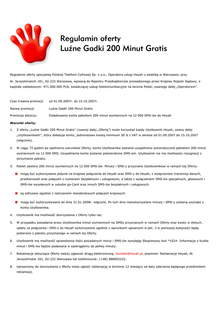 Regulamin oferty Luźne Gadki 200 Minut Gratis Regulamin oferty specjalnej Polskiej Telefonii Cyfrowej Sp. z o.o., Operatora usługi Heyah z siedzibą w Warszawie, przy Al. Jerozolimskich 181, 02-222 Warszawa, wpisaną do Rejestru Przedsiębiorców prowadzonego przez Krajowy Rejestr Sądowy, o kapitale zakładowym: 471.000.000 PLN, świadczącej usługi telekomunikacyjne na terenie Polski, zwanego dalej „Operatorem”. Czas trwania promocji: od 01.09.2007r. do 15.10.2007r. Nazwa promocji: Luźne Gadki 200 Minut Gratis Promocja dotyczy: Doładowania konta pakietem 200 minut wymiennych na 12 000 SMS-ów do Heyah Warunki oferty: 1. Z oferty „Luźne Gadki 200 Minut Gratis” (zwanej dalej „Ofertą”) moŜe korzystać kaŜdy UŜytkownik Heyah, zwany dalej „UŜytkownikiem”, który doładuje konto, jednorazowo kwotą minimum 50 zł z VAT w okresie od 01.09.2007 do 15.10.2007 (włącznie), 2. W ciągu 72 godzin po spełnieniu warunków Oferty, konto UŜytkownika zostanie uzupełnione automatycznie pakietem 200 minut wymiennych na 12 000 SMS. Uzupełnienie konta zostanie potwierdzone SMS-em. UŜytkownik nie ma moŜliwości rezygnacji z otrzymania pakietu. 3. Pakiet zawiera 200 minut wymiennych na 12 000 SMS-ów. Minuty i SMS-y przyznane UŜytkownikowi w ramach tej Oferty: mogą być wykorzystane jedynie na krajowe połączenia do Heyah oraz SMS-y do Heyah, z wyłączeniem transmisji danych, przekierowań oraz połączeń z numerami bezpłatnymi i usługowymi, a takŜe z wyłączeniem SMS-ów specjalnych, głosowych i SMS-ów wysyłanych w usłudze go-Card oraz innych SMS-ów bezpłatnych i usługowych. są odliczane zgodnie z naliczaniem standardowych połączeń krajowych. mogą być wykorzystywane do dnia 31.01.2008r. włącznie. Po tym dniu niewykorzystane minuty i SMS-y zostaną usunięte z konta UŜytkownika. 4. UŜytkownik ma moŜliwość skorzystania z Oferty tylko raz. 5. W przypadku posiadania przez UŜytkownika minut wymiennych na SMSy przyznanych w ramach Oferty oraz kwoty w złotych, opłaty za połączenia i SMS-y do Heyah wykorzystane zgodnie z warunkami opisanymi w pkt. 3 w pierwszej kolejności będą pobierane z pakietu przyznanego w ramach tej Oferty. 6. UŜytkownik ma moŜliwość sprawdzenia ilości posiadanych minut i SMS-ów wysyłając Ekspresowy kod *102#. Informacja o liczbie minut i SMS-ów będzie podawana w zaokrągleniu do pełnej minuty. 7. Reklamacje dotyczące Oferty naleŜy zgłaszać drogą elektroniczną: [email protected], pisemnie: Reklamacje Heyah, Al. Jerozolimskie 181, 02-222 Warszawa lub telefonicznie: (+48) 888002222. 8. Uprawniony do skorzystania z 0ferty moŜe zgłosić reklamację w terminie 12 miesięcy od daty zdarzenia będącego przedmiotem reklamacji. 9. Reklamacja winna zawierać imię i nazwisko UŜytkownika, numer telefonu oraz kod PUK karty SIM, przedmiot reklamacji, reklamowany okres oraz okoliczności uzasadniające reklamację. 10. Jeśli podane w reklamacji dane lub informacje wymagają uzupełnienia, przed rozpatrzeniem reklamacji Heyah zwraca się do składającego reklamację o jej uzupełnienie. 11. Heyah rozpatruje reklamację w terminie maksymalnie 1 miesiąca od dnia jej otrzymania. 12. Operator Heyah ma prawo zaprzestać świadczenia Usług Telekomunikacyjnych w kaŜdym czasie ze skutkiem natychmiastowym w przypadku powzięcia wiadomości, Ŝe UŜytkownik wykorzystuje Usługi Telekomunikacyjne świadczone przez Operatora do celów niezgodnych z prawem lub uŜywa Kartę SIM Heyah, korzystając z kradzionego telefonu, niehomologowanego, urządzenia realizującego funkcje zakończenia sieci stałej (Fixed Cellural Terminal, zwanego "Urządzeniem FCT") lub działającego na podobnej zasadzie albo nieposiadającego certyfikatu zgodności z zasadniczymi wymaganiami aparatu telefonicznego jak równieŜ w przypadku stwierdzenia, Ŝe UŜytkownik kieruje do sieci w usłudze Heyah ruch telekomunikacyjny pochodzący z innych sieci telekomunikacyjnych lub innych kart SIM Heyah. 13. Karty SIM Heyah nie mogą być wykorzystywane w celu masowego rozsyłania wiadomości SMS. Masowe rozsyłanie wiadomości SMS w rozumieniu niniejszego Regulaminu stanowi wysyłanie więcej niŜ 100 SMS w ciągu 60 minut. W przypadku stwierdzenia takiego wykorzystywania karty SIM Operator ma prawo bezroszczeniowo zaprzestać świadczenia Usług Telekomunikacyjnych takiemu uŜytkownikowi Heyah w trybie natychmiastowym. 14. Reklamacje będące następstwem niestosowania się uŜytkownika do treści niniejszego Regulaminu nie zostaną rozpatrzone pozytywnie przez Heyah. 15. W kwestiach nie uregulowanych niniejszym Regulaminem, zastosowanie ma Regulamin usługi Heyah. 16. Operator zastrzega sobie prawo do wycofania niniejszej Oferty lub zmiany niniejszego Regulaminu w dowolnym terminie, bez konieczności podawania przyczyn.