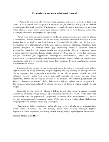 Czy patriotyzm ma sens w dzisiejszych czasach? Patriota to człowiek, który kocha swoją ojczyznę, jest gotów jej bronic i dbac o jej dobro, a także potrafi być krytyczny w stosunku do jej rodaków. Łączy się to również z szacunkiem do innych narodów. W dzisiejszych czasach obywatele mogą mieć na ten temat różne zdania, z jednej strony patriotyzm odgrywa ważna rolę w życiu każdego człowieka, a z drugiej rzadko kto przywiązuje do tego wagę. Patriotyzmu doświadczamy chociażby wtedy, gdy pracujemy, jesteśmy uczciwi, dbamy o środowisko i własne otoczenie. To od nas zależy kto będzie sprawował władzę i w jakim stopniu będzie rozwijał się nasz kraj. Jesteśmy odpowiedzialni nie tylko za to jak jest teraz, lecz także za to w jakim kraju będą żyły nasze dzieci, a następnie późniejsze pokolenia. Taka postawa przejawia się również wtedy, gdy odczuwamy radośc z sukcesów naszych sportowców, natomiast ich niepowodzenia nas przygnębiają. Słysząc pozytywne słowa o naszej ojczyźnie jesteśmy dumni, a kiedy ktoś ją krytykuje czujemy wstyd lub oburzenie. Naszym zadaniem jest wypełnianie obowiązków obywatelskich, takich jak udział w wyborach, przestrzeganie prawa czy dostosowanie się do różnych świadczeń. Ludzie często opuszczają swój kraj w poszukiwaniu pracy, lecz wracając do kraju przekraczają granice z uśmiechem na twarzy. Z drugiej strony zaś nie zawsze przychodzi nam z łatwością wypełnianie obowiązków obywatelskich, np. każdy przeciętny chłopak zapytany o to, czy chciałby iśc do wojska w celu obrony ojczyzny, bez zawahania stwierdziłby, że nie, ale na pewno znajdzie się jakiś ochotnik. Dawniej ludzie byli gotowi poświęcić wszystko za obronę swojego kraju, mężczyźni, którzy szli do wojska uważali to za zaszczyt. Doskonałym przykładem jest książka ,,Kamienie na szaniec’’, której bohaterowie żyli w ciągłym strachu i niepewności. Dla nich najważniejszym celem była obrona ojczyzny i jej dobro, a własne potrzeby się nie liczyły. Znjomośc języka , tradycji , dbanie o kulturę to wszystko robimy z przyzwyczajenia i często nie zwracamy uwagi na to, że są to działania patriotyczne. W XXI wieku ludzie nie przywiązują wagi do poprawności językowej, używamy słów zaczerpniętych z obcych języków i upraszczamy bezpośrednie zwroty. Wielu ludzi nie wie z jakiej okazji obchodzimy święta państwowe takie jak 3 maja czy 11 listopada. Reasumując, każdy współczesny człowiek, który żyje i udziela się w społeczeństwie może śmiało stwierdzić, że jest patriotą, mimo tych niekiedy rażących błędów. Zapewne w czasie zagrożenia, wojny czy niewoli łatwiej by było o patriotyczne zachowanie. Tomasz Janusz klasa IIIt4c
