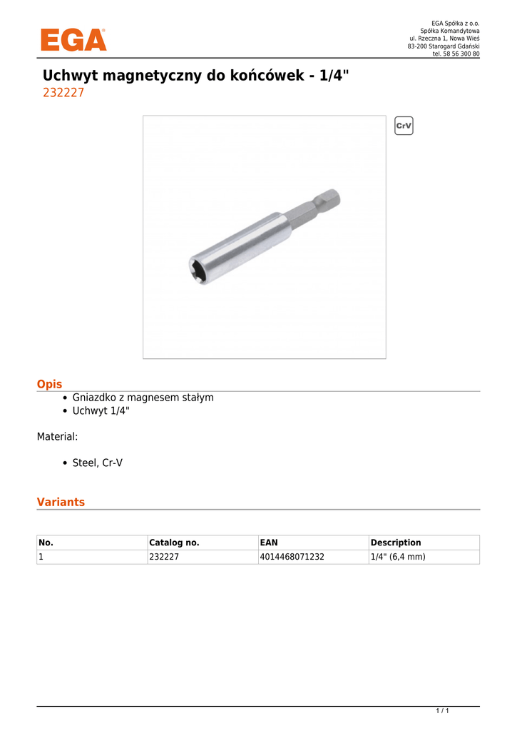 EGA Spółka z o.o. Spółka Komandytowa ul. Rzeczna 1, Nowa Wieś 83-200 Starogard Gdański tel. 58 56 300 80 Uchwyt magnetyczny do końcówek - 1/4" 232227 Opis Gniazdko z magnesem stałym Uchwyt 1/4" Material: Steel, Cr-V Variants No. Catalog no. EAN Description 1 232227 4014468071232 1/4" (6,4 mm) 1/1 Powered by TCPDF (www.tcpdf.org)