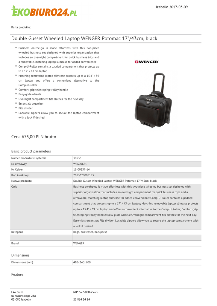 Izabelin 2017-03-09 Karta produktu: Double Gusset Wheeled Laptop WENGER Potomac 17"/43cm, black Business on-the-go is made effortless with this two-piece wheeled business set designed with superior organization that includes an overnight compartment for quick business trips and a removable, matching laptop slimcase for added convenience Comp-U-Roller contains a padded compartment that protects up to a 17" / 43 cm laptop Matching removable laptop slimcase protects up to a 15.4" / 39 cm laptop and offers a convenient alternative to the Comp-U-Roller Comfort-grip telescoping trolley handle Easy-glide wheels Overnight compartment fits clothes for the next day Essentials organizer File divider Lockable zippers allow you to secure the laptop compartment with a lock if desired Cena 675,00 PLN brutto Basic product parameters Numer produktu w systemie 30536 Nr dostawcy WE600661 Nr Celcen 11-00337-14 Kod kreskowy 7613329008195 Nazwa produktu Double Gusset Wheeled Laptop WENGER Potomac 17"/43cm, black Opis Business on-the-go is made effortless with this two-piece wheeled business set designed with superior organization that includes an overnight compartment for quick business trips and a removable, matching laptop slimcase for added convenience; Comp-U-Roller contains a padded compartment that protects up to a 17" / 43 cm laptop; Matching removable laptop slimcase protects up to a 15.4" / 39 cm laptop and offers a convenient alternative to the Comp-U-Roller; Comfort-grip telescoping trolley handle; Easy-glide wheels; Overnight compartment fits clothes for the next day; Essentials organizer; File divider; Lockable zippers allow you to secure the laptop compartment with a lock if desired Kategoria Bags, briefcases, backpacks Brand WENGER Dimensions Dimensions (mm) 410x340x200 Feature Eko biuro ul Krasińskiego 23a 05-080 Izabelin NIP: 527-000-75-75 22 864 54 84 Izabelin 2017-03-09 Karta katalogowa produktu cd. Double Gusset Wheeled Laptop WENGER Potomac 17"/43cm, black Type Travel Product Roller Kind 17" Offer from 2016-06 Procurement vocabulary CPV 30237270-2 Torby na komputery przenośne Certifications Warranty 3 New product Standard Hit Standard Colour Colour Black Pozostałe zdjęcia produktu Serdecznie zapraszamy do współpracy Eko biuro zespół. Eko biuro ul Krasińskiego 23a 05-080 Izabelin NIP: 527-000-75-75 22 864 54 84