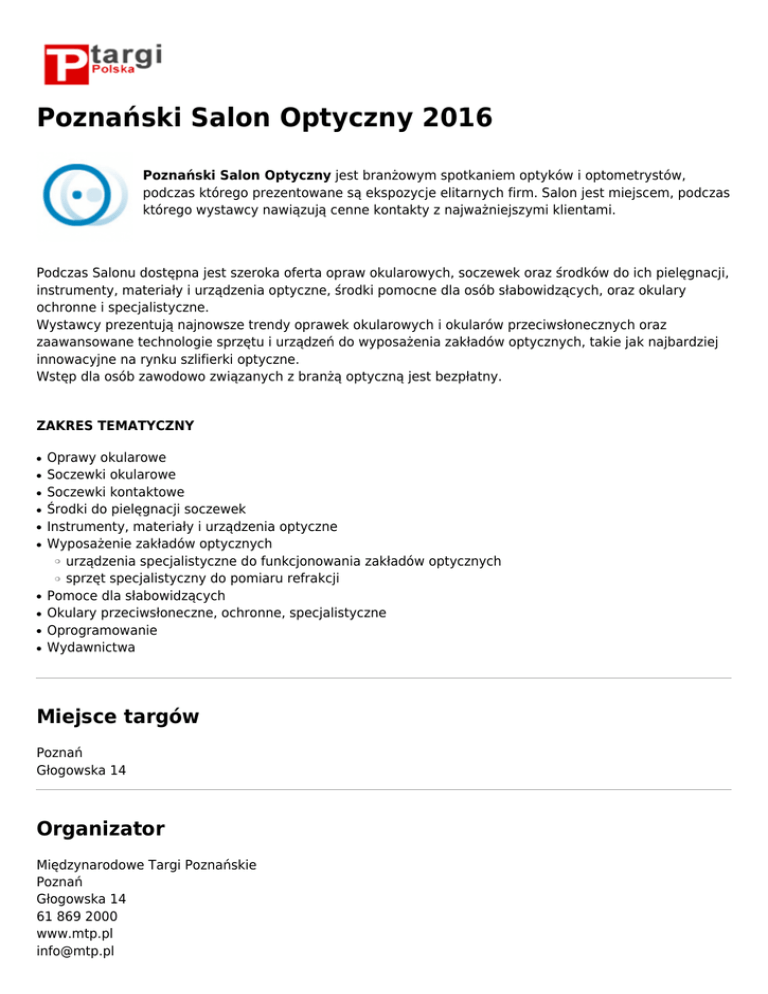 Poznański Salon Optyczny 2016 Poznański Salon Optyczny jest branżowym spotkaniem optyków i optometrystów, podczas którego prezentowane są ekspozycje elitarnych firm. Salon jest miejscem, podczas którego wystawcy nawiązują cenne kontakty z najważniejszymi klientami. Podczas Salonu dostępna jest szeroka oferta opraw okularowych, soczewek oraz środków do ich pielęgnacji, instrumenty, materiały i urządzenia optyczne, środki pomocne dla osób słabowidzących, oraz okulary ochronne i specjalistyczne. Wystawcy prezentują najnowsze trendy oprawek okularowych i okularów przeciwsłonecznych oraz zaawansowane technologie sprzętu i urządzeń do wyposażenia zakładów optycznych, takie jak najbardziej innowacyjne na rynku szlifierki optyczne. Wstęp dla osób zawodowo związanych z branżą optyczną jest bezpłatny. ZAKRES TEMATYCZNY ● ● ● ● ● ● Oprawy okularowe Soczewki okularowe Soczewki kontaktowe Środki do pielęgnacji soczewek Instrumenty, materiały i urządzenia optyczne Wyposażenie zakładów optycznych urządzenia specjalistyczne do funkcjonowania zakładów optycznych sprzęt specjalistyczny do pomiaru refrakcji Pomoce dla słabowidzących Okulary przeciwsłoneczne, ochronne, specjalistyczne Oprogramowanie Wydawnictwa ❍ ❍ ● ● ● ● Miejsce targów Poznań Głogowska 14 Organizator Międzynarodowe Targi Poznańskie Poznań Głogowska 14 61 869 2000 www.mtp.pl [email protected]