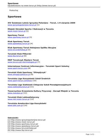 Sportowe Opublikowano na www.torun.pl (http://www.torun.pl) Posłuchaj Sportowe XIV Światowe Letnie Igrzyska Polonijne - Toruń, 1-9 sierpnia 2009 www.igrzyskapolonijne.torun.pl [1] Miejski Ośrodek Sportu i Rekreacji w Toruniu www.mosir.torun.pl [2] Sportowy Toruń www.sportowy.torun.pl [3] Klub Sportowy Toruń www.speedway.torun.pl [4] Klub Sportowy Toruń Hokejowa Spółka Akcyjna www.torunskihokej.pl [5] Toruński Klub Piłkarski www.tkp.torun.pl [6] MKP Toruńczyk Masters Toruń www.torunczyk.rtechnologies.pl [7] Internetowe Centrum Informacyjne - Toruński Sport Szkolny www.sport-torun.com [8] Toruński Klub Sportowy "Olimpijczyk" www.olimpijczyktorun.pl [9] Toruńska Liga Koszykówki Szkół Średnich www.sport-torun.com/kosz [10] Toruńska Liga Siatkówki Chłopców Szkół Ponadgimnazjalnych www.siatkowka.torun.pl [11] Towarzystwo Krzewienia Kultury Fizycznej - Zarząd Miejski w Toruniu www.maraton.pl [12] Toruński Klub Lekkoatletyczny www.mkl.mosir.torun.pl [13] Toruńska Amatorska Liga Koszykówki www.talk.com.pl [14] Odnośniki: [1] http://www.igrzyskapolonijne.torun.pl/ [2] http://www.mosir.torun.pl/ [3] http://www.sportowy.torun.pl/ [4] http://www.speedway.torun.pl/ [5] http://www.torunskihokej.pl/ [6] http://www.tkp.torun.pl/ Page 1 of 2 Sportowe Opublikowano na www.torun.pl (http://www.torun.pl) [7] http://www.torunczyk.rtechnologies.pl/ [8] http://www.sport-torun.com/ [9] http://www.olimpijczyktorun.pl/ [10] http://www.sport-torun.com/kosz [11] http://www.siatkowka.torun.pl/ [12] http://www.maraton.pl/ [13] http://www.mkl.mosir.torun.pl/ [14] http://www.talk.com.pl/ Page 2 of 2 Powered by TCPDF (www.tcpdf.org)