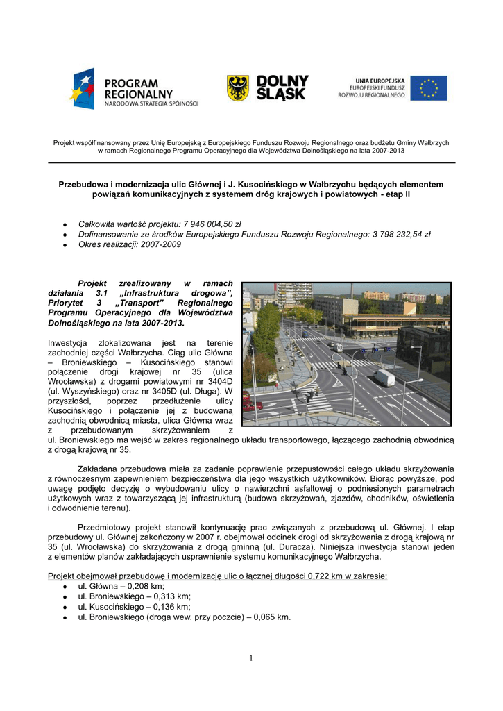 Projekt współfinansowany przez Unię Europejską z Europejskiego Funduszu Rozwoju Regionalnego oraz budżetu Gminy Wałbrzych w ramach Regionalnego Programu Operacyjnego dla Województwa Dolnośląskiego na lata 2007-2013 Przebudowa i modernizacja ulic Głównej i J. Kusocińskiego w Wałbrzychu będących elementem powiązań komunikacyjnych z systemem dróg krajowych i powiatowych - etap II Całkowita wartość projektu: 7 946 004,50 zł Dofinansowanie ze środków Europejskiego Funduszu Rozwoju Regionalnego: 3 798 232,54 zł Okres realizacji: 2007-2009 Projekt zrealizowany w ramach działania 3.1 „Infrastruktura drogowa”, Priorytet 3 „Transport” Regionalnego Programu Operacyjnego dla Województwa Dolnośląskiego na lata 2007-2013. Inwestycja zlokalizowana jest na terenie zachodniej części Wałbrzycha. Ciąg ulic Główna – Broniewskiego – Kusocińskiego stanowi połączenie drogi krajowej nr 35 (ulica Wrocławska) z drogami powiatowymi nr 3404D (ul. Wyszyńskiego) oraz nr 3405D (ul. Długa). W przyszłości, poprzez przedłużenie ulicy Kusocińskiego i połączenie jej z budowaną zachodnią obwodnicą miasta, ulica Główna wraz z przebudowanym skrzyżowaniem z ul. Broniewskiego ma wejść w zakres regionalnego układu transportowego, łączącego zachodnią obwodnicą z drogą krajową nr 35. Zakładana przebudowa miała za zadanie poprawienie przepustowości całego układu skrzyżowania z równoczesnym zapewnieniem bezpieczeństwa dla jego wszystkich użytkowników. Biorąc powyższe, pod uwagę podjęto decyzję o wybudowaniu ulicy o nawierzchni asfaltowej o podniesionych parametrach użytkowych wraz z towarzyszącą jej infrastrukturą (budowa skrzyżowań, zjazdów, chodników, oświetlenia i odwodnienie terenu). Przedmiotowy projekt stanowił kontynuację prac związanych z przebudową ul. Głównej. I etap przebudowy ul. Głównej zakończony w 2007 r. obejmował odcinek drogi od skrzyżowania z drogą krajową nr 35 (ul. Wrocławska) do skrzyżowania z drogą gminną (ul. Duracza). Niniejsza inwestycja stanowi jeden z elementów planów zakładających usprawnienie systemu komunikacyjnego Wałbrzycha. Projekt obejmował przebudowę i modernizację ulic o łącznej długości 0,722 km w zakresie: ul. Główna – 0,208 km; ul. Broniewskiego – 0,313 km; ul. Kusocińskiego – 0,136 km; ul. Broniewskiego (droga wew. przy poczcie) – 0,065 km. 1 Inwestycja obejmowała: przebudowę konstrukcji i nawierzchni jezdni; przebudowę chodników; przebudowę oświetlenia ulicznego; budowę nowej sygnalizacji świetnej przebudowę infrastruktury podziemnej (finansowana przez jej właścicieli). W ramach przedmiotowych prac przebudowano 2 skrzyżowania, zamontowano 14 urządzeń sterowania ruchem drogowym oraz wybudowano 6 systemów sygnalizacji ulicznej. Infrastruktura uwzględnia potrzeby osób niepełnosprawnych. Zastosowano kostkę z ostrzegawczą fakturą, odczytywaną przez osoby niedowidzące, sygnalizację dźwiękową oraz barierki ochronne. 2