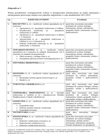 Załącznik nr 1 Wykaz przedmiotów wymaganych/do wyboru w postępowaniu rekrutacyjnym na studia stacjonarne i niestacjonarne pierwszego stopnia oraz jednolite magisterskie w roku akademickim 2011/2012. Lp. KIERUNEK STUDIOW Przedmioty 1. ROLNICTWO (s, n) – moŜliwość wyboru specjalności po 4 semestrze: • Agronomia (s, n) - specjalność realizowana w Lublinie • Kształtowanie środowiska (s) – specjalność realizowana w Lublinie • Agrobiznes (s, n) – specjalność realizowana w Lublinie i w Zamościu • Agroturystyka (s, n) – specjalność realizowana w Lublinie (s, n) i w Zamościu (s) • Ochrona środowiska rolniczego (s, n) – specjalność realizowana w Zamościu język obcy nowoŜytny oraz jeden przedmiot do wyboru: biologia, matematyka, chemia, informatyka, geografia, fizyka i astronomia, wiedza o społeczeństwie. 2. TOWAROZNAWSTWO (s, n) – moŜliwość wyboru specjalności po 4 semestrze na studiach stacjonarnych i po 6 semestrze na studiach niestacjonarnych: • Obrót towarowy i obsługa celna (s, n) • Zarządzanie jakością towarów konsumpcyjnych (s, n) język obcy nowoŜytny oraz jeden przedmiot do wyboru: biologia, matematyka, chemia, informatyka, geografia, fizyka i astronomia, wiedza o społeczeństwie. 3. INśYNIERIA ŚRODOWISKA (s, n) 4. język obcy nowoŜytny oraz jeden przedmiot do wyboru: biologia, matematyka, chemia, informatyka, geografia, fizyka i astronomia, wiedza o społeczeństwie. EKONOMIA (s, n) – moŜliwość wyboru specjalności po 2 język obcy nowoŜytny oraz jeden semestrze: przedmiot do wyboru: matematyka, geografia, wiedza o społeczeństwie, • Ekonomika systemu agroŜywnościowego (s, n) historia. • Handel (s, n) 5. TURYSTYKA I REKREACJA (s, n) 6. GOSPODARKA PRZESTRZENNA (s, n) - kierunek realizowany w Lublinie (s, n) i Zamiejscowym Ośrodku Dydaktycznym w Opolu Lubelskim (n). 7. LEŚNICTWO (s, n) – moŜliwość wyboru specjalności po 5 semestrze: • Gospodarka leśna • Ochrona zasobów leśnych i środowiska • Gospodarka łowiecka WETERYNARIA (s, nw) 8. 9. ZOOTECHNIKA (s, n) - moŜliwość wyboru specjalności po 4 semestrze: • Hodowla i uŜytkowanie zwierząt (s, n) • Hodowla koni i jeździectwo (s) • Hodowla i uŜytkowanie koni (n) język obcy nowoŜytny oraz jeden przedmiot do wyboru: biologia, chemia, geografia, wiedza o społeczeństwie, historia. język obcy nowoŜytny oraz jeden przedmiot do wyboru: biologia, matematyka, chemia, geografia, fizyka i astronomia, wiedza o społeczeństwie. język obcy nowoŜytny oraz jeden przedmiot do wyboru: biologia, matematyka, chemia, informatyka, geografia, fizyka i astronomia, wiedza o społeczeństwie. język obcy nowoŜytny, biologia, chemia. język obcy nowoŜytny oraz jeden przedmiot do wyboru: biologia, matematyka, chemia, fizyka i astronomia, informatyka, geografia Ponadto kandydatów na specjalność: 1/3 Uchwała nr 45/2009-2010 Senatu UP w Lublinie z dnia 7 maja 2010r. w sprawie zasad i trybu przyjmowania kandydatów na I rok studiów stacjonarnych i niestacjonarnych pierwszego i drugiego stopnia oraz jednolite magisterskie w UP w Lublinie w roku akademickim 2011-2012. • • 10. 11. 12. 13. 14. 15. 16. 17. hodowla koni i jeździectwo obowiązuje Hodowle amatorskie (s) Towaroznawstwo i przetwórstwo surowców sprawdzian podstawowych umiejętności jeździeckich: stęp, kłus). zwierzęcych (s) Doradztwo i rozwój obszarów wiejskich (s) Produkcja i marketing pasz przemysłowych (s) • • • OCHRONA ŚRODOWISKA (s, n)– moŜliwość wyboru specjalności po 4 semestrze: • Ochrona ekosystemów wodnych i torfowiskowych (s) • Ochrona i kształtowanie krajobrazu (s) • Ochrona zasobów faunistycznych (s) • ZagroŜenia środowiskowe (s) • Proekologiczne systemy produkcji Ŝywności (s) język obcy nowoŜytny oraz jeden przedmiot do wyboru: biologia, matematyka, chemia, fizyka i astronomia, informatyka, geografia, wiedza o społeczeństwie. BIOLOGIA (s, n) – kierunek realizowany w Lublinie i w Zamościu. W ramach kierunku realizowanego w Lublinie istnieje moŜliwość wyboru specjalności po 2 semestrze: • biologia stosowana (s,n) • specjalność nauczycielska – nauczanie biologii i chemii.(s) BEZPIECZEŃSTWO I HIGIENA PRACY (s, n) język obcy nowoŜytny oraz jeden przedmiot do wyboru: biologia, matematyka, chemia, fizyka i astronomia, informatyka, geografia. TECHNIKA ROLNICZA I LEŚNA (s, n) – moŜliwość wyboru specjalności po 4 semestrze: • Infrastruktura techniczna obszarów wiejskich (s, n) • Technika i infrastruktura przemysłu spoŜywczego(s, n) • Informatyka w inŜynierii rolniczej (s, n) • InŜynieria Ŝywności (s, n) • Technika motoryzacyjna i energetyka (s, n) • Odnawialne źródła energii i ekoenergetyka (s, n) ZARZĄDZANIE I INśYNIERIA PRODUKCJI (s) – moŜliwość wyboru specjalności po 4 semestrze: • Zarządzanie i inŜynieria rolnicza (s) • Zarządzanie i inŜynieria przetwórstwa spoŜywczego (s) język obcy nowoŜytny oraz jeden przedmiot do wyboru: matematyka, fizyka i astronomia chemia, informatyka, biologia, geografia. język obcy nowoŜytny oraz jeden przedmiot do wyboru: matematyka, fizyka i astronomia, chemia, informatyka, biologia, geografia. EDUKACJA TECHNICZNO – INFORMATYCZNA (s, n) – moŜliwość wyboru specjalności po 4 semestrze: język obcy nowoŜytny oraz jeden do wyboru: matematyka, fizyka i język obcy nowoŜytny oraz jeden przedmiot do wyboru: biologia, matematyka, chemia, fizyka i astronomia, informatyka. ARCHITEKTURA KRAJOBRAZU (s) – moŜliwość wyboru język obcy nowoŜytny oraz jeden specjalności po 4 semestrze: przedmiot do wyboru: biologia, matematyka, chemia, geografia, • Architektura parków i ogrodów (s) informatyka, fizyka i astronomia. • Architektura krajobrazu otwartego (s) Ponadto kandydatów obowiązuje egzamin praktyczny z rysunku odręcznego. OGRODNICTWO (s, n) – moŜliwość wyboru specjalności po język obcy nowoŜytny oraz jeden 4 semestrze: p
