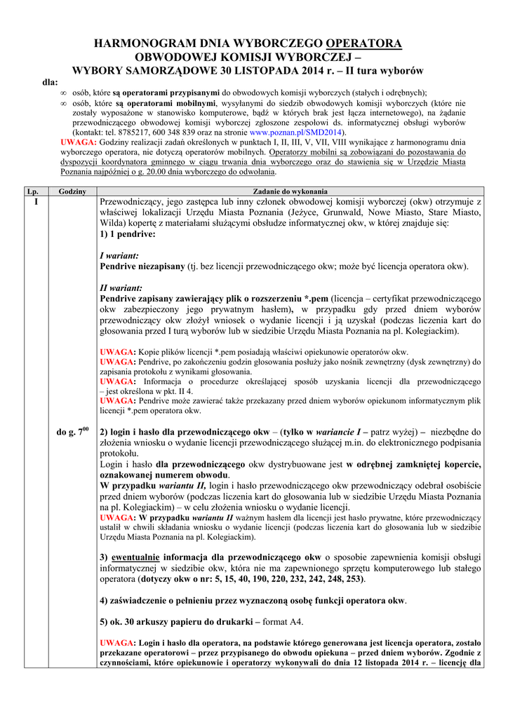 HARMONOGRAM DNIA WYBORCZEGO OPERATORA OBWODOWEJ KOMISJI WYBORCZEJ – WYBORY SAMORZĄDOWE 30 LISTOPADA 2014 r. – II tura wyborów dla: Lp. • osób, które są operatorami przypisanymi do obwodowych komisji wyborczych (stałych i odrębnych); • osób, które są operatorami mobilnymi, wysyłanymi do siedzib obwodowych komisji wyborczych (które nie zostały wyposaŜone w stanowisko komputerowe, bądź w których brak jest łącza internetowego), na Ŝądanie przewodniczącego obwodowej komisji wyborczej zgłoszone zespołowi ds. informatycznej obsługi wyborów (kontakt: tel. 8785217, 600 348 839 oraz na stronie www.poznan.pl/SMD2014). UWAGA: Godziny realizacji zadań określonych w punktach I, II, III, V, VII, VIII wynikające z harmonogramu dnia wyborczego operatora, nie dotyczą operatorów mobilnych. Operatorzy mobilni są zobowiązani do pozostawania do dyspozycji koordynatora gminnego w ciągu trwania dnia wyborczego oraz do stawienia się w Urzędzie Miasta Poznania najpóźniej o g. 20.00 dnia wyborczego do odwołania. Godziny Zadanie do wykonania Przewodniczący, jego zastępca lub inny członek obwodowej komisji wyborczej (okw) otrzymuje z właściwej lokalizacji Urzędu Miasta Poznania (JeŜyce, Grunwald, Nowe Miasto, Stare Miasto, Wilda) kopertę z materiałami słuŜącymi obsłudze informatycznej okw, w której znajduje się: 1) 1 pendrive: I I wariant: Pendrive niezapisany (tj. bez licencji przewodniczącego okw; moŜe być licencja operatora okw). II wariant: Pendrive zapisany zawierający plik o rozszerzeniu *.pem (licencja – certyfikat przewodniczącego okw zabezpieczony jego prywatnym hasłem), w przypadku gdy przed dniem wyborów przewodniczący okw złoŜył wniosek o wydanie licencji i ją uzyskał (podczas liczenia kart do głosowania przed I turą wyborów lub w siedzibie Urzędu Miasta Poznania na pl. Kolegiackim). UWAGA: Kopie plików licencji *.pem posiadają właściwi opiekunowie operatorów okw. UWAGA: Pendrive, po zakończeniu godzin głosowania posłuŜy jako nośnik zewnętrzny (dysk zewnętrzny) do zapisania protokołu z wynikami głosowania. UWAGA: Informacja o procedurze określającej sposób uzyskania licencji dla przewodniczącego – jest określona w pkt. II 4. UWAGA: Pendrive moŜe zawierać takŜe przekazany przed dniem wyborów opiekunom informatycznym plik licencji *.pem operatora okw. do g. 700 2) login i hasło dla przewodniczącego okw – (tylko w wariancie I – patrz wyŜej) – niezbędne do złoŜenia wniosku o wydanie licencji przewodniczącego słuŜącej m.in. do elektronicznego podpisania protokołu. Login i hasło dla przewodniczącego okw dystrybuowane jest w odrębnej zamkniętej kopercie, oznakowanej numerem obwodu. W przypadku wariantu II, login i hasło przewodniczącego okw przewodniczący odebrał osobiście przed dniem wyborów (podczas liczenia kart do głosowania lub w siedzibie Urzędu Miasta Poznania na pl. Kolegiackim) – w celu złoŜenia wniosku o wydanie licencji. UWAGA: W przypadku wariantu II waŜnym hasłem dla licencji jest hasło prywatne, które przewodniczący ustalił w chwili składania wniosku o wydanie licencji (podczas liczenia kart do głosowania lub w siedzibie Urzędu Miasta Poznania na pl. Kolegiackim). 3) ewentualnie informacja dla przewodniczącego okw o sposobie zapewnienia komisji obsługi informatycznej w siedzibie okw, która nie ma zapewnionego sprzętu komputerowego lub stałego operatora (dotyczy okw o nr: 5, 15, 40, 190, 220, 232, 242, 248, 253). 4) zaświadczenie o pełnieniu przez wyznaczoną osobę funkcji operatora okw. 5) ok. 30 arkuszy papieru do drukarki – format A4. UWAGA: Login i hasło dla operatora, na podstawie którego generowana jest licencja operatora, zostało przekazane operatorowi – przez przypisanego do obwodu opiekuna – przed dniem wyborów. Zgodnie z czynnościami, które opiekunowie i operatorzy wykonywali do dnia 12 listopada 2014 r. – licencję dla operatora naleŜało pobrać przed dniem wyborów i zapisać ją np. na nośnik zewnętrzny (pendrive) lub wysłać na własną pocztę email itp., aby następnie w dniu wyborów dokonać zaimportowania licencji z pliku *.pem (patrz okno Kalkulatora – Znajdź licencję na komputerze). UWAGA: Na stronie www.poznan.pl/SMD2014 (dla operatorów okw) w zakładce Pomoc techniczna znajdują się: - program Kalkulator Obwodowy (wersja aktualna – produkcyjna – na dzień wyborów; numer aktualnej wersji aplikacji zostanie podany najpóźniej w godzinach porannych w dniu wyborów na stronie www.poznan.pl/SMD2014); - instrukcja obsługi programu Kalkulator Obwodowy; - link do strony umoŜliwiającej pobranie aplikacji Framework, która jest niezbędna do zainstalowania Kalkulatora Obwodowego. II od g. 700 do g. 850 1) Operator włącza komputer i sprawdza, czy na komputerze zainstalowany jest program Kalkulator Obwodowy. JeŜeli na komputerze nie ma zainstalowanego Kalkulatora Obwodowego, to naleŜy ze strony www.poznan.pl/SMD2014 pobrać plik instalacyjny Kalkulatora Obwodowego. Po pobraniu, plik instalacyjny naleŜy uruchomić poprzez jego wskazanie i dwukrotne kliknięcie. Instalacji naleŜy dokonać zgodnie z instrukcją instalacji Kalkulatora Obwodowego dostępną na stronie www.poznan.pl/SMD2014. Procedurę instalacji/odinstalowania programu Kalkulator Obwodowy określa takŜe Instrukcja deinstalacji i instalacji Kalkulatora Obwodowego (pkt. IX). 2) JeŜeli na komputerze zainstalowana jest niewłaściwa wersja aplikacji Kalkulator Obwodowy (informacja o aktualnej wersji Kalkulatora Obwodowego będzie dostępna na stronie www.poznan.pl/SMD2014), operator dokonuje jej deinstalacji poprzez opcję dodaj/usuń programy lub poprzez opcję w Start/Programy/Kalkulator/Uninstall Kalkulator). Przed odinstalowaniem Kalkulatora Obwodowego naleŜy na pierwszym uruchomionym oknie Kalkulatora kliknąć przycisk Wyczyść dane tymczasowe (i ewentualnie usunąć z dysku C://…. w katalogu temp katalog o nazwie KBW). Nast