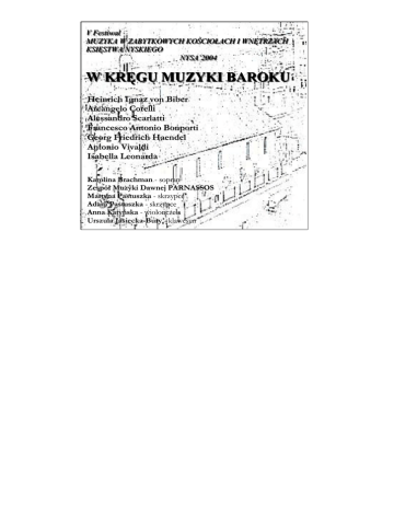 VV FFeessttiiw waall M U Z Y K MUZYKAA W W ZZAABBYYTTK KO OW WYYC CH HK KO OŚŚC CIIO OŁŁAAC CH H II W WN NĘĘTTRRZZAAC CH H K KSSIIĘĘSSTTW WAA N NYYSSK KIIEEG GO O N NYYSSAA’’22000044 W KRĘGU MUZYKI BAROKU Heinrich Ignaz von Biber Arcangelo Corelli Alessandro Scarlatti Francesco Antonio Bonporti Georg Friedrich Haendel Antonio Vivaldi Isabella Leonarda Karolina Brachman - sopran Zespół Muzyki Dawnej PARNASSOS Martyna Pastuszka - skrzypce Adam Pastuszka - skrzypce Anna Katyńska - wiolonczela Urszula Jasiecka-Bury - klawesyn
