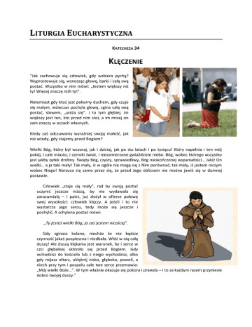 LITURGIA EUCHARYSTYCZNA KATECHEZA 34 KLĘCZENIE “Jak zachowuje się człowiek, gdy wzbiera pychą? Wyprostowuje się, wznosząc głowę, barki i całą swą postać. Wszystko w nim mówi: „Jestem większy niż ty! Więcej znaczę niźli ty!”. Natomiast gdy ktoś jest pokorny duchem, gdy czuje się małym, wówczas pochyla głowę, zgina całą swą postać, słowem, „uniża się”. I to tym głębiej, im większy jest ten, kto przed nim stoi, a im mniej on sam znaczy w oczach własnych. Kiedy zaś odczuwamy wyraźniej swoją małość, jak nie wtedy, gdy stajemy przed Bogiem? Wielki Bóg, który był wczoraj, jak i dzisiaj, jak po stu latach i po tysiącu! Który napełnia i ten mój pokój, i całe miasto, i szeroki świat, i niezamierzone gwiaździste niebo. Bóg, wobec którego wszystko jest jakby pyłek drobny. Święty Bóg, czysty, sprawiedliwy, Bóg nieskończonej wspaniałości… Jakiż On wielki… a ja taki mały! Tak mały, iż w ogóle nie mogę się z Nim porównać; tak mały, iż jestem niczym wobec Niego! Narzuca się samo przez się, że przed Jego obliczem nie można jawić się w dumnej postawie. Człowiek „staje się mały”, rad by swoją postać uczynić jeszcze niższą, by nie wydawała się zarozumiałą – i patrz, już złożył w ofierze połowę swej wysokości: człowiek klęczy. A jeżeli i to nie wystarcza jego sercu, tedy może się jeszcze i pochylić. A schylona postać mówi: „Ty jesteś wielki Bóg, ja zaś jestem nicością”. Gdy zginasz kolano, niechże to nie będzie czynność jakaś pospieszna i niedbała. Włóż w nią całą duszę! Ale duszą klękania jest warunek, by i serce w czci głębokiej skłoniło się przed Bogiem. Gdy wchodzisz do kościoła lub z niego wychodzisz, albo gdy mijasz ołtarz, uklęknij nisko, głęboko, powoli, a niech przy tym i pospołu całe twe serce przemawia: „Mój wielki Boże…”. W tym właśnie okazuje się pokora i prawda – i to za każdym razem przyniesie dobro twojej duszy.”