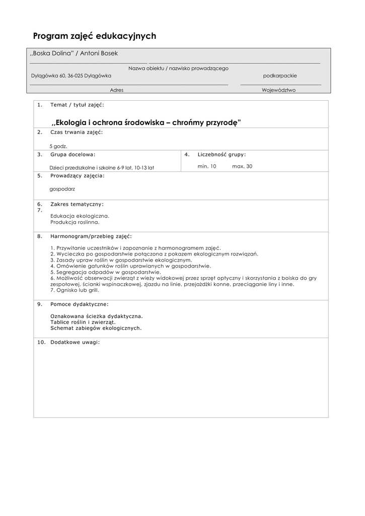 Program zajęć edukacyjnych ,,Boska Dolina” / Antoni Bosek ________________________________________________ ______________________________________________________________________ Nazwa obiektu / nazwisko prowadzącego Dylągówka 60, 36-025 Dylągówka podkarpackie _________________________________________________________________________________ _________________________________ Adres Województwo 1. Temat / tytuł zajęć: 2. Czas trwania zajęć: ,,Ekologia i ochrona środowiska – chrońmy przyrodę” 5 godz. 3. Grupa docelowa: Dzieci przedszkolne i szkolne 6-9 lat, 10-13 lat 5. 4. Liczebność grupy: min. 10 max. 30 Prowadzący zajęcia: gospodarz 6. 7. Zakres tematyczny: 8. Harmonogram/przebieg zajęć: Edukacja ekologiczna. Produkcja roslinna. 1. Przywitanie uczestników i zapoznanie z harmonogramem zajęć. 2. Wycieczka po gospodarstwie połączona z pokazem ekologicznym rozwiązań. 3. Zasady upraw roślin w gospodarstwie ekologicznym. 4. Omówienie gatunków roślin uprawianych w gospodarstwie. 5. Segregacja odpadów w gospodarstwie. 6. Możliwość obserwacji zwierząt z wieży widokowej przez sprzęt optyczny i skorzystania z boiska do gry zespołowej, ścianki wspinaczkowej, zjazdu na linie, przejażdżki konne, przeciąganie liny i inne. 7. Ognisko lub grill. 9. Pomoce dydaktyczne: Oznakowana ścieżka dydaktyczna. Tablice roślin i zwierząt. Schemat zabiegów ekologicznych. 10. Dodatkowe uwagi:
