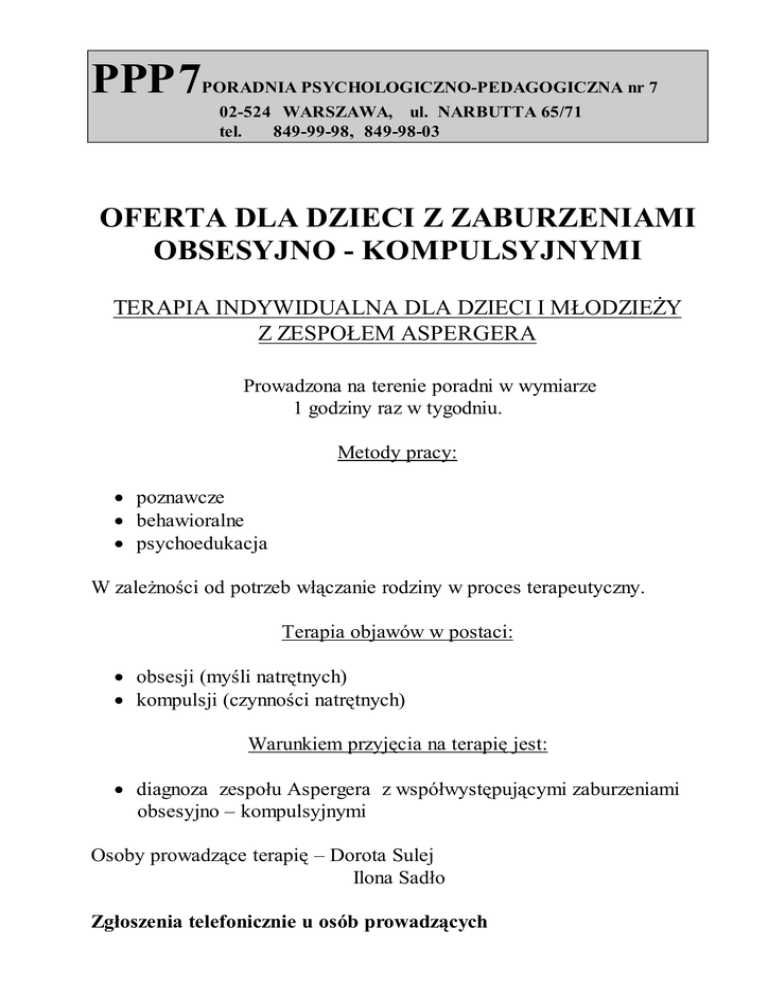 PPP7 PORADNIA PSYCHOLOGICZNO-PEDAGOGICZNA nr 7 02-524 WARSZAWA, ul. NARBUTTA 65/71 tel. 849-99-98, 849-98-03 OFERTA DLA DZIECI Z ZABURZENIAMI OBSESYJNO - KOMPULSYJNYMI TERAPIA INDYWIDUALNA DLA DZIECI I MŁODZIEŻY Z ZESPOŁEM ASPERGERA Prowadzona na terenie poradni w wymiarze 1 godziny raz w tygodniu. Metody pracy: · poznawcze · behawioralne · psychoedukacja W zależności od potrzeb włączanie rodziny w proces terapeutyczny. Terapia objawów w postaci: · obsesji (myśli natrętnych) · kompulsji (czynności natrętnych) Warunkiem przyjęcia na terapię jest: · diagnoza zespołu Aspergera z współwystępującymi zaburzeniami obsesyjno – kompulsyjnymi Osoby prowadzące terapię – Dorota Sulej Ilona Sadło Zgłoszenia telefonicznie u osób prowadzących