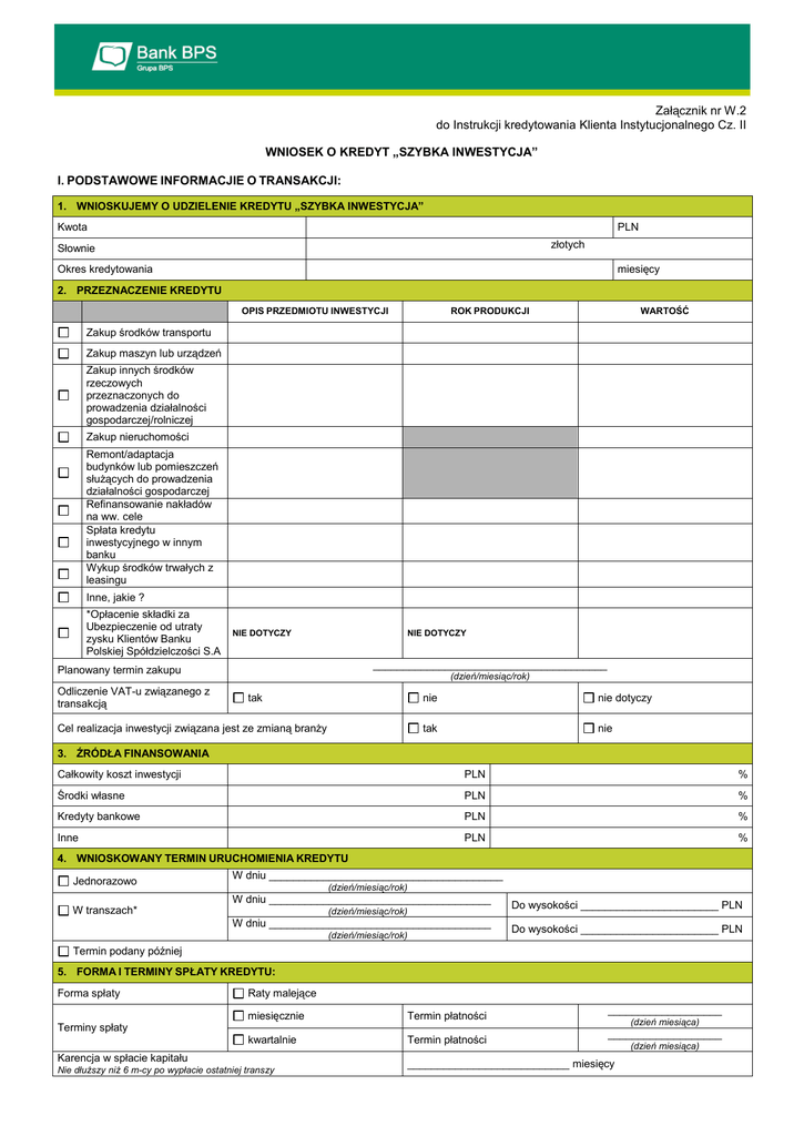 Załącznik nr W.2 do Instrukcji kredytowania Klienta Instytucjonalnego Cz. II WNIOSEK O KREDYT „SZYBKA INWESTYCJA” I. PODSTAWOWE INFORMACJIE O TRANSAKCJI: 1. WNIOSKUJEMY O UDZIELENIE KREDYTU „SZYBKA INWESTYCJA” Kwota PLN złotych Słownie Okres kredytowania miesięcy 2. PRZEZNACZENIE KREDYTU OPIS PRZEDMIOTU INWESTYCJI WARTOŚĆ ROK PRODUKCJI Zakup środków transportu Zakup maszyn lub urządzeń Zakup innych środków rzeczowych przeznaczonych do prowadzenia działalności gospodarczej/rolniczej Zakup nieruchomości Remont/adaptacja budynków lub pomieszczeń służących do prowadzenia działalności gospodarczej Refinansowanie nakładów na ww. cele Spłata kredytu inwestycyjnego w innym banku Wykup środków trwałych z leasingu Inne, jakie ? *Opłacenie składki za Ubezpieczenie od utraty zysku Klientów Banku Polskiej Spółdzielczości S.A NIE DOTYCZY NIE DOTYCZY _______________________________________ Planowany termin zakupu Odliczenie VAT-u związanego z transakcją (dzień/miesiąc/rok) tak Cel realizacja inwestycji związana jest ze zmianą branży nie nie dotyczy tak nie 3. ŹRÓDŁA FINANSOWANIA Całkowity koszt inwestycji PLN % Środki własne PLN % Kredyty bankowe PLN % Inne PLN % 4. WNIOSKOWANY TERMIN URUCHOMIENIA KREDYTU Jednorazowo W dniu _______________________________________ (dzień/miesiąc/rok) W dniu _____________________________________ W transzach* (dzień/miesiąc/rok) W dniu _____________________________________ (dzień/miesiąc/rok) Do wysokości _______________________ PLN Do wysokości _______________________ PLN Termin podany później 5. FORMA I TERMINY SPŁATY KREDYTU: Forma spłaty Terminy spłaty Raty malejące miesięcznie kwartalnie Karencja w spłacie kapitału Nie dłuższy niż 6 m-cy po wypłacie ostatniej transzy Termin płatności ___________________ Termin płatności ___________________ (dzień miesiąca) ___________________________ miesięcy (dzień miesiąca) Rachunek w Banku przeznaczony do spłaty kredytu: pomocniczy bieżący Numer rachunku 6. PROPONOWANE ZABEZPIECZENIE Rodzaj zabezpieczenia Opis zabezpieczenia Wartość zabezpieczenia (w PLN) Wartość określona na podstawie: Zastaw rejestrowy Hipoteka Pełnomocnictwo do dysponowania rachunkiem Cesja praw z polisy ubezpieczenia Weksel własny in blanco Inne Łączna wartość zabezpieczeń II. INFORMACJE O WNIOSKODAWCY 1. WNIOSKODAWCA Nazwa Siedziba / Adres REGON NIP Telefon E-mail OSOBA UPOWAŻNIONA DO KONTAKTÓW Z BANKIEM Imię i nazwisko Telefon GŁÓWNI UDZIAŁOWCY FIRMY Imię i Nazwisko / Nazwa Wielkość posiadanych udziałów (%) POWIĄZANIA KAPITAŁOWE Z INNYMI PODMIOTAMI: Imię i nazwisko / Nazwa 2. Nr dowodu tożsamości / PESEL / REGON / NIP Rodzaj powiązania INFORMACJE O PROWADZONEJ DZIAŁALNOŚCI: Forma prowadzonej działalności Okres prowadzenia działalności: Księgi rachunkowe Podatkowa książka przychodów i rozchodów Ryczałt od przychodów ewidencjonowanych Karta podatkowa _____________________________ miesięcy Rodzaj prowadzonej działalności nie tak ___________________________________________________ Działalność podlega sezonowości na czym polega ______________________________________________________ III. Oświadczenia Wnioskodawcy 1) Oświadczam/y, że posiadam/y nie posiadam/y* zaległości wobec Zakładu Ubezpieczeń Społecznych i Urzędu Skarbowego objętych / nie objętych ugodą*. 2) Oświadczam/y, że posiadamy/ nie posiadamy* zaległości wobec innych banków lub towarzystw leasingowych. 3) Oświadczam/y, że wobec nas toczą się/ nie toczą się* lub grożą / nie grożą* nam postępowania sądowe, administracyjne i inne mogące mieć wpływ na prowadzoną działalność lub zdolność do spłaty zaciągniętych zobowiązań. 4) Oświadczam/y, że została/ nie została* ogłoszona upadłość lub został / nie został* rozpoczęty proces likwidacji lub naprawczego lub zawieszenia działalności firmy. Strona 2 z 5 postępowania 5) Oświadczamy, że w okresie ostatnich 12 m-cy zostały / nie zostały* wystawione lub wygasły / nie wygasły* przekraczającej 1.000 PLN. tytuły egzekucyjne w kwocie 6) Oświadczam, że pozostaję / nie pozostaję* we wspólności majątkowej ze współmałżonkiem/współmałżonką** 7) Oświadczam/y, że jesteśmy/ nie jesteśmy* akcjonariuszami Banku BPS S.A. 8) Oświadczam/y, że następujące podmioty lub osoby powiązane, organizacyjnie, personalnie są / nie są* akcjonariuszami Banku BPS S.A. lub osobami zajmującymi w Banku kierownicze stanowiska lub funkcje w radzie nadzorczej lub w zarządzie Banku. 9) Oświadczam/y pod rygorem odpowiedzialności karnej przewidzianej w art. 297 § 1 Kodeksu karnego, że informacje podane w tym wniosku są zgodne ze stanem faktycznym. IV. Zgody Wnioskodawcy § 1. UBEZPIECZENIE OD UTRATY ZYSKU KLIENTÓW BANKU POLSKIEJ SPÓŁDZIELCZOŚCI S.A. (UMOWA UBEZPIECZENIA) Na podstawie art. 104 ust. 3 ustawy z dnia 29 sierpnia 1997 roku Prawo bankowe (tekst jednolity Dz. U. z 2015 roku, poz. 128), upoważniam Bank BPS S.A. do przekazania Towarzystwu Ubezpieczeń Europa S.A. z siedzibą we Wrocławiu informacji objętych tajemnicą bankową, dotyczących złożonego przeze mnie w Banku BPS S.A. wniosku kredytowego lub zawartej przeze mnie z Bankiem BPS S.A. Umowy kredytu, w zakresie niezbędnym do objęcia mnie ochroną ubezpieczeniową i prawidłowego wykonywania postanowień Umowy Ubezpieczenia. Wyrażam zgodę Nie wyrażam zgody Wyrażam zgodę na zawarcie Umowy Ubezpieczenia i objęcie mnie ochroną ubezpieczeniową przez Towarzystwo Ubezpieczeń Europa S.A. na zasadach określonych w ”Ogólnych warunkach ubezpieczenia od utraty zysku Klientów Banku Polskiej Spółdzielczości S.A.” udostępnionych w placówkach Banku BPS S.A. oraz oświadczam, że „Ogólne warunki ubezpieczenia od utraty zysku Klientów Banku Polskiej Spółdzielczości S.A.” oraz Karta Produktu Ubezpieczeniowego zostały mi doręczone i że się z nimi zapoznałem/am. wnioskuję o opłacenie
