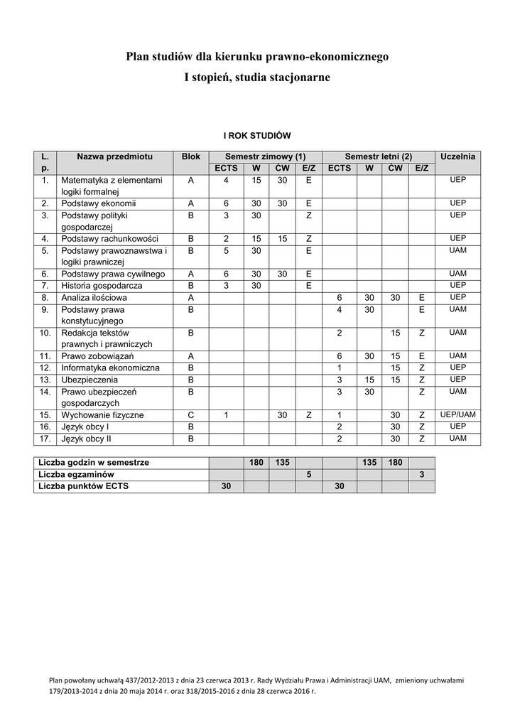 Plan studiów dla kierunku prawno-ekonomicznego I stopień, studia stacjonarne I ROK STUDIÓW L. p. 1. 2. 3. 4. 5. 6. 7. 8. 9. 10. 11. 12. 13. 14. 15. 16. 17. Nazwa przedmiotu Blok Matematyka z elementami logiki formalnej Podstawy ekonomii Podstawy polityki gospodarczej Podstawy rachunkowości Podstawy prawoznawstwa i logiki prawniczej Podstawy prawa cywilnego Historia gospodarcza Analiza ilościowa Podstawy prawa konstytucyjnego Redakcja tekstów prawnych i prawniczych Prawo zobowiązań Informatyka ekonomiczna Ubezpieczenia Prawo ubezpieczeń gospodarczych Wychowanie fizyczne Język obcy I Język obcy II A Liczba godzin w semestrze Liczba egzaminów Liczba punktów ECTS Semestr zimowy (1) ECTS W ĆW E/Z 4 15 30 E A B 6 3 30 30 30 B B 2 5 15 30 15 A B A B 6 3 30 30 30 Semestr letni (2) ECTS W ĆW E/Z UEP E Z UEP Z E UEP UEP UAM UAM E E UEP 6 4 B 2 A B B B 6 1 3 3 C B B 1 30 180 Z 30 30 30 15 30 1 2 2 135 30 UEP E E UAM 15 Z UAM 15 15 15 E Z Z Z UAM Z Z Z UEP/UAM 30 30 30 135 5 30 Uczelnia UEP UEP UAM UEP UAM 180 3 30 Plan powołany uchwałą 437/2012-2013 z dnia 23 czerwca 2013 r. Rady Wydziału Prawa i Administracji UAM, zmieniony uchwałami 179/2013-2014 z dnia 20 maja 2014 r. oraz 318/2015-2016 z dnia 28 czerwca 2016 r. II ROK STUDIÓW L. p. 1. 2. 3. 4. 5. 6. 7. 8. 9. 10. 11. 12. 13. 14. 15. 16. Nazwa przedmiotu Podejmowanie decyzji w warunkach niepewności Podstawy przedsiębiorczości Socjologia Prawo karne gospodarcze Prawo podatkowe Podstawy finansów Ekonomiczna i prawna teoria własności Podstawy postępowania cywilnego Podstawy prawa administracyjnego Podstawy postępowania administracyjnego Przedmiot do wyboru I Przedmiot do wyboru I Przedmiot do wyboru II Przedmiot do wyboru II Język obcy I Język obcy II Liczba godzin w semestrze Liczba egzaminów Liczba punktów ECTS Blok B Semestr zimowy (3) ECTS W ĆW E/Z 3 30 Z Semestr letni (4) ECTS W ĆW E/Z Uczelnia UEP/ UAM B 6 30 30 E UEP A B A B B 3 3 5 30 15 30 15 15 Z Z E UAM UEP UAM 3 3 15 30 15 A 3 30 A 2 A B B B B B B 3 3 30 Z 30 2 2 Z 30 30 195 Z Z UEP /UAM 15 E UAM 15 15 Z UAM 3 15 15 E UAM 3 3 3 3 2 2 30 30 30 30 UEP 30 30 Z Z Z Z Z Z 120 225 2 30 UEP Z E UEP UAM UAM UEP UAM 120 3 30 Blok B – przedmioty do wyboru: I – grupa przedmiotów ekonomicznych II – grupa przedmiotów prawniczych Plan powołany uchwałą 437/2012-2013 z dnia 23 czerwca 2013 r. Rady Wydziału Prawa i Administracji UAM, zmieniony uchwałami 179/2013-2014 z dnia 20 maja 2014 r. oraz 318/2015-2016 z dnia 28 czerwca 2016 r. III ROK STUDIÓW L. p. 1. 2. 3. 4. 5. 6. 7. 8. 9. 10. 11. 12. 13. 14. 15. 16. 17. 18. Nazwa przedmiotu Blok Finanse przedsiębiorstw Ekonomiczna i prawna teoria kontraktów Regulacja prawna stosunku pracy Publiczne prawo gospodarcze Prawo handlowe Prawo ochrony środowiska Zabezpieczenie społeczne Rynki kapitałowe i finansowe Międzynarodowe stosunki gospodarcze Ekonomiczna i prawna teoria procesu sądowego Przedmiot do wyboru I (w języku obcym* i polskim) Przedmiot do wyboru I Przedmiot do wyboru II Przedmiot do wyboru II Przedmiot do wyboru II Język obcy I Język obcy II Seminarium dyplomowe B B Liczba godzin w semestrze Liczba egzaminów Liczba punktów ECTS B Semestr zimowy (5) ECTS W ĆW E/Z 3 15 15 E 3 30 Z 4 30 15 UEP/ UAM UAM 3 3 2 30 30 15 30 UAM Z E UEP 15 Z UEP 3 15 E UEP/ UAM 3 30 Z UEP 3 30 Z UEP 3 3 30 30 Z Z 15 30 B 1 B B B B B B B C 3 30* Z 30 2 2 5 195 E E Z UEP UAM UAM UAM UEP UAM 5 135 30 225 5 30 15 Z 30 30 30 UAM UAM 3 3 3* E E Z B B D**(B) Uczelnia UEP E B A B Semestr letni (6) ECTS W ĆW E/Z Z UEP/ UAM 45 3 30 * Przedmiot do wyboru w języku obcym obowiązkowy dla studentów rekrutowanych na UEP. Studenci przyjmowani na UAM wybierają równolegle przedmiot w języku polskim lub języku obcym. ** Przedmiot wykładany w języku obcym, kwalifikowany godzinowo do bloku B. Plan powołany uchwałą 437/2012-2013 z dnia 23 czerwca 2013 r. Rady Wydziału Prawa i Administracji UAM, zmieniony uchwałami 179/2013-2014 z dnia 20 maja 2014 r. oraz 318/2015-2016 z dnia 28 czerwca 2016 r. Blok B – grupa przedmiotów do wyboru (I) Semestr 3 (30/0, 3 ECTS) 1. Polityka rynku pracy 2. Przedsiębiorstwo jako klient banku 3. Strategia zrównoważonego rozwoju Semestr 4 (30/0, 3 ECTS) 1. Europejskie systemy polityczne 2. Założenie i prowadzenie własnej firmy 3. Polityka innowacyjna Semestr 5 (30/0, 3 ECTS) a) Studenci UEP – w języku obcym język angielski 1. Banking Systems in Poland and CEECs 2. Human and Social Capital 3. Tax systems in the EU member states 4. Monetary Economics 5. Labour market and gender inequalities 6. Employment and Migration in Europe 7. Legal Issues in Public Relations 8. Private Asset and Wealth Management 9. Methods and Techniques of Decision Making in Business 10. The fundamentals of Risk and Insurance język niemiecki 1. Soziale Sicherung in der EU język rosyjski 1. Коммуникация с элементами русской деловой корреспонденции b) Studenci UAM – w języku polskim 1. Autoprezentacja i wystąpienia publiczne 2. Podmioty, instytucje i mechanizmy gospodarki rynkowej 3. Ekonomia szczęścia 4. Globalizacja 5. Techniki negocjacji 6. Pomiar poziomu życia ludności w państwach Unii Europejskiej 7. Związki ubezpieczeń z instytucjami finansowymi 8. Interakcje systemów politycznych i gospodarczych Plan powołany uchwałą 437/2012-2013 z dnia 23 czerwca 2013 r. Rady Wydziału Prawa i Administracji UAM, zmieniony uchwałami 179/2013-2014 z dnia 20 maja 2014 r. oraz 318/2015-2016 z dnia 28 czerwca 2016 r. Semestr 6 (30/0, 3 ECTS) 1. Współpraca przedsiębiorstw z bankiem 2. Psychologia w biznesie 3. Zarządzanie projektem 4. Partnerstwo publiczno-prywatne 5. Analizy wielowymiarowe w gospodarce żywnościowej 6. Gospodarka publiczna 7. Inwestycje alternatywne Blok B – grupa przedmiotów do wyboru (II) Semestr 3 (30/0, 3 ECTS) 1. Prawo i polityka samorządowa 2. Międzynarodowe prawo podatkowe 3. Prawo upadłościowe i restrukturyzacyjne 4. Teo